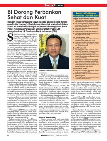56 BERITAINDONESIA, 2 November 2006BERITA EKONOMIBI Dorong PerbankanSehat dan KuatDengan tetap berpegang teguh kepada prinsip kehati-hatian(prudential banking), Bank Indonesia untuk kedua kali dalamtahun ini menelurkan kebijakan bernada kelonggaran. PadaPaket Kebijakan Perbankan Oktober 2006 (Pakto), BImengeluarkan 14 Peraturan Bank Indonesia (PBI).ebelumnya pada Paket KebijakanJanuari 2006 (Pakjan) BI menyeragamkan klasifikasi untuk penurunan bobot risiko kreditUMKM, dan perhitungan aktiva tertimbang menurut Resiko (ATMR).Relaksasi terbaru kali ini dimaksudkanBI untuk semakin mendorong fungsiintermediasi perbankan, serta menciptakan industri perbankan yang sehatdan kuat. Rendahnya ekspansi kreditsejak awal 2006 merupakan alasan laindari BI. Kelonggaran diberikan setelahsebelumnya didahului dengan melakukansimulasi, dan semuanya tidak keluar darikoridor kehati-hatian.Yang menarik dalam Pakto 2006, limadiantara ke-14 PBI menyangkut perbankan syariah. Hal ini menimbulkan optimisme, perbankan syariah diperkirakanakan mengalami booming kedua (secondpeak up) di tahun 2007 , seperti di tahun2004, setelah selama 2005 dan 2006berjalan agak mandeg. Dua PBI lainnyaterkait dengan bank umum, empat PBIterkait BPR, dan tiga PBI sesuai visiArsitektur Perbankan Indonesia (API).Gubernur Bank Indonesia BurhanuddinAbdullah yang mengumumkan Pakto2006 di Jakarta, Kamis (5/10), mengatakan dengan relaksasi industri perbankansudah saatnya berupaya mengoptimalkanfungsinya dalam menyalurkan pembiayaan kepada sektor riil, dan mengurangipenyaluran dana ke instrumen keuangan.Terkait dengan bank umum, kali ini BImemberikan kelonggaran baru perihalketentuan batas maksimum pemberiankredit (BMPK). Kelonggaran sebelumnyapernah diberikan pada PBI No. 7/3/PBI/2005.“Pelonggaran BMPK ini mencakup halhal yang sangat signifikan untuk memberikan ruang gerak dan keleluasaan bagiperbankan dalam menyalurkan pembiayaan,” kata Burhanuddin.Pada ketentuan terbaru, Pakto BI mendefinisikan ulang pengertian pihak-pihakyang terkait dengan bank. Yang dimaksudpihak terkait adalah, badan usaha yang50% atau lebih komisaris dan direksinya,juga menjadi komisaris, direksi, dan ataupejabat eksekutif pada perusahaan yangbertindak sebagai pengendali perusahaananak bank.Pihak terkait juga menyangkut perusahaan lain yang ada hubungan keluarga,hingga derajat kedua, baik horizontalmaupun vertikal, dengan pengendalibank, komisaris, direksi, dan pejabateksekutif bank.Sukatmo Padmosukarso, Direktur PTBank Internasional Indonesia Tbk (BII)menjawab pertanyaan Berita Indonesiamengatakan, pihaknya masih mempelajari detil ke-14 paket kebijakan terbaru BI.Tentang PBI yang mengatur single presence policy, misalnya, Sukatmo mengatakan tidak ada yang mengejutkan karenasudah disosialisasikan dengan baik.“Cuma kita harus menunggu aturandetilnya PBI mengenai related party dangovernance, cukup maju, dan perubahannya dari aturan sebelumnya telahcukup menampung aspirasi perbankan.Yang lainnya masih kami pelajari dulu”jelas Sukatmo Padmosukarso.Insentif Bank MergerKhusus kepada bank-bank yang inginmerger, BI memberikan kelonggaransementara atas kewajiban pemenuhangiro wajib minimum (GWM) dalam rupiah, dan perpanjangan jangka waktupenyelesaian pelampauan BMPK.Pelonggaran GWM hanya 1%, danbersifat sementara, selama 12 bulan.Jangka waktu pelampauan BMPK akibatmerger diberikan selama 24 bulan.BI juga akan mengganti sebagian (50%)biaya konsultan dari pelaksanaan duedeligence untuk bank yang merger. Nilaipenggantian maksimum Rp 1 miliar, bilamelebihi ditanggung sendiri oleh banknya.Insentif lain, BI memberikan kemudahan pemberian izin menjadi bankdevisa, dan kemudahan dalam pemberianizin pembukaan kantor cabang. Insentifperpajakan untuk saat ini masih dalampembahasan antara BI dengan pemerintah.Dalam hal lain BI akan memberikanperlakuan khusus terhadap kredit didaerah tertentu yang terkena bencanaalam. Dan tentang bank perkreditanrakyat (BPR), BI akan menyempurnakanperhitungan modal BPR sesuai best practice permodalan bank, baik itu modal intimaupun modal pelengkap. BI juga menurunkan bobot resiko kredit usaha mikrodan kecil, kredit kepada pensiunan, danpembiayaan perumahan (KPR).“PBI ini akan memberikan ruang gerak lebih besar bagi BPR,” urai Gubernur BI. HTSPaket 14 KebijakanPerbankan Oktober 2006Lima PBI Terkait Perbankan Syariahfl PBI tentang Penyesuaian ketentuan penilaiankualitas aktiva bank umum berdasarkan syariah.fl PBI tentang Perubahan ketentuan tentangperhitungan financing deposit ratio (FDR)dalam giro wajib minimum.fl PBI tentang Perubahan ketentuan permodalan (KPMM) BPRS.fl PBI tentang Perubahan kualitas aktiva BPRS.fl PBI tentang Relaksasi pengembangan usahadan jangkauan kantor BPRS.Dua PBI Terkait Bank Umumfl PBI tentang Ketentuan batas maksimumpemberian kredit (BMPK) bank umum.fl PBI tentang Landasan atas perlakuan khususbidang perbankan bagi nasabah-nasabahbank di daerah bencana.Empat PBI Terkait BPRfl PBI tentang Perubahan ketentuan permodalan BPR, antara lain mengubah bobotresiko kredit dalam perhitungan ATMR.fl PBI tentang Ketentuan tentang kualitas aktivaproduktif dan penyisihan penghapusan aktivaproduktif (KAP/PPAP).fl PBI tentang Perubahan laporan keuangan tahunan dan laporan keuangan publikasi BPR.fl PBI tentang Pengaturan kelembagaan BPR,seperti syarat pembukaan kantor cabang danrelaksasi kualifikasi calon direktur.Tiga PBI Sesuai Visi APIfl PBI tentang Kebijakan kepemilikian tunggal(single presence policy/SPP).fl PBI tentang Insentif kepada bank-bank yangmelakukan merger.fl PBI tentang Penyempurnaan ketentuan goodcorporate governance (GCG).Sukatmo Padmosukarso.