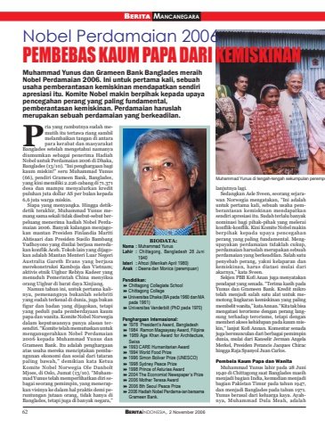 62 BERITAINDONESIA, 2 November 2006ria yang rambutnya sudah memutih itu tertawa riang sambilmelambaikan tangan di antarapara kerabat dan masyarakatBanglades setelah mengetahui namanyadiumumkan sebagai penerima HadiahNobel untuk Perdamaian 2006 di Dhaka,Banglades (13/10). “Ini penghargaan bagikaum miskin!” seru Muhammad Yunus(66), pendiri Grameen Bank, Banglades,yang kini memiliki 2.226 cabang di 71.371desa dan mampu menyalurkan kreditpuluhan juta dollar AS per bulan kepada6,6 juta warga miskin.Siapa yang menyangka. Hingga detikdetik terakhir, Muhammad Yunus memang sama sekali tidak disebut-sebut berpeluang menerima hadiah Nobel Perdamaian 2006. Banyak kalangan menjagokan mantan Presiden Finlandia MarttiAhtisaari dan Presiden Susilo BambangYudhoyono yang dinilai berjasa meredakan konflik Aceh. Tokoh lain yang dijagokan adalah Mantan Menteri Luar NegeriAustralia Gareth Evans yang berjasamerekonstruksi Kamboja dan Vietnam;aktivis etnik Uighur Rebiya Kadeer yangmenuduh Pemerintah China menyiksaorang Uighur di barat daya Xinjiang.Namun tahun ini, untuk pertama kalinya, pemenangnya bukanlah selebritiyang sudah terkenal di dunia, juga bukanfigur dan badan yang dijagokan, tetapiyang peduli pada pemberdayaan kaumpapa dan wanita. Komite Nobel Norwegiadalam keputusannya punya alasan tersendiri. “Komite telah memutuskan untukmenganugerahkan Nobel Perdamaian2006 kepada Muhammad Yunus danGrameen Bank. Itu adalah penghargaanatas usaha mereka menciptakan pembangunan ekonomi dan sosial dari tataranpaling bawah,” demikian kata KetuaKomite Nobel Norwegia Ole DanboltMjoes, di Oslo, Jumat (13/10). “Muhammad Yunus telah memperlihatkan diri sebagai seorang pemimpin, yang menerapkan visinya ke dalam hal praktis demi peruntungan jutaan orang, tidak hanya diBanglades, tetapi juga di banyak negara,”BERITA MANCANEGARAlanjutnya lagi.Sedangkan Asle Sveen, seorang sejarawan Norwegia mengatakan, “Ini adalahuntuk pertama kali, sebuah usaha pemberantasan kemiskinan mendapatkansendiri apresiasi itu. Sudah terlalu banyaknominasi bagi pihak-pihak yang meleraikonflik-konflik. Kini Komite Nobel makinberpihak kepada upaya pencegahanperang yang paling fundamental. Mengupayakan perdamaian tidaklah cukup,perdamaian haruslah merupakan sebuahperdamaian yang berkeadilan. Salah satupenyebab perang, yakni kelaparan dankemiskinan, harus diatasi mulai dariakarnya,” kata Sveen.Sekjen PBB Kofi Anan juga menyatakanpendapat yang senada. “Terima kasih padaYunus dan Grameen Bank. Kredit mikrotelah menjadi salah satu alat untuk memotong lingkaran kemiskinan yang palingmembelit wanita,” kata Annan. “Kita tak bisamengatasi terorisme dengan perang langsung terhadap terorisme, tetapi denganmemberi akses kehidupan pada kaum miskin,” lanjut Kofi Annan. Komentar senadajuga bermunculan dari berbagai pemimpindunia, mulai dari Kanselir Jerman AngelaMerkel, Presiden Perancis Jacques Chirachingga Raja Spanyol Juan Carlos.Pembela Kaum Papa dan WanitaMuhammad Yunus lahir pada 28 Juni1940 di Chittagong saat Banglades masihmenjadi bagian India, kemudian menjadibagian Pakistan Timur pada tahun 1947,dan menjadi Banglades pada tahun 1971.Yunus berasal dari keluarga kaya. Ayahnya, Muhammad Dula Meah, adalahBIODATA:Nama : Muhammad YunusLahir : Chittagong, Bangladesh 28 Juni1940Isteri : Afrozi (Menikah April 1980)Anak : Deena dan Monica (perempuan)Pendidikan:fl Chittagong Collegiate Schoolfl Chittagong Collegefl Universitas Dhaka (BA pada 1960 dan MApada 1961)fl Universitas Vanderbilt (PhD pada 1970)Penghargaan Internasional:fl 1978 President’s Award, Bangladeshfl 1984 Ramon Magsaysay Award, Filipinafl 1989 Aga Khan Award for Architecture,Swissfl 1993 CARE Humanitarian Awardfl 1994 World Food Prizefl 1996 Simon Bolivar Prize (UNESCO)fl 1998 Sydney Peace Prizefl 1998 Prince of Asturias Awardfl 2004 The Economist Newspaper’s Prizefl 2006 Mother Teresa Awardfl 2006 8th Seoul Peace Prizefl 2006 Hadiah Nobel Perdama-ian bersamaGrameen Bank.PMuhammad Yunus di tengah-tengah sekumpulan perempuNobel Perdamaian 2006PEMBEBAS KAUM PAPA DARI KEMISKINANMuhammad Yunus dan Grameen Bank Banglades meraihNobel Perdamaian 2006. Ini untuk pertama kali, sebuahusaha pemberantasan kemiskinan mendapatkan sendiriapresiasi itu. Komite Nobel makin berpihak kepada upayapencegahan perang yang paling fundamental,pemberantasan kemiskinan. Perdamaian haruslahmerupakan sebuah perdamaian yang berkeadilan.