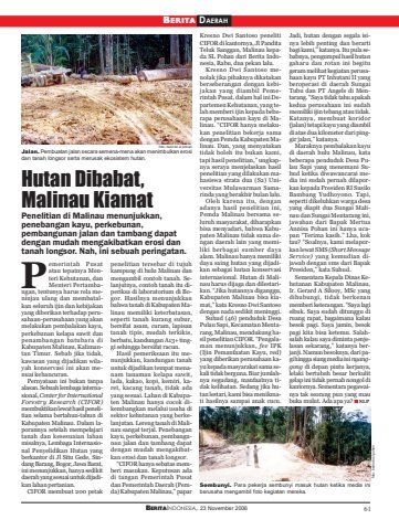 BERITAINDONESIA, 23 November 2006 61BERITA DAERAHHutan Dibabat,Malinau KiamatPenelitian di Malinau menunjukkan,penebangan kayu, perkebunan,pembangunan jalan dan tambang dapatdengan mudah mengakibatkan erosi dantanah longsor. Nah, ini sebuah peringatan.emerintah Pusatatau tepatnya Menteri Kehutanan, danMenteri Pertambangan, tentunya harus rela meninjau ulang dan membatalkan seluruh ijin dan kebijakanyang diberikan terhadap perusahaan-perusahaan yang akanmelakukan pembalakan kayu,perkebunan kelapa sawit danpenambangan batubara diKabupaten Malinau, Kalimantan Timur. Sebab jika tidak,kawasan yang dijadikan wilayah konservasi ini akan menuai kehancuran.Pernyataan ini bukan tanpaalasan. Sebuah lembaga internasional, Center for InternationalForestry Research (CIFOR)membuktikan lewat hasil penelitian selama bertahun-tahun diKabupaten Malinau. Dalam laporannya setelah mempelajaritanah dan kesesuaian lahanmisalnya, Lembaga Internasional Penyelidikan Hutan yangberkantor di Jl Situ Gede, Sindang Barang, Bogor, Jawa Barat,ini menunjukkan, hanya sedikitdaerah yang sesuai untuk dijadikan lahan pertanian.CIFOR membuat 200 petakpenelitian tersebar di tujuhkampung di hulu Malinau danmengambil contoh tanah. Selanjutnya, contoh tanah itu diperiksa di laboratorium di Bogor. Hasilnya menunjukkanbahwa tanah di Kabupaten Malinau memiliki keterbatasan,seperti tanah kurang subur,bersifat asam, curam, lapisantanah tipis, mudah terkikis,berbatu, kandungan A13+ tinggi sehingga bersifat racun.Hasil pemeriksaan itu menunjukkan, kandungan tanahuntuk dijadikan tempat menanam tanaman kelapa sawit,lada, kakao, kopi, kemiri, karet, kacang tanah, tidak adayang sesuai. Lahan di Kabupaten Malinau hanya cocok dikembangkan melalui usaha disektor kehutanan yang berkelanjutan. Lereng tanah di Malinau sangat terjal. Penebangankayu, perkebunan, pembangunan jalan dan tambang dapatdengan mudah mengakibatkan erosi dan tanah longsor.“CIFOR hanya sebatas memberi masukan. Keputusan adadi tangan Pemerintah Pusatdan Pemerintah Daerah (Pemda) Kabupaten Malinau,” paparKresno Dwi Santoso penelitiCIFOR di kantornya, Jl PanditaTeluk Sanggan, Malinau kepada SL Pohan dari Berita Indonesia, Rabu, dua pekan lalu.Kresno Dwi Santoso menolak jika pihaknya dikatakanberseberangan dengan kebijakan yang diambil Pemerintah Pusat, dalam hal ini Departemen Kehutanan, yang telah memberi ijin kepada beberapa perusahaan kayu di Malinau. “CIFOR hanya melakukan penelitian bekerja samadengan Pemda Kabupaten Malinau. Dan, yang menyatakantidak boleh itu bukan kami,tapi hasil penelitian,” ungkapnya seraya menjelaskan hasilpenelitian yang dilakukan mahasiswa strata dua (S2) Universitas Mulawarman Samarinda yang berakhir bulan lalu.Oleh karena itu, denganadanya hasil penelitian ini,Pemda Malinau bersama seluruh masyarakat, diharapkanbisa menyadari, bahwa Kabupaten Malinau tidak sama dengan daerah lain yang memiliki berbagai sumber dayaalam. Malinau hanya memilikidaya saing hutan yang dijadikan sebagai hutan konservasiinternasional. Hutan di Malinau harus dijaga dan dilestarikan. “Jika hutannya diganggu,Kabupaten Malinau bisa kiamat,” kata Kresno Dwi Santosodengan nada sedikit meninggi.Suhud (46) penduduk DesaPulau Sapi, Kecamatan Mentarang, Malinau, mendukung hasil penelitian CIFOR. “Pengalaman menunjukkan, fee IPK(Ijin Pemanfaatan Kayu, red)yang diberikan perusahaan kayu kepada masyarakat sama sekali tidak berguna. Biar jumlahnya segudang, manfaatnya tidak kelihatan. Sedang jika hutan lestari, kami bisa menikmati hasilnya sampai anak cucu.Jadi, hutan dengan segala isinya lebih penting dan berartibagi kami,” katanya. Itu pula sebabnya, pengumpul hasil hutangaharu dan rotan ini begitugeram melihat kegiatan perusahaan kayu PT Inhutani II yangberoperasi di daerah SungaiTubu dan PT Angels di Mentarang. “Saya tidak tahu apakahkedua perusahaan ini sudahmemiliki ijin tebang atau tidak.Katanya, membuat koridor(jalan) tetapi kayu yang diambildi atas dua kilometer dari pinggir jalan,” katanya.Maraknya pembalakan kayudi daerah hulu Malinau, katabeberapa penduduk Desa Pulau Sapi yang menemani Suhud ketika diwawancarai media ini sudah pernah dilaporkan kepada Presiden RI SusiloBambang Yudhoyono. Tapi,seperti dikeluhkan warga desayang diapit dua Sungai Malinau dan Sungai Mentarang ini,jawaban dari Bapak MertuaAnnisa Pohan ini hanya ucapan “Terima kasih.” Lha, koktau? “Soalnya, kami melaporkan lewat SMS (Short MessageService) yang kemudian dijawab dengan sms dari BapakPresiden,” kata Suhud.Sementara Kepala Dinas Kehutanan Kabupaten Malinau,Ir. Gerard A Silooy, MSc yangdihubungi, tidak berkenanmemberi keterangan. “Saya lagisibuk. Saya sudah ditunggu diruang rapat, bagaimana kalaubesok pagi. Saya jamin, besokpagi kita bisa ketemu. Salahsalah kalau saya diminta penjelasan sekarang,” katanya berjanji. Namun besoknya, dari pagi hingga siang media ini nyanggong di depan pintu kerjanya,lelaki bertubuh besar berkulitgelap ini tidak pernah nongol dikantornya. Sementara pegawainya tak seorang pun yang maubuka mulut. Ada apa ya? SLPPJalan. Pembuatan jalan secara semena-mena akan menimbulkan erosidan tanah longsor serta merusak ekosistem hutan.foto: berindo sl pohanSembunyi. Para pekerja sembunyi masuk hutan ketika media iniberusaha mengambil foto kegiatan mereka.foto: berindo sl pohan