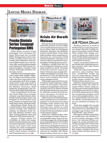62 BERITAINDONESIA, 23 November 2006BERITA DAERAHLINTAS MEDIA DAERAHPemko DimintaSerius TanggapiPeringatan BMGDPRD Medan meminta Pemkomenanggapi serius peringatan dariBadan Meteorogoli dan Geofisika(BMG). Berbagai upaya untuk menghindari terjadinya korban jiwa masyarakat harus dilakukan. Ketua Komisi B DPRD Medan Drs H.Adi Munasip, MM, menilai positif peringatanyang dikeluarkan BMG Sumut tentang kemungkinan terjadinya banjirkiriman sehubungan masuknya musim hujan saat ini.Disebutkan Adi, mengatasi banjir kiriman sangat tidak mungkin dilakukan. Air sungai yang meluap sewaktuwaktu oleh hujan yang terjadi di daerah pegunungan pasti akan menggenangi rumah warga yang berada didaerah aliran sungai (DAS). Hal yangbisa dilakukan, menurutnya, adalahbagaimana mengupayakan agar korban jiwa tidak terjadi akibat banjir itu.Untuk mengantisipasi hal itu kataAdi, Pemko Medan harus membuatantisipasi yang diprioritaskan dalambentuk-bentuk persiapan banjir yangdisiagakan di daerah-daerah rawanbanjir. Misalnya persiapan Posko baikuntuk dapur umum, dan Posko medis.Kabag Humas Pemko Medan DrsH.Arlan Nasution, MAP, yang ditemuiterpisah mengaku telah melakukanantisipasi. Itu dilakukan Pemko Medan sejak pihaknya membaca suratkabar tentang prakiraan cuaca yangdikeluarkan BMG Sumut bulan lalu.Katanya, Walikota Medan DrsH.Abdillah, Ak. MBA, telah mengeluarkan instruksi kepada camat, lurahdan kepala lingkungan yang berada didaerah rawan banjir untuk tetapwaspada dan selalu mengingatkanmasyarakat akan kemungkinan terjadinya banjir kiriman. Demikiantulis Waspada Kamis (2/11). SBKrisis Air BersihMeluasBeberapa daerah di Jawa Barat mengalami krisis air bersih. Di Garut, bahkannyaris terjadi baku hantam karena rebutan air minum. Krisis air di KabupatenIndramayu, Kuningan, dan Sukabumi,kemarin tambah parah. Warga makindidera kesulitan untuk memperoleh air.Sementara itu, kemampuan PDAMmelayani kebutuhan masyarakat terusmerosot. Debit air yang masuk ke sejumlah fasilitas PDAM juga kian menyusut.Sedikitnya, terdapat lebih dari 100desa di Kabupaten Indramayu mengalami kesulitan air bersih. Tak hanyadi desa-desa terpencil, warga di perkotaan Indramayu juga mengalami kesulitan mendapatkan air bersih. Sampai Kamis (2/11) lalu, air tidak bisa lagingocor secara normal ke keran-keranwarga pelanggan PDAM.Di Kuningan, juga terjadi hal serupa.Perubahan fungsi lingkungan sekitarsumber air dan kemarau yang berkepanjangan mengakibatkan stok air Perusahaan Daerah Air Minum (PDAM)Kab. Kuningan berkurang secara drastis. Akibatnya, pasokan air untuk konsumen, khususnya di wilayah perkotaan dan sekitarnya, terancam.Akibat krisis air di PDAM Kuningan,lokasi yang bakal terancam tidak mendapatkan air bersih antara lain cabangKuningan untuk wilayah utara danbarat, Pramuka, Pasapen III, danSiliwangi Utara. Selama ini untukmemenuhi kebutuhan air di kawasantersebut PDAM memanfaatkan sumberair dari daerah Cigugur.PDAM Kab. Sukabumi akan membuat bendungan di Sungai Citepus serta mengambil sumber mata air di daerah Kalapanunggal, Kec. Kabandunganguna mengantisipasi krisis air bersih diPalabuhanratu. Krisis air tersebutsalah satunya diakibatkan terbatasnyapasokan air ledeng PDAM, terutama dimusim kemarau yang berkepanjangansekarang ini. Demikian tulis PikiranRakyat, terbitan Jumat (03/11). SBAIR PDAM DicuriMaraknya pencurian air bersih diPDAM Surabaya mengundang perhatian khusus Direktur Lembaga Pengawas Perusahaan Daerah (LP2D)Jatim, Fatkhul Hadi. Apalagi, pencurian itu diduga ada sindikat orangdalam PDAM. Fakhul malah meminta agar pembobol air diumumkan seperti selebritis di televisi.Dugaan orang dalam PDAM terlibat semakin kuat, sebab beberapa pelaku mengerti seluk beluk kinerjaPDAM Surabaya“Kalau ada warga yang mengetahuipencurian, segera laporkan. Kamiakan memberikan hadiah Rp200.000 setiap laporan. Identitaspelapor akan kami rahasiakan,” tegasAnshari Siregar, Direktur DistribusiPDAM Surabaya, Kamis (2/11).Diakuinya, ada beberapa karyawanPDAM yang terlibat dan sudah ditangani Polresta Selatan. Selain itu,ada juga anak mantan pejabat PDAMyang terlibat pencurian air ini. Mereka berdalih sebagai karyawan PDAMdan mendatangi pelanggan untukmenawarkan penghematan air. Caranya, memperlambat pencatat meteran. Bahkan, mereka juga menawarkan jasa membobol air dengan caraaman.“Kami akan pangkas dan cari siapsaja karyawan PDAM yang terlibat.Orang dalam harus dibersihkan agarpelanggan juga bersikap bersih terhadap PDAM,” tegas Anshari.Kecurigaan terhadap orang dalamini semakin kuat, saat diketahui informasi keluhan pelanggan selalubocor. Dari informasi keluhan pelanggan ini, petugas gadungan mendatangi pelanggan dan menawarkanjasanya. “Pasti ada agen informasinya, ini harus dicari sampai ketemu,”kata Anshari. Demikian tulis KoranSurya terbitan Surabaya Kamis (2/11). SB