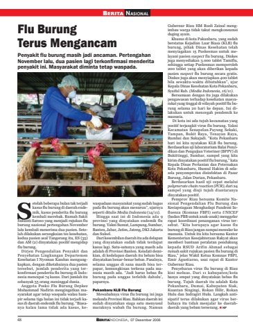 48 BERITAINDONESIA, 07 Desember 2006Flu BurungTerus Mengancametelah beberapa bulan tak terjadikasus flu burung di daerah endemik, kasus penderita flu burungkembali merebak. Rumah SakitSulianti Saroso yang menjadi rujukan fluburung nasional pertengahan Novemberlalu kembali menerima dua pasien. Setelah dilakukan serangkaian tes kesehatan,kedua pasien asal Tangerang itu, ES (35)dan AM (2) dinyatakan positif mengidapflu burung.Dirjen Pengendalian Penyakit danPenyehatan Lingkungan DepartemenKesehatan I Nyoman Kandun mengungkapkan, dengan diketahuinya dua pasientersebut, jumlah penderita yang terkonfirmasi penderita flu burung di Indonesia mencapai 74 kasus. Dari jumlah itusebanyak 55 orang meninggal dunia.Anggota Posko Flu Burung DepkesMuhammad Nadirin mengingatkan masyarakat agar tetap waspada walau hampir selama tiga bulan ini tidak terjadi kasus di daerah endemik flu burung. “Biasanya kalau lama tidak ada kasus, kewaspadaan masyarakat yang sudah baguspada flu burung akan menurun”, ujarnyaseperti ditulis Media Indonesia (14/11).Hingga saat ini di Indonesia ada 9provinsi yang dinyatakan endemik fluburung. Yakni Sumut, Lampung, Sumbar,Banten, Jabar, Jatim, Jateng, DKI Jakartadan Sulsel.Dari kesembilan daerah itu ada delapanyang dinyatakan sudah tidak terdapatkasus lagi. Satu-satunya yang masih adaadalah di Provinsi Banten. Kendati demikian, di kedelapan daerah itu belum bisadinyatakan benar-benar bebas. Pasalnya,selama unggas di sana masih bisa terpapar, kemungkinan terkena pada manusia masih ada. “Jadi harus bebas fluburung pada unggas terlebih dahulu’,paparnya.Pekanbaru KLB Flu BurungMewabahnya virus flu burung ini jugamelanda Provinsi Riau. Bahkan daerah inisudah dinyatakan siaga satu menyusulmaraknya wabah flu burung. NamunGubernur Riau HM Rusli Zainal mengimbau warga tidak takut mengkonsumsidaging ayam.Khusus di kota Pakanbaru, yang sudahberstatus Kejadian Luar Biasa (KLB) fluburung, pihak Dinas Kesehatan telahmenyiagakan 15 Puskesmas untuk melayani pasien suspect flu burung. Dinkesjuga menyediakan 3.000 tablet Tamiflu,sehingga setiap Puskesmas memperoleh200 tablet yang akan diberikan kepadapasien suspect flu burung secara gratis.Dinkes juga akan menyiapkan 400 tabletbila sewaktu-waktu dibutuhkan”, ujarKepala Dinas Kesehatan Kota Pekanbaru,Syaiful Rab. (Media Indonesia, 16/11).Bersamaan dengan itu juga dilakukanpengawasan terhadap kesehatan masyarakat yang tinggal di wilayah positif flu burung selama 20 hari ke depan. Ini dilakukan untuk mencegah pendemik kemanusia. Di kota ini ada tujuh kecamatan yangpositif terjangkit virus flu burung. YakniKecamatan Senapelan.Payung Sekaki,Tampan, Bukit Raya, Tenayan Raya,Rumbai dan Sukajadi. “Kota Pekanbaruhari ini kita nyatakan KLB flu burung.Berdasarkan uji laboratorium Balai Penyidikan dan Pengujian Veteriner (BPPV) diBukittinggi, Sumbar, sampel yang kitakirim dinyatakan positif flu burung,” kataKepala Dinas Pertanian dan PeternakanKota Pekanbaru, Husnul Hakim di selasela penyemprotan disinfektan di PasarBurung, Jalan Durian, Pekanbaru.Berdasarkan hasil uji cepat melaluipolymerate chain reaction (PCR), dari 24sampel yang diuji tujuh diantaranyadinyatakan positif.Pemprov Riau bersama Komite Nasional Pengendalian Flu Burung danKesiapsiagaan Menghadapi Pandemi Influenza (Komnas FBPI) serta UNICEF(badan PBB untuk anak-anak) menggelarrapat koordinasi penanganan virus tersebut. “Kita berupaya agar kasus fluburung di Riau jangan sampai menular kemanusia. Untuk itu kita bersama KantorKementerian Kesejahteraan Rakyat akanmemberi bantuan peralatan pendukungkepada RSUD Arifin Ahmad sebagairumah sakit rujukan pasien flu burung diRiau,” jelas Wakil Ketua Komnas FBPI,Emir Agustiarno, usai rapat di KantorGubernur Riau.Penyebaran virus flu burung di Riaukini meluas. Dari 11 kabupaten/kotahanya empat yang dinyatakan bebas fluburung. Tujuh daerah itu adalah KotaPekanbaru, Dumai, Kabupaten Siak,Kuantan Singingi, Rokan Hilir, RokanHulu dan Indragiri Hulu. Langkah antisipatif terus dilakukan agar virus berbahaya itu tidak menjalar ke daerahdaerah yang belum terserang. SPPenyakit flu burung masih jadi ancaman. PertengahanNovember lalu, dua pasien lagi terkonfirmasi menderitapenyakit ini. Masyarakat diminta tetap waspada.SBERITA NASIONAL