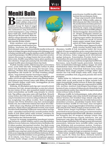 BERITAINDONESIA, 21 Desember 2006 13V ISIBERITAMeniti Buih penyelesaian konflik-konflik internasional dan perdamaian dunia.Tetapi yang menarik untuk disimak,kritik dari R. William Liddle, pakar politik Indonesia dari Ohio University, AS.Dia menilai Indonesia belum patut menjadi pemain internasional, karena di erasekarang ini, negara yang memainkanperan tersebut mesti memiliki paling tidak dua keunggulan: ekonomi dan militer. Dengan pendapatan nasional perkapita 1.000 dolar AS, Indonesia masihtergolong negara miskin. Dan kekuatanmiliter Indonesia masih di bawahnegara-negara pemain dunia lainnya,seperti AS, China, Inggris dan Rusia.Dari dalam negeri, gagasan PresidenSusilo tersebut menuai banjir kritik.Alasannya, konflik di Irak merupakan buntut dari invasisepihak AS yang mengabaikan protes masyarakat dunia danPBB. Karena itu, masalah tersebut menjadi tanggung jawabAS dan sekutunya, bukan tanggung jawab internasional,apalagi Indonesia. Pemerintahan Presiden Susilo harusmemusatkan diri pada masalah-masalah dalam negeri.Bush sekarang merasa sendirian menghadapi konflik Irak.Karenanya, saran Syaykh kepada pemerintah, Indonesiaharus memanfaatkan hubungan baiknya dengan AS untukmembebaskan rakyat Irak dari lilitan konflik demi kepentingan kemanusiaan. Pemerintah Indonesia harus mampumeletakkan Bush sebagai panglima tertinggi militer agarmundur dari Irak tidak dengan muka malu, tetapi tetapmembantu pemulihan Irak yang porak poranda oleh mesinperangnya.Dalam kaitan ini, Indonesia memang punya posisi yangsedikit lebih cocok untuk masuk ke dalam masalah Irak:negara berpenduduk muslim terbesar di dunia dan anggotatidak tetap DK-PBB. Tetapi siapa pun yang masuk ke konflikIrak, mestinya membaca kepentingan-kepentingan yangbermain di sana, terutama di dalam proyek rekonstruksi Irakdan pemanfaatan sumber daya minyak Irak yang berada padaurutan terbesar kedua di dunia.Bilamana konflik itu berkepanjangan, maka pihak-pihakyang berkepentingan akan tetap menarik keuntungan yangsebesar-besarnya dari kenaikan harga minyak yang dipicuoleh konflik tersebut. Mungkin dari sisi inilah Indonesia bisamemainkan perannya, meyakinkan kepada dunia bahwaberlarut-larutnya konflik di Irak hanya akan merugikannegara-negara yang menggantungkan kebutuhan energinyapada minyak bumi. Bukan dengan pretensi membela AS.Dalam kaitan dengan kepentingan Indonesia sendiri,pemerintah mesti merancang semua peran internasionalnyadengan mengambil faedah timbal-balik. Misalnya, mendapatkan ketegasan dari AS mengenai embargo senjata yangpernah diberlakukannya kepada Indonesia, dan apakompensasi yang akan diperoleh akibat embargo tersebut.Karena dengan melibatkan diri sebagai pemain internasional,prasyaratnya, Indonesia harus memiliki militer yang kuatyang didukung oleh persenjataan modern. Ironisnya,Presiden Susilo malah mencari persenjataan ke Rusia, bukanmeminta ketegasan komitmen untuk mengganti rugi akibatembargo suku-cadang berbagai persenjataan beratnya.Dalam kaitan menjalin hubungan dengan negara-negarabesar, seperti AS, China dan Rusia, Indonesia lantaranposisinya yang strategis dari segala segi, mesti pandai menitibuih. aru saja kita menerima kunjungan seorang presidennegeri adidaya yang penuhhiruk pikuk dan kontroversi.Presiden George W. Bush di tengahtekanan protes dan penolakan puluhanribu demonstran yang berhari-hariuntuk kunjungannya yang terhitunghanya tujuh jam, masih mampu bersikap percaya diri dan santai. Bush menilainya sebagai dinamika dari sebuahdemokrasi yang diusung secara intensoleh Amerika Serikat sendiri.Selain membawa serta segenggampenuh komitmen untuk bantuan pendidikan, kesehatan dan teknologi,Bush datang ke negeri yang berpenduduk muslim terbesar didunia ini dengan harapan untuk memperoleh dukungan morilterhadap masalah pelik yang dia ciptakan sendiri, konflik Irakyang berkepanjangan. Konflik berdarah yang telah menelanratusan ribu nyawa itu sebagai buntut dari invasi militer AStahun 2003. Konflik yang tadinya hanya antara pasukan ASdan sekutunya dengan para pejuang Irak, kini telah melebarmenjadi konflik antara kelompok Sunni dan Syiah.Di pihak Amerika sendiri, tidak kurang dari 3.000 tentaratewas, 9.000 lebih luka-luka. Sedangkan korban di pihakrakyat Irak diperkirakan tak kurang dari 600.000 orang.Sekarang, Presiden Bush menghadapi sebuah dilema yangdigambarkan oleh Syaykh Dr. AS Panji Gumilang sebagaisituasi, “maju kabotan mundur kewirangan (malu).”Bush sendiri mengakui bahwa situasi yang dihadapi olehmiliter AS di Irak sama dengan situasi yang dihadapi militerAS di dalam perang Vietnam, tahun 1968. Militer AS mundurdari Vietnam dengan wajah malu, meninggalkan 56.000kerangka jenazah tentaranya.Sekarang, AS dihadapkan pada tiga opsi: menarik seluruhtentaranya dari Irak, mempertahankan 14.000 dari seluruh60.000 tentara di Irak, atau menambah jumlah tentaranyauntuk memadamkan api konflik yang menjalar ke seluruhIrak. Tiga pilihan yang sama-sama sulit bagi Bush. Menariksemua tentara dari Irak berarti membiarkan dua kelompokyang bermusuhan terus menerus saling membunuh. Sedangkan menghadapi dua pilihan terakhir, Bush menghadapitekanan dari Partai Demokrat yang baru memenangkanPemilu sela, dan sudah tentu tekanan dari rakyat AS sendiri.Inilah situasi yang dihadapi oleh Bush ketika melawat keIndonesia. Dalam situasi yang dilematis tersebut, tuan rumahPresiden Susilo Bambang Yudhoyono menawarkan usul tigasolusi—rekonsiliasi nasional di Irak, menarik pasukan AS dankoalisi di Irak dalam jadual waktu tertentu, sementara itumenggantinya dengan pasukan internasional, memperkuatpemerintahan dan rekonstruksi Irak.Tawaran ini memang mengandung konsekuensi tertentubagi Indonesia, setidak-tidaknya seperti yang dikemukakanMenhan Juwono Sudarsono, Indonesia harus melibatkan diridi dalam pasukan internasional tersebut. Dan Bush secaratersirat menginginkan Indonesia yang secara efektif menjadianggota tidak tetap Dewan Keamanan PBB tahun 2007,memiliki suara yang kuat untuk reformasi PBB. Bush memangtidak secara langsung memi