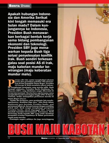 14 BERITAINDONESIA, 21 Desember 2006BUSH MAJU KABOTAN BUSH MAJU KABOTAN MBERITA UTAMAApakah hubungan Indonesia dan Amerika Serikatkini tengah memasuki erabulan madu? Dalam kunjungannya ke Indonesia,Presiden Bush menawarkan berbagai bentuk kerjasama bidang pembangunanekonomi dan teknologi.Presiden SBY juga menawarkan kepada Bush tigasolusi penyelesaian konflikIrak. Bush sendiri terkesangalau soal posisi AS di Irak,maju kabotan mundur kewirangan (maju keberatanmundur malu).ercaya diri dan santai menghadapi tekananprotes dan penolakan puluhan ribu demonstran di luar kompleks Istana Bogor, PresidenAS George W Bush meminta rakyat Indonesia menghargai pemimpin yang mereka pilih. Bushmemuji rekannya, Presiden Susilo Bambang Yudhoyono (SBY), yang dinilainya sangat dihormati diforum internasional. Mereka baru saja bersama-samamenghadiri konferensi tingkat tinggi APEC di Hanoi,Vietnam, ketika melanjutkan pertemuan mereka diIstana Bogor (20/11).“Ketika dia berbicara, para pemimpin lain mendengarkannya, demikian juga saya,” kata Bush dalamkonferensi pers bersama Presiden Susilo, usaipertemuan bilateral, dan pertemuan dengan sembilantokoh sipil. Bush sangat menghargai perspektifPresiden Susilo, akrab dipanggil SBY, tentangmasalah-masalah internasional. Karenanya, Bushberterima kasih kepada SBY yang telah membagiperspektif tersebut kepadanya di dalam pertemuanempat mata mereka.Pemimpin negara adidaya itu juga menyinggungP14 BERITAINDONESIA, 21 Desember 2006