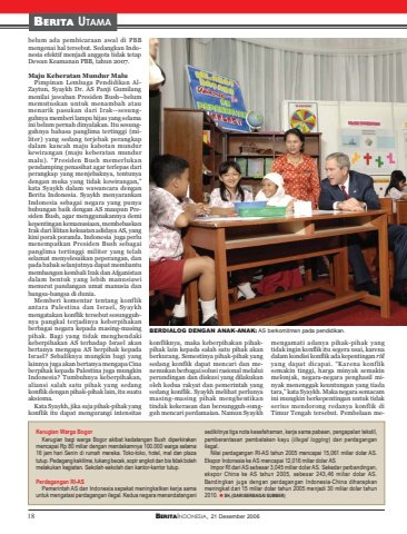 18 BERITAINDONESIA, 21 Desember 2006BERITA UTAMAbelum ada pembicaraan awal di PBBmengenai hal tersebut. Sedangkan Indonesia efektif menjadi anggota tidak tetapDewan Keamanan PBB, tahun 2007.Maju Keberatan Mundur MaluPimpinan Lembaga Pendidikan AlZaytun, Syaykh Dr. AS Panji Gumilangmenilai jawaban Presiden Bush--belummemutuskan untuk menambah ataumenarik pasukan dari Irak--sesungguhnya memberi lampu hijau yang selamaini belum pernah dinyalakan. Itu sesungguhnya bahasa panglima tertinggi (militer) yang sedang terjebak perangkapdalam kancah maju kabotan mundurkewirangan (maju keberatan mundurmalu). “Presiden Bush memerlukanpendamping penasihat agar terlepas dariperangkap yang menjebaknya, tentunyadengan muka yang tidak kewirangan,”kata Syaykh dalam wawancara denganBerita Indonesia. Syaykh menyarankanIndonesia sebagai negara yang punyahubungan baik dengan AS maupun Presiden Bush, agar menggunakannya demikepentingan kemanusiaan, membebaskanIrak dari lilitan kekuatan adidaya AS, yangkini porak poranda. Indonesia juga perlumenempatkan Presiden Bush sebagaipanglima tertinggi militer yang telahselamat menyelesaikan peperangan, danpada babak selanjutnya dapat membantumembangun kembali Irak dan Afganistandalam bentuk yang lebih manusiawimenurut pandangan umat manusia danbangsa-bangsa di dunia.Memberi komentar tentang konflikantara Palestina dan Israel, Syaykhmengatakan konflik tersebut sesungguhnya pangkal terjadinya keberpihakanberbagai negara kepada masing-masingpihak. Bagi yang tidak menghendakikeberpihakan AS terhadap Israel akanbertanya mengapa AS berpihak kepadaIsrael? Sebaliknya mungkin bagi yanglainnya juga akan bertanya mengapa Cinaberpihak kepada Palestina juga mungkinIndonesia? Tumbuhnya keberpihakan,aliansi salah satu pihak yang sedangkonflik dengan pihak-pihak lain, itu suatuaksioma.Kata Syaykh, jika saja pihak-pihak yangkonflik itu dapat mengurangi intensitaskonfliknya, maka keberpihakan pihakpihak lain kepada salah satu pihak akanberkurang. Semestinya pihak-pihak yangsedang konflik dapat mencari dan menemukan berbagai solusi rasional melaluiperundingan dan diskusi yang dilakukanoleh kedua rakyat dan pemerintah yangsedang konflik. Syaykh melihat perlunyamasing-masing pihak menghentikantindak kekerasan dan bersungguh-sungguh mencari perdamaian. Namun Syaykhmengamati adanya pihak-pihak yangtidak ingin konflik itu segera usai, karenadalam kondisi konflik ada kepentingan riilyang dapat dicapai. “Karena konfliksemakin tinggi, harga minyak semakinmelonjak, negara-negara penghasil minyak menenggak keuntungan yang tiadatara,” kata Syaykh. Maka negara semacamini mungkin berkepentingan untuk tidakserius mendorong redanya konflik diTimur Tengah tersebut. Pembelaan meKerugian Warga BogorKerugian bagi warga Bogor akibat kedatangan Bush diperkirakanmencapai Rp 80 miliar dengan mendekamnya 100.000 warga selama16 jam hari Senin di rumah mereka. Toko-toko, hotel, mal dan plazatutup. Pedagang kakilima, tukang becak, sopir angkot dan bis tidak bolehmelakukan kegiatan. Sekolah-sekolah dan kantor-kantor tutup.Perdagangan RI-ASPemerintah AS dan Indonesia sepakat meningkatkan kerja samauntuk mengatasi perdagangan ilegal. Kedua negara menandatanganisedikitnya tiga nota kesefahaman, kerja sama pabean, pengapalan tekstil,pemberantasan pembalakan kayu (illegal logging) dan perdaganganilegal.Nilai perdagangan RI-AS tahun 2005 mencapai 15,061 miliar dolar AS.Ekspor Indonesia ke AS mencapai 12,016 miliar dolar ASImpor RI dari AS sebesar 3,045 miliar dolar AS. Sekedar perbandingan,ekspor China ke AS tahun 2005, sebesar 243,46 miliar dolar AS.Bandingkan juga dengan perdagangan Indonesia-China diharapkanmeningkat dari 15 miliar dolar tahun 2005 menjadi 30 miliar dolar tahun2010. SH, (DARI BERBAGAI SUMBER)BERDIALOG DENGAN ANAK-ANAK: AS berkomitmen pada pendidikan.