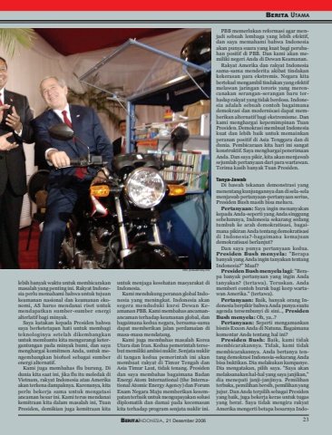 BERITAINDONESIA, 21 Desember 2006 23BERITA UTAMAlebih banyak waktu untuk membicarakanmasalah yang penting ini. Rakyat Indonesia perlu memahami bahwa untuk tujuankeamanan nasional dan keamanan ekonomi, AS harus mendanai riset untukmendapatkan sumber-sumber energialterlatif bagi minyak.Saya katakan kepada Presiden bahwasaya berketetapan hati untuk membagiteknologinya setelah dikembangkanuntuk membantu kita mengurangi ketergantungan pada minyak bumi, dan sayamenghargai komitmen Anda, untuk mengembangkan biofuel sebagai sumberenergi alternatif.Kami juga membahas flu burung. Didunia kita saat ini, jika flu itu meledak diVietnam, rakyat Indonesia atau Amerikaakan terkena dampaknya. Karenanya, kitaperlu bekerja sama untuk mengatasiancaman besar ini. Kami terus mendanaikemitraan kita dalam masalah ini, TuanPresiden, demikian juga kemitraan kitauntuk menjaga kesehatan masyarakat diIndonesia.Kami mendukung peranan global Indonesia yang meningkat. Indonesia akansegera menduduki kursi Dewan Keamanan PBB. Kami membahas ancamanancaman terhadap keamanan global, danbagaimana kedua negara, bersama-samadapat memberikan jalan perdamaian dimasa-masa mendatang.Kami juga membahas masalah KoreaUtara dan Iran. Kedua pemerintah tersebut memiliki ambisi nuklir. Senjata nuklirdi tangan kedua pemerintah ini akanmembuat rakyat di Timur Tengah danAsia Timur Laut, tidak tenang. Presidendan saya membahas bagaimana BadanEnergi Atom International (the International Atomic Energy Agency) dan ForumEnam Negara Maju memberikan kesempatan terbaik untuk mengupayakan solusidiplomatik dan damai pada kecemasankita terhadap program senjata nuklir ini.PBB memerlukan reformasi agar menjadi sebuah lembaga yang lebih efektif,dan saya memahami bahwa Indonesiaakan punya suara yang kuat bagi perubahan positif di PBB. Dan kami akan memiliki negeri Anda di Dewan Keamanan.Rakyat Amerika dan rakyat Indonesiasama-sama menderita akibat tindakankekerasan para ekstremis. Negara kitabertekad mengambil tindakan yang efektifmelawan jaringan teroris yang merencanakan serangan-serangan baru terhadap rakyat yang tidak berdosa. Indonesia adalah sebuah contoh bagaimanademokrasi dan modernisasi dapat memberikan alternatif bagi ekstremisme. Dankami menghargai kepemimpinan TuanPresiden. Demokrasi membuat Indonesiakuat dan lebih baik untuk memainkanperanan positif di Asia Tenggara dan didunia. Pembicaraan kita hari ini sangatkonstruktif. Saya menghargai penerimaanAnda. Dan saya pikir, kita akan menjawabsejumlah pertanyaan dari para wartawan.Terima kasih banyak Tuan Presiden.Tanya-JawabDi bawah tekanan demonstrasi yangmenentang kunjungannya dan di sela-selamenjawab pertanyaan-pertanyaan serius,Presiden Bush masih bisa melucu.Pertanyaan: Saya ingin menanyakankepada Anda-seperti yang Anda singgungsebelumnya, Indonesia sekarang sedangtumbuh ke arah demokratisasi, bagaimana pikiran Anda tentang demokratisasidi Indonesia?-bagaimana kemajuandemokratisasi berlanjut?Dan saya punya pertanyaan kedua.Presiden Bush menyela: \banyak yang Anda ingin tanyakan tentangIndonesia?\Presiden Bush menyela lagi: \pa banyak pertanyaan yang ingin Andatanyakan? (tertawa). Teruskan. Andamemberi contoh buruk bagi korp wartawan Amerika.\Pertanyaan: Baik, banyak orang Indonesia berpikir bahwa Anda punya suatuagenda tersembunyi di sini.., PresidenBush menyela: Oh, ya..?Pertanyaan: Seperti mengamankanbisnis Exxon Anda di Natuna. Bagaimanakomentar Anda tentang hal ini?Presiden Bush: Baik, kami tidakmembicarakannya. Tidak, kami tidakmembicarakannya. Anda bertanya tentang demokrasi Indonesia-sekarang Andabisa buktikan. Dia melakukan kampanye.Dia mengatakan, pilih saya. \melaksanakan hal-hal yang saya janjikan,\dia menepati janji-janjinya. Pemilihanterbuka, pemilihan bersih, pemilihan yangjujur. Dan Anda terpilih sebagai Presidenyang baik, juga bekerja keras untuk tugasyang berat. Saya tidak mengira rakyatAmerika mengerti betapa besarnya IndoBERITAINDONESIA, 21 Desember 2006 23foto: presidensby.info