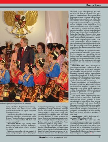 BERITAINDONESIA, 21 Desember 2006 25BERITA UTAMABERITAINDONESIA, 21 Desember 2006mana, anti-Islam. Bagaimana Anda menghadapi kesan ini? Apakah Anda tidakperlu meninjau kembali tujuan kebijakanluar negeri Anda?Dan untuk Presiden Yudhoyono, apakah Anda, di dalam pembicaraan Andadengan Presiden Bush menyarankan agarmulai menarik pasukan AS dari Iraksecepat mungkin?Presiden Bush: Saya senang sekalimenjawabnya demi dia-tidak, bukan dia.Tetapi dia bisa menjawabnya sendiri.(tertawa).Lihat, saya menghargai masyarakat dimana orang-orangnya bebas datang danmenyatakan pandangan mereka. Dan jugapenghargaan bagi Indonesia sebagaisebuah masyarakat di mana orang dapatmemprotes dan menyatakan apa yangmereka pikirkan. Dalam pada itu, bukanpertama kalinya, di mana orang-orangturun dan menyatakan pandangan mereka tentang kebijakan-kebijakan saya.Tetapi apa yang terjadi ketika Andamembuat keputusan yang sulit?Jawaban saya kepada mereka, apakahya atau tidak-bagaimana Anda memuaskan orang-orang Muslim bahwa kebijakankami terbuka, karena saya percaya kebebasan itu universal dan demokrasi ituuniversal. Saya tidak percaya itu satusatunya hak AS atau kaum Metodis. Sayapercaya mendunianya kebebasan. Dankarenanya-saya percaya rakyat inginhidup dalam masyarakat yang bebas, dansaya percaya bahwa sebagian besar rakyatingin hidup dalam kondisi yang moderat,bukan dengan kaum ekstremis yangmembunuh orang-orang tidak berdosa.Karenanya, kebijakan kami adalahmempromosikan bentuk pemerintahan.Bukan seperti Amerika, tetapi akan berbeda dari Amerika. Dan saya juga akanmengatakan kepada mereka bahwa demokrasi menghasilkan perdamaian. Demokrasi tidak berperang satu sama lain.Salah satu alasannya, kenapa saya banggamenyebut Presiden (SBY) sebagai sahabat, karena dia memahami kekuatandemokrasi, dan dia memahami itu sebagaihak universal.Dan karenanya, mengatakan bahwapenyebaran demokrasi anti-agama-berlawanan dengan itu. Demokrasi berartibahwa Anda bisa menjalani ibadah agamadengan cara yang Anda pilih secara bebas.Dan, lihat, mereka memprotes, ini suatupertanda baik. Ini pertanda masyarakatyang sehat.Presiden SBY: Baik, melanjutkanpandangan awal saya tentang Irak, sayaingin mengatakan bahwa kita mungkinmemikirkan tentang solusi tiga jalur.Pertama, sungguh penting menciptakanrekonsiliasi nasional di Irak, diiringidengan pemberdayaan pemerintah nasional yang ada, sehingga Irak bisa menangani sendiri masalah nasionalnya.Kedua, sudah tentu, kita harus melibatkan pihak-pihak lain. Kita mungkin harusmenempatkan pasukan keamanan bentukan baru yang sejajar untuk sementarawaktu, dengan jadwal waktu secukupnya,penarikan pasukan AS dan pasukanpasukan koalisi lainnya dari Irak.Dan sudah tentu, langkah yang tidakboleh diabaikan bagaimana masyarakatinternasional bekerja bersama di dalammelaksanakan pemulihan dan pembangunan kembali Irak pasca konflik.Karenanya, saya kira, kita harus memadukan ketiga solusi tersebut, sebelum AS bisamenentukan kebijakan-kebijakan apayang bisa dikembangkan di masa datang,berkaitan dengan penarikan pasukan ASdari Irak.Pertanyaan: (tidak kedengaran)…pasukan AS bertahan di Irak?Presiden SBY: Saya pikir saya telahmenjelaskan pandangan saya mengenaisolusi tiga jalur tersebut. Dan penarikanpasukan AS dari Irak dalam waktu mendatang harus dikaitkan dengan dualainnya, seperti yang sudah saya jelaskan.Terima kasih. Konferensi pers bersamaberakhir pukul 19.05 WIB. SH25foto: presidensby.info membantu pengembangan biofuel di Indonesia.