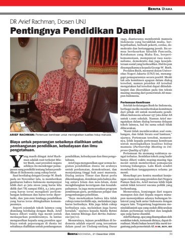 BERITAINDONESIA, 21 Desember 2006 31BERITA UTAMADR Arief Rachman, Dosen UNJPentingnya Pendidikan DamaiBiaya untuk peperangan sebaiknya dialihkan untukpembangunan pendidikan, kebudayaan dan ilmupengetahuan.ang masih diingat Arief Rachman adalah raut terkejut Mister Bush, saat presiden negaraadidaya itu mendengar pemaparan sang pendidik tentang beban pendidikan di Indonesia yang cukup berat.Saat berdialog dengan George W. Bushpada 20 November lalu, ia memberikangambaran bahwa Indonesia mempunyailebih dari 41 juta siswa yang harus kitadidik dari TK sampai SMA, 2,1 juta guruyang harus terus mengikuti perkembangan keilmuan dan harus terus diperbaiki, dan 300.000 lembaga pendidikanyang harus terus ditingkatkan kemampuannya.Seperti sejumlah tokoh lainnya yangdiundang berdialog dengan Bush, Ariefhanya diberi waktu tiga menit untukmemaparkan pemikirannya. Ia lantasmengusulkan kepada sang presiden agarbiaya untuk peperangan di dunia inisebaiknya dialihkan untuk pembangunanpendidikan, kebudayaan dan ilmu pengetahuan.Arief juga mengusulkan agar semua kegiatan pendidikan dunia ini arahnyauntuk perdamaian, demokratisasi, danmenjunjung tinggi hak asasi manusia.Dialog antara Timur dan Barat perludikembangkan, demikian pula halnya dialog antara Islam dan non-Islam, demimenghilangkan kecurigaan dan kesalahpahaman. Ia juga menyarankan programpembinaan guru, pertukaran pelajar danpengembangan penelitian.“Saya menekankan bahwa kita tidakcukup cuma terdidik saja, melainkan jugaharus berbudaya. Kita juga tidak cukupberbudaya saja, melainkan juga harusberadab,” ujarnya kepada Sanita Retmidan Amron Ritonga dari Berita Indonesia (30/11).Menurutnya, tujuan pendidikan di Indonesia adalah seperti yang tercantumdalam pasal 20 Undang-undang Dasar1945, diantaranya membentuk manusiaIndonesia yang berakhlak mulia, berkepribadian, berbudi pekerti, cerdas, demokratis dan bertanggung jawab. Itu semua berdasarkan falsafah Pancasila,Ketuhanan yang Maha Esa, berperikemanusiaan, mempunyai rasa nasionalisme, demokratis dan juga kesejahteraan sosial yang berkeadilan. Hal itu pundisampaikannya kepada George W. Bush.Presiden Bush, menurut dosen Universitas Negeri Jakarta (UNJ) ini, menanggapi pemaparannya secara positif. Meskitak ada komitmen apapun dalam dialogtersebut, namun presiden AS tersebutmengatakan hal tersebut dapat ditindaklanjuti dan diserahkan pada tim teknismasing-masing dari pemerintah AS maupun Indonesia.Pertemuan KemitraanSetelah kedatangan Bush ke Indonesia,berbagai media memberitakan komitmendari pihak AS untuk membantu pendidikan Indonesia sebesar 157 juta dolar ASuntuk 1.000 sekolah. Namun Arief mengatakan dalam dialog bersama delapantokoh lainnya, hal itu sama sekali tidakdibicarakan.“Kami tidak membicarakan soal sumbangan, dan tidak bicara soal bantuan,”ujarnya. Pertemuan tersebut, menurutnya, lebih kepada pertemuan kemitraanuntuk meningkatkan kualitas hidupmanusia (Partnership Meeting to Improve Quality of Life).Pertemuan itu memang waktunya sangat terbatas. Sembilan tokoh yang hadirhanya diberi waktu masing-masing tigamenit untuk memberikan pemaparantentang bidangnya. Lalu Bush sendirimemberikan tanggapannya selama 30menit.Menyikapi pro kontra manfaat kunjungan enam jam sang presiden dari NegaraPaman Sam itu, Arief merasa lebih bijakuntuk tidak terseret wacana politik yangberkembang.Menurutnya, kunjungan dari negaramanapun dan dari kepala negara manapun menunjukkan adanya hubungan bilateral yang baik antar Indonesia dengannegara lain. Tergantung bagaimana menindaklanjuti apa yang sudah dibicarakandalam pertemuan tersebut dan langkahapa yang harus diambil.Arief berharap, apa yang disampaikan olehsembilan tokoh, termasuk dirinya, dapat direalisasi. Meski bukan berarti kita mesti tergantung pada pemerintah AS. SR, RON, RHYfoto: berindo amronARIEF RACHMAN: Pertemuan kemitraan untuk meningkatkan kualitas hidup manusia.