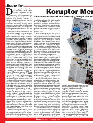 32 BERITAINDONESIA, 10 Agustus 2006BERITA KHAS32 BERITAINDONESIA, 21 Desember 2006Koruptor MenKecemasan menimpa KPK setelah mendapat serangan balik darialam sepucuk surat pembacayang dimuat harian berpengaruh, Kompas (23/11), Huseini, warga Banten menulis:“Apa untungnya buat Singapura cepatcepat menyepakati perjanjian ekstradisikoruptor yang notabene direstui dandibantu oleh penguasa negeri kita. Sedangkan mereka di Singapura sama sekalitidak bisa melakukan korupsi karenapenguasanya sangat bermartabat. Perjanjian ekstradisi tidak bisa menyelesaikan masalah selama akarnya tidak tersentuh.”Barangkali pembaca tersebut ingin menanggapi berita-berita media cetak dalamnegeri tentang puluhan ribu pencolengmencari perlindungan dengan mengubahkewarganegaraan mereka; dari WNI menjadi warga negara Singapura. Agaknyakejengkelan Huseini atas merajalelanyatindak korupsi di negeri ini, membuatnyalebih emosional ketimbang rasional.Kompas, edisi 28 Oktober menurunkanberita di halaman empat yang mengingatkan partai politik agar tidak melindungianggotanya yang melakukan korupsi. Harian beredar luas ini mengutip pernyataanSekjen Forum Peduli Parlemen Indonesia (Formappi), Sebastian Salang. Saat iniada tiga anggota DPR telah divonispengadilan karena terbukti bersalahmelakukan tindak pidana korupsi. “Meskipun putusan itu belum berkekuatanhukum tetap, partai politik dirasa perlumemberikan sanksi sebagai komitmenmenjadikan DPR lembaga terhormat,”demikian pemandu berita Kompas.Mereka yang tersangkut korupsi, Adiwarsita Adinegoro, anggota DPR dariGolkar, Dharmono K. Lawi, Ketua DPRDBanten dari PDI-P, dan Ahmad KurdiMoekri, anggota DPRD Jabar dari PPP.Mahkamah Agung menolak kasasi Adiwarsita yang juga Ketua Asosiasi Pengusaha Hutan Indonesia (APHI). Adiwarsitadinyatakan oleh pengadilan di Jakarta,terbukti mengorupsi Rp 43,545 miliardana APHI, dan dijatuhi hukuman enamtahun penjara serta denda Rp 30 juta.Sedangkan Dharmono divonis olehPengadilan Negeri Serang hukumanpenjara 4 tahun 6 bulan, karena ketikamenjabat Ketua DPRD Banten terbuktimenyelewengkan dana APBD tahun 2003sebesar Rp 14 miliar menjadi dana penunjang perumahan 75 anggota DPRD.Ahmad Kurdi divonis 4 tahun penjaraoleh Pengadilan Negeri Bandung dengantuduhan menyelewengkan dana APBDyang juga digunakan untuk dana perumahan anggota DPRD.Sebastian mengatakan, Golkar belummemberikan sanksi apa pun karenamenunggu hasil peninjauan perkaraAdiwarsita. Alasannya, menunggu keputusan hukum yang berkekuatan tetap. Halsenada dikemukakan oleh Tjahjo Kumolo,Ketua Fraksi PDIP di DPR. Tentang kasusDharmono, partainya masih menunggukeputusan berkekuatan hukum tetap.Juga menurut Wakil Sekum PPP, ChozinChumaidy, sanksi partai belum dikenakankepada Ahmad karena belum ada keputusan final.Selain itu, Kompas (18/11) di halamansatu menurunkan berita tentang RencanaDepartemen Keuangan untuk merombakstandar biaya pegawai negeri (PNS). TulisKompas, Depkeu merombak standarbiaya yang digunakan di dalam penyusunan Rencana Kerja dan AnggaranKementerian dan Lembaga Non-Departemen sehingga menjadi seragam. Standar biaya ini akan diterapkan mulai tahun2007 sebagai bagian dari reformasibirokrasi, sehingga setiap departementidak lagi seenaknya menentukan biayayang bisa menjadi sumber korupsi.Juga koran sore, Sinar Harapan (22/11)menurunkan berita yang menyarankanDepkeu agar melakukan reformasi dalampenyusunan anggaran. Mengutip pernyataan Ketua Masyarakat Profesional Madani(MPM) Ismet Hasan Putro, SH menulisbahwa kasus lembur fiktif tidak hanya adadi Depkeu, tetapi hampir merata di semuadepartemen. Kata Ismet, rekayasa membuat lembur fiktif atau juga menggelembungkan (mark up) harga barang dankegiatan korup lainnya untuk mendongkrak pendapatan mereka. “Ini dampak darirendahnya gaji PNS,” kata Ismed.Dalam tajuk di halaman empat, SHmengungkap bahwa banyak oknum pegawai Departemen Keuangan yang melakukan kolusi dengan memalsukan datalembur untuk meningkatkan pendapatan.Praktik ini sudah berlangsung bertahuntahun, sehingga sangat merugikan negara.Birokrasi yang masih buruk, tulis SH,menunjukkan aksi reformasi yang terjadibeberapa tahun lalu lebih berorientasipolitik atau cuma mau menggulingkanPresiden Soeharto. “Jatuhnya penguasaOrde Baru itu tidak dengan sendirinyamemperbaiki birokrasi, malah lebih tidakterkendali,” tegas SH. Koran yang sempatdibreidel semasa Orba ini, mengeritikpara reformis yang tidak menganggapmasalah birokrasi sebagai urusan mereka.Sedangkan harian Media Indonessia(22/11) menurunkan berita yang menyorot korupsi (halaman 6) yang berjudul:Mandek, Pengusutan 246 Kasus Korupsi.Koran milik konglomerat media massadan penasihat Partai Golkar, Surya Paloh,menulis: “Koordinasi para aparat penegakhukum, khususnya antara kepolisian dankejaksaan dinilai masih rendah.”Mengutip pernyataan anggota badanpekerja ICW, Emerson Yuntho, MI menulis bahwa kurangnya koordinasi tersebut mengakibatkan penyelesaian 246kasus yang melibatkan para aparat birokrasi daerah belum tuntas sampai sekarang. Emerson yang berbicara denganpers di sela-sela audiensi Jaksa Agungdengan sejumlah LSM antikorupsi (21/11), mengungkapkan proses hukum terhadap sekitar 246 kasus korupsi yangmelibatkan anggota DPRD, bupati, dangubernur di 20 kota, terhenti. Dia menunjuk kasus korupsi yang melibatkan 33anggota DPRD provinsi Sumatra Barat.MI juga memaparkan keluhan dari paraanggota DPRD kepada sejumlah LSMD