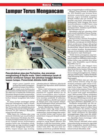 BERITAINDONESIA, 21 Desember 2006 43BERITA NASIONALLumpur Terus MengancamPascaledakan pipa gas Pertamina, dua ancamanmenghadang di depan mata. Yakni amblesnya tanah disekitar semburan lumpur dan jebolnya tanggul disertailuapan lumpur. Pemerintah diminta lebih aktif.umpur panas Lapindo terusmeluap dan makin mengganas.Semburan lumpur dan amblesnya tanah menyebabkan pipagas Pertamina meledak disertai semburanapi, Rabu (22/11) malam lalu. Korban punberjatuhan dengan kondisi mengenaskan.Tercatat 13 orang meninggal dan sejumlahkorban lainnya mengalami luka bakarserius.Di antara korban meninggal adalahDanramil Balongbendo Kapten Afandi,Serda Navis dari Yon Zipur-5 Brawijayadan Tri Iswandi serta sejumlah karyawanJasa Marga yang saat itu sedang bertugas.Kawasan itu pun akhirnya ditetapkansebagai daerah bencana.Tidak hanya itu. Ledakan pipa yangmemasok kebutuhan gas 25 perusahaanbesar, diantaranya Petrokimia dan PLN,otomatis membuat industri di Jawa Timurnyaris lumpuh karena berkurangnyapasokan listrik atau kebutuhan energi.Ledakan pipa gas juga membuat tanggulbobol. Selain menggenangi rumah penduduk, luapan lumpur juga menenggelamkan jalan tol. Akibatnya, jalan itu takmungkin lagi digunakan untuk lalulintaskendaraan.Walau telah berlangsung enam bulanlebih, amukan lumpur panas akibatkelalaian PT Lapindo Brantas Inc inibelum menunjukkan akan berhenti.Sementara penderitaan demi penderitaanterus menerpa penduduk di sekitarnya.Tercatat sedikitnya 4.182 KK (15.674 jiwa)di delapan desa yang tergusur lumpur.Mereka kehilangan rumah, pekerjaan danbahkan sebagian masa depannya.Semula diperkirakan lumpur bisa diatasi dalam waktu tiga bulan denganmembangun relief well untuk menutupsemburannya. Namun hingga kini semburan tersebut belum juga teratasi danpenderitaan warga pun menjadi semakinpanjang.Semburan lumpur Lapindo tak ayalmenguras energi Bupati Sidoarjo WinHendarso. Lebih dari enam bulan, waktunya habis untuk mengatasi masalah yangseakan tiada akhir. Dia pun larut merasakan penderitaan penduduk Sidoarjoyang menggantungkan nasib kepadanya.Sebagai orang pertama di kabupatenitu, Win Hendarso pun bersuara kerasmeminta pemerintah pusat maupunprovinsi, segera bertindak mengatasidampak ledakan pipa gas tersebut. “Inimasalah yang berat, pemerintah daerah(kabupaten) tidak sanggup bila harusmenyelesaikannya sendiri.Upaya yangkami lakukan hanya terbatas pada kemampuan lokal,” keluhnya seperti ditulisSinar Harapan (23/11).Meledaknya pipa gas sebetulnya tidakperlu terjadi seandainya Timnas Penanggulangan Semburan Lumpur Sidoarjo(PSLS) bertindak cepat.Menurut Ketua Asosiasi PerusahaanMigas Nasional (Aspermigas) EffendiSiradjudin, soal pipa gas ini sudah dibahasdalam pembicaraan dengan ahli geologiDr Andang Bachtiar dan Staf Ahli MenkoPerekonomian Ahmad Husein beberapahari sebelum kejadian. Kesimpulannya,pipa gas ini merupakan salah satu masalah yang harus cepat diantisipasi.“Selain karena penanganan yang lamban, peninggian tanggul penahan lumpurpanas yang terus dilakukan telah menimbulkan beban yang melebihi daya tahanpipa,” jelas Sirajuddin seperti dikutipRepublika (24/11).Secara teoritis, jika tanggul terusditinggikan, pipa saluran gas tersebutakan pecah karena kuatnya tekanan daridalam dan luar pipa. “Baru dua hari kitabicara tentang kemungkinan itu, ledakanpipa gas sudah terjadi,” ungkap Siradjudinyang didampingi Sekjen Aspermigas SamSimorangkir.Musibah ledakan pipa gas yang meminta korban belasan orang itu jugamenjadi perhatian wakil rakyat di Senayan. Komisi VII DPR yang menggelarrapat kerja dengan Timnas PSLS Rabu(29/11) lalu berkesimpulan Timnas PSLSyang dibentuk berdasarkan KeppresNo.13/2006 telah gagal menjalankantugas. DPR meminta Timnas melakukankoreksi atas kegagalan itu. Ketua KomisiVII Agusman Effendi juga mendesak agarwarga di delapan desa yang menjadi korban segera direlokasi, (Republika, 30/11)Siradjudin memprediksi ada dua ancaman yang menghantui di depan mata.Yakni amblesnya tanah di sekitar lokasisemburan lumpur dan jebolnya tangguldisusul banjir lumpur ketika musim hujantiba. Untuk mengatasi itu diperlukanpenanggulangan yang cepat dan efektif.“Ini harus segera dilakukan karena keduanya dipastikan hanya menunggu waktuuntuk terjadi,” ujarnya.Selain mencari alternatif solusi untukpemecahan kedua ancaman itu, juga tidakboleh mengabaikan masalah pokoknya.Yakni semburan lumpur panas yangbelum berhasil dihentikan. SPLLuapan lumpur menenggelamkan jalan tol.