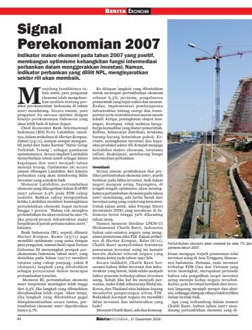 44 BERITAINDONESIA, 21 Desember 2006BERITA EKONOMISignalPerekonomian 2007Indikator makro ekonomi pada tahun 2007 yang positif,membangun optimisme kebangkitan fungsi intermediasiperbankan dalam menggerakkan investasi. Namun,indikator perbankan yang dililit NPL, mengisyaratkansektor riil akan membaik.enjelang berakhirnya tahun 2006, para pengamatekonomi telah mengeluarkan analisis tentang prediksi perekonomian Indonesia di tahun2007 mendatang. Secara umum, parapengamat itu merasa optimis dengankinerja perekonomian Indonesia yangakan lebih baik di tahun depan.Chief Economist Bank InternasionalIndonesia (BII) Ferry Latuhihin, misalnya, dalam artikelnya di Harian Kompas,Jumat (24/11), sampai-sampai mengambil judul dari buku Kartini “Habis GelapTerbitlah Terang”, sebagai gambaranoptimismenya. Secara implisit Latuhihinmenyebutkan tahun 2006 sebagai tahunkegelapan dan 2007 menjadi tahunmenuju terang. Optimisme ini secaraumum dibangun Latuhihin dari kinerjaperbankan yang akan mendorong ikliminvestasi yang semakin baikMenurut Latuhihin, pertumbuhanekonomi yang ditargetkan dalam RAPBN2007 sebesar 6,3% pada PDB cukuprealistis. Bahkan cukup mengejutkanketika Latuhihin memberi kemungkinanpertumbuhan ekonomi dapat melesathingga 7 persen. “Bukan tak mungkinpertumbuhan itu akan melesat ke atas 7%jika proyek-proyek infrastruktur mulaiberguliran di paruh pertama tahun 2007,”katanya.Bank Indonesia (BI), seperti dilansirHarian Kompas, Kamis (23/11) jugamemiliki optimisme yang sama denganpara pengamat, namun hasil rapat DewanGubernur BI menyangkut prospek perekonomian Indonesia tahun 2007, yangdisiarkan pada Selasa (22/11) membericatatan yang cukup panjang, yakni 8(delapan) langkah yang dibutuhkansebagai persyaratan dalam mencapaipertumbuhan tersebut. Menurut BI, pertumbuhan ekonomi2007 berpotensi meningkat lebih tinggidari 6,3% jika langkah yang dibutuhkandirealisasikan lebih cepat. Akan tetapi,jika langkah yang dibutuhkan gagaldiimplementasikan secara tuntas, pertumbuhan ekonomi 2007 diperkirakanhanya 5,7%.Ke delapan langkah yang dibutuhkanuntuk mencapai pertumbuhan ekonomisebesar 6,3%, pertama, pengeluaranpemerintah yang tepat waktu dan sasaran.Kedua, implementasi pembangunaninfrastruktur bidang energi dan transportasi serta restrukturisasi mesin-mesintekstil. Ketiga, peningkatan ekspor nonmigas. Keempat, tidak naiknya hargaharga komoditas yang diatur pemerintah.Kelima, kelancaran distribusi, terutamabarang-barang kebutuhan pokok. Keenam, peningkatan investasi dan kapasitas produksi sektor rill. Ketujuh menjagakestabilan makro ekonomi, terutamainflasi. Kedelapan, mendorong fungsiintermediasi perbankan.InvestasiSecara umum, pembahasan dan prediksi pertumbuhan ekonomi 2007, masihberkisar pada iklim investasi, baik dalamnegeri maupun asing. Sayangnya, ditengah-tengah optimisme akan meningkatnya pertumbuhan ekonomi pada tahun2007 mendatang, ada berita buruk dariinvestasi asing yang cenderung menurun.Untuk tahun 2006, nilai Foreign DirectInvestment (FDI) yang terealisasi di Indonesia turun hingga 50% dibandingtahun 2005.Namun menurut Direktur LPEM-UIMuhammad Chatib Basri, Indonesiabukan satu-satunya negara yang mengalami penurunan nilai FDI. Dalam artikelnya di Harian Kompas, Rabu (8/11),Chatib Basri menyebutkan fenomenapenurunan investasi asing ini hampirmerata dialami seluruh negara yangterkena krisis pada tahun 1997 lalu.Secara indikatif, Chatib Basri berasumsi bahwa iklim investasi dan infrastruktur yang buruk, tidak selalu menjadifaktor penentu terhadap aliran investasiasing. Sebab jika hal itu menjadi persoalan, maka tidak seharusnya Malaysia,Korea, dan Thailand atau bahkan Jepangmenderita pengurangan aliran FDI.Bukankah keempat negara itu memilikiiklim investasi dan infrastruktur yangbaik?Menurut Chatib Basri, ada dua kemungkinan mengapa terjadi penurunan nilaiinvestasi asing di Asia Tenggara, khususnya Indonesia. Pertama, rasio investasiterhadap PDB Cina dan Vietnam yangterus meningkat, merupakan pertandabahwa ada pengalihan target investasiasing menuju kedua negara tersebut.Kedua, pola investasi berubah dari investasi langsung menjadi merger dan akuisisi, sehingga dampak riilnya tidak terlihatdalam bentuk fisik.Apa yang terkandung dalam asumsiChatib Basri, bahwa tahun 2007 mendatang pertumbuhan ekonomi yang diMPertumbuhan ekonomi akan melesat ke atas 7% jika pertama tahun 2007.