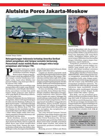 BERITAINDONESIA, 21 Desember 2006 53BERITA HANKAMAlutsista Poros Jakarta-MoskowRALATMajalah Berita Indonesia edisi 26 terdapat kesalahan pada halaman 52. Captionfoto tertulis KSAL Laksamana SlametSoebijanto, SEHARUSNYA,KomandanKorps Marinir Mayjen TNI (Mar) SafzenNoerdin. Redaksi mohon maaf atas kesalahan tersebut.Ketergantungan Indonesia terhadap Amerika Serikatdalam pengadaan alat tempur semakin berkurang.Pemerintah mulai melirik Rusia sebagai mitra kerjapengadaan alat tempur TNI.emerintah Indonesia tengahmenjajaki kemungkinan untukmelakukan kerjasama denganRusia terkait dengan pengadaan alat tempur untuk tiga angkatan di TNI.Alat tempur tersebut diantaranya helikopter serbu, kapal selam Kiloklas danpesawat Sukhoi, yang mencapai nilai total sebesar US$ 1 milar.Di Rusia terdapat dua perusahaan yangmemproduksi alat tempur yang dibutuhkan Indonesia, yakni Knapko dan Irkhutz.Kedua perusahaan tersebut ikut ambilbagian dalam pameran Indo Defence2006 yang digelar di Pekan Raya Jakarta,22-24 November lalu.Menteri Pertahanan Juwono Sudarsonomengatakan, dalam rombongan kunjunganPresiden Soesilo Bambang Yudhoyono keRusia 29 November - 2 Desember lalu jugaikut serta rombongan dari DepartemenPertahanan dan Markas Besar TNI. Timdari Dephan ini ikut membahas pelaksanaan kredit ekspor dari Rusia senilai US$1 milar dalam jangka waktu 2007-2011,untuk pengadaan alutsista khususnya alatpukul darat, laut dan udara.Meski demikian, Juwono mengakubelum tahu berapa jumlah pasti alat yangakan di beli dari Rusia. Karena sejauh inipihak Rusia juga belum memberikantawaran harga pasti. Namun dia memperkirakan setiap tahun dua Sukhoi, limahelikopter serbu, dua kapal selam Kiloklasakan dibeli pemerintah Indonesia dalamjangka waktu lima tahun.Langkah ini diambil pemerintah untukmengurangi ketergantungan Indonesia akansatu atau dua produsen alat tempur. Dikatakannya sebelum tahun 1998, 80% pengadaan alat tempur Indonesia beserta suku cadangnya sangat bergantung kepada AmerikaSerikat. Namun saat ini ketergantungan Indonesia akan alat tempur dan suku cadangnya dari Amerika tinggal 65%.Di masa mendatang, selain dari Rusia,juga ada India, Korea Selatan dan China.Dengan demikian diharapkan ketergantungan Indonesia akan alutsista tidakhanya kepada satu negara. Sehingga bilaterjadi embargo maka masih ada alternatiflain untuk mengisi pengadaannya. Hal itujuga berarti memelihara ruang gerak sertafleksibilitas dalam memilih alutsistapertahanan dari adanya kemungkinanaspek-aspek teknis militer dan politis yangbisa merugikan dan menghambat pengadaan alutsista.Apa yang menjadi harapan Juwonotampaknya juga sejalan dengan suara dariSenayan. Anggota Komisi I DPR darifraksi Partai Demokrat Boy M Saul,menekankan agar pembelian Sukhoi dariRusia benar-benar memilih perusahaanterbaik negeri tersebut. Dan selama inimenurutnya produsen tersebut adalahIrkhutz.Memang pesawat Sukhoi asal Rusiasejauh ini diproduksi oleh dua produsenyaitu Knapko dan Irkhutz. Knapko hanyamemproduksi Sukhoi yang instrumennyahanya bisa dijalankan oleh orang Rusiasendiri. Sedangkan Irkhutz sistem pesawat tempur Sukhoinya bisa disesuaikandengan kebutuhan negara-negara konsumennya, seperti Indonesia.Tampaknya penekanan Boy terkaitdengan pembelian pesawat Sukhoi terdahulu yang sampai saat ini TNI AUmasih sulit dalam membuat sistemnyauntuk menjalankan pesawat tersebut.Di lain pihak, Duta Besar Federasi RusiaMikhail M Belly, dalam jumpa persnya (23/11) mengatakan, pemerintah Rusia siapmengadakan kerja sama dengan pemerintah Indonesia terkait dengan pengadaanalat-alat tempur yang dibutuhkan gunamemperkuat pertahanan Indonesia. “Pemerintah Rusia selalu siap jika pemerintahIndonesia ingin menambah armadaSukhoinya guna membangun kekuatanpertahanannya terkait dengan kreditekspor senilai US$ 1 miliar,” ujarnya.Kata Belly, saat ini perusahaan-perusahaan produsen peralatan tempur Rusiajuga ikut hadir di Indonesia pada eventIndo Defence 2006 di Kemayoran, Jakarta. Dia merasa bangga atas kemajuan hubungan baik kedua negara belakangan ini.Baik itu di bidang politik, ekonomi maupun sosial dan budaya. Tampaknya porosJakarta-Moskow semakin cerah. SB, SPPPesawat Tempur SukhoiMikhail M Belly. foto: berindo subhanfoto: dok