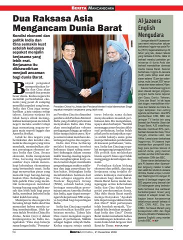 54 BERITAINDONESIA, 21 Desember 2006BERITA MANCANEGARAKondisi ekonomi danpolitik India danCina semakin kuatsetelah keduanyasepakat menjalinkerjasama yanglebih erat.Kerjasama itudikhawatirkanmenjadi ancamanbagi dunia Barat.anyak pengamatmemperkirakan India dan Cina akanmenjadi dua pemainbesar dunia. Kedua negara itumemiliki pertumbuhan ekonomi yang pesat di sampingmemiliki populasi yang besar.India dan Cina juga menghasilkan 4 juta sarjana setiaptahun. Sarjana-sarjana itutidak hanya sibuk meningkatkan kemampuan mereka dinegeri mereka sendiri tetapijuga menantang negara-negara maju seperti Inggris danAmerika Serikat.Letak ke dua negara yangberdekatan dan kondisi ekonomi ke dua negara yang terusmembaik, menimbulkan adanya persaingan ekonomi antara India dan Cina. Secaraekonomi, India mengancamCina, bersaing mengambilsumber daya untuk mencukupi kebutuhan ekonominyayang bertumbuh cepat. Indiajuga menawarkan pasar yangmenarik bagi barang-barangbuatan Cina. Sedangkan pabrik-pabrik Cina yang memiliki kemampuan membuatbarang-barang yang lebih murah dan lebih baik bagi pasarIndia, membuat Industri Indiatakut kalah bersaing.Meskipun ke dua negara itubersaing tetapi India dan Cinamenyadari bahwa mereka saling membutuhkan. Oleh karena itulah Presiden China HuJintao, Senin (20/11) dalamkunjungannya ke India mengatakan “Cina siap bekerjasama dengan India.” PernyataBDua Raksasa AsiaMengancam Dunia BaratPresiden China Hu Jintao dan Perdana Menteri India Manmohan Singhsepakat menjalin kerjasama yang lebih erat.Al-JazeeraEnglishMengudaraJaringan televisi Al-Jazeera secara resmi meluncurkan saluranberbahasa Inggris-nya pada Rabu (15/11). Sejak kehadirannya 10tahun yang lalu, stasiun televisiyang berbasis di Doha, Qatar iniberhasil merebut perhatian pemirsanya di dunia Arab danberhasil mematahkan dominasimedia massa Barat. Saluranberbahasa Inggris Al-Jazeera(AJE) pada tahap awal akansiaran selama 12 jam dan selanjutnya, mulai Januari 2007 rencananya akan siaran selama 24 jam.Saluran berbahasa Inggris iniakan diawali dengan programprogram berita berisi laporandari Gaza, Darfur, Teheran,China dan Brazil. Ini tak lepasdari slogan: membalikkan informasi dari Selatan ke Utara dengan kebijakan men-settingagenda pemberitaan. Jika 80%pemberitaan CNN, BBC danjaringan TV berita lain yangberasal dari Amerika Utara danEropa Barat, AJE sebaliknya.Mereka membuat 80% pemberitaan berasal dari Asia, TimurTengah, Amerika Latin, danAfrika. Lewat siaran berbahasaInggris-nya, Al-Jazeera inginmemberikan perspektif barubagi para pemirsa televisi diseluruh dunia, yang mencarisumber-sumber informasi alternatif selain CNN dan BBC.Siaran-siaran berbahasa Inggris Al-Jazeera akan dipancarkan langsung melalui tv kabeldan satelit dari studio Al-Jazeeradi Doha, Kuala Lumpur, Londondan Washington DC dengan 21kantor di berbagai negara dan800 pegawai yang berasal dari55 kebangsaan yang berbedabeda termasuk dua wartawanberkebangsaan Israel yangmeliput di wilayah Israel. Sebagian besar karyawannyasebelumnya pernah bekerja diBBC, CNN, ABC, Sky, danCNBC. Termasuk Marash yangkoresponden ABC dan NigelParsons (Direktor Pelaksana Aljazeera English) yang mantanjurnalis BBC. MLPan Presiden Cina itu disambutgembira oleh Perdana MenteriIndia yang di akhir pertemuanmenyatakan India dan Cinaakan meningkatkan volumeperdagangan hingga 40 milyardolar sampai tahun 2010. Kerja sama ini akan membawa keuntungan bagi ke dua negara.India dan Cina berharapmelalui kerjasama tersebutkeduanya dapat saling memberi dukungan dalam urusannuklir masing-masing negara.Cina mengharapkan kerja sama tersebut dapat membantupengembangan reaktor nuklirnya dan juga penyediaan bahan bakar. Sedangkan Indiamembutuhkan bantuan dariCina sebagai anggota dariNuclear Suppliers Group(NSG), sebuah badan yangbertugas mensahkan persetujuan antara Amerika Serikatdan India, agar dapat mempengaruhi keputusan NSG supaya berpihak bagi kepentinganIndia.India dan Cina juga sepakatmenyelesaikan konflik perbatasan mereka. Tahun laluCina resmi mengakui negarabagian di perbatasan, Sikkimsebagai bagian wilayah India.Kedua negara setuju untukterus bekerja sama dalammenyelesaikan masalah perbatasan lain. Hu mengatakan,upaya akan berlanjut. “Sambilmenunggu penyelesaian akhirsoal perbatasan, kedua belahpihak perlu melanjutkan upaya untuk bekerja sama gunamempertahankan perdamaiandi kawasan perbatasan,” katanya. India dan Cina juga sepakat mengurangi pengaruh konflik politik dan melakukanbisnis seperti biasa agar tidakmengganggu keuntungan ekonomi.Perbaikan dalam bidangekonomi dan politik, dan jugakerjasama yang terjalin diantara keduanya merupakanancaman bagi dunia Barat.Dunia Barat harus mulai menganggap serius keberadaanIndia dan Cina dalam kompetisi perekonomian dunia.Jika dulu dunia Barat masihmempertanyakan “Apakahkita dapat mengacuhkan Indiadan Cina?” Kini pertanyaantelah berubah menjadi, “Dapatkah kita bertahan menghadapi India dan Cina?” DuniaBarat mulai memahami bahwakeseimbangan kekuatan ekonomi dunia telah bergeser dariBarat ke Timur. DAP, MLP