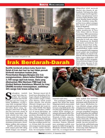 BERITAINDONESIA, 21 Desember 2006 55BERITA MANCANEGARAIrak Berdarah-DarahKonflik berdarah antara kubu Sunni danSyiah di Irak dari hari ke hari tidak pernahberhenti memakan korban jiwa.Perserikatan Bangsa-Bangsa (23/11)mengumumkan, dalam bulan Oktober saja3.709 warga sipil Irak tewas. Data yangdikeluarkan Misi Bantuan PBB bagi Irak(United Nations Assistance Mission for Iraq/UNAMI) tersebut menunjukkan, sedikitnya101 warga Irak tewas setiap hari.Sedangkan jumlahwarga Irak yang melarikan diri menujuJordania atau Suriahmencapai 100.000 orang perbulan. Sedikitnya, 1,6 juta orang telah mengungsi keluarIrak sejak terjadi invasi militerAS bulan Maret 2003. Kehidupan sehari-hari di Baghdad dan kota-kota utama diIrak makin mencekam. Banyak sekolah dan toko yangditutup sejak beberapa bulanlalu, sementara semakin banyak kasus pembunuhan yangmenimpa profesi guru, dosen,dokter, politisi, dan wartawan.Konflik sektarian bahkantelah sampai pada titik salingbunuh dengan cara mengerikan. “Ratusan mayat tak dikenal terus ditemukan di berbagai wilayah di Baghdad dengan kondisi tangan terikat,mata ditutup, tubuh penuhbekas siksaan, dan merekadibunuh dengan gaya eksekusi, ditembak dari jarak dekat,” tulis UNAMI. Hari Rabu(22/11) lalu misalnya, sedikitnya 76 mayat ditemukan, 56ditemukan di Baghdad, separuhnya ditembak dari jarakdekat. Beberapa daerah berpenghuni mayoritas Syiah jugadidera serangkaian ledakanbom dan serangan mortir (24/11). Di kota Sadr City tercatat202 orang tewas dan 250 lainnya terluka akibat ledakanbom. Ini merupakan insidenterparah sejak 2003.Para pemimpin politik danagama dari Syiah dan Sunnilangsung terjun ke masyarakatuntuk mencegah gejolak kekerasan yang lebih parah. Haltersebut juga dilakukan tokohradikal Syiah sekaligus pemimpin kelompok milisi Tentara Mahdi yang anti-Amerika,Moqtada al-Sadr, yang meminta rakyat Irak agar tetapbersatu dan tidak terpancingemosinya. Namun, imbauanpara pemimpin politik atauagama itu tidak berpengaruh.Membalas dendam insiden diSadr City, 10 serangan mortirdilaporkan telah merusakMasjid Abu Hanifa di Adhamiyah. Tak hanya itu, delapan serangan mortir juga disebutkan menghantam kantorAsosiasi Ulama Muslim, organisasi Muslim Sunni terbesardi Irak. Sembilan orang dilaporkan tewas akibat serangandua mortir di pemukimanSunni di Baghdad.Melihat kondisi yang semakin memburuk, di NewYork, Selasa (28/11), DewanKeamanan PBB memutuskansecara bulat untuk memperpanjang mandat pasukan multinasional di Irak satu tahunlagi. Keputusan itu diambilmerespons permintaan dariPerdana Menteri Nuri al-Maliki yang menyatakan masihmembutuhkan waktu untukbisa mengambil alih tanggungjawab penuh atas keamanandan stabilitas di seluruh Irak.Saat ini, ada dua tindakan yangharus segera dilakukan olehPM Maliki setelah mengadakan pertemuan dengan GeorgeBush selama dua jam di Amman (30/11). Tindakan pertama, apakah akan menurutitekanan AS yang menuntutkelompok milisi Syiah dan AlSadr segera dibubarkan karena dituduh sebagai pelakusebagian besar kekerasan sektarian di Irak dan segera mempercepat pengalihan tanggungjawab keamanan dari pasukankoalisi AS ke pasukan Irak. Adakekhawatiran di kalangan mayoritas Sunni jika AS menarikseluruh pasukannya yang berjumlah 140.000 personel keluar dari Irak, milisi Syiah yangdiyakini didukung Iran akanmenyerang habis-habisan kelompok Sunni. MLPSuasana mencekam menyelimuti Irak.
