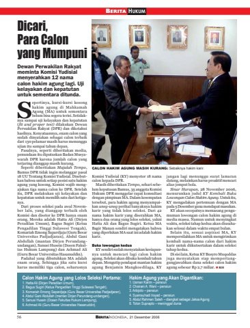 56 BERITAINDONESIA, 21 Desember 2006BERITA HUKUMDicari,Para Calonyang MumpuniDewan Perwakilan Rakyatmeminta Komisi Yudisialmenyerahkan 12 namacalon hakim agung lagi. Ujikelayakan dan kepatutanuntuk sementara ditunda.epertinya, kursi-kursi kosonghakim agung di MahkamahAgung (MA) untuk sementarabelum bisa segera terisi. Setidaknya sampai uji kelayakan dan kepatutan(fit and proper test) dilakukan DewanPerwakilan Rakyat (DPR) dan diketahuihasilnya. Kenyataannya, enam calon yangsudah dinyatakan sebagai calon terbaikdari 130 pelamar masih harus menungguujian itu sampai tahun depan.Pasalnya, seperti diberitakan media,penundaan itu diputuskan Badan Musyawarah DPR karena jumlah calon yangterjaring dianggap masih kurang.Seperti diberitakan Majalah Tempo,Bamus DPR tidak ingin melanggar pasal18 UU Tentang Komisi Yudisial. Disebutkan bahwa untuk setiap posisi satu hakimagung yang kosong, Komisi wajib mengajukan tiga nama calon ke DPR. Setelahitu, DPR melakukan uji kelayakan dankepatutan untuk memilih satu dari ketiganya.Dari proses seleksi pada awal November lalu, yang dianggap terbaik olehKomisi dan disetor ke DPR hanya enamorang. Mereka adalah Hatta Ali (DirjenPeradilan Umum), Bagus Sugiri (KetuaPengadilan Tinggi Sulawesi Tengah),Komariah Emong Sapardjaja (Guru BesarUniversitas Padjadjaran), Abdul GaniAbdullah (mantan Dirjen Perundangundangan), Sanusi Husein (Dosen Fakultas Hukum Lampung) dan Achmad Ali(Guru Besar Universitas Hasanuddin).Padahal yang dibutuhkan MA adalahenam orang. Sehingga jika satu kursiharus memiliki tiga calon, seharusnyaKomisi Yudisial (KY) menyetor 18 namacalon kepada DPR.Masih diberitakan Tempo, sehari sebelum keputusan Bamus, 35 anggota KomisiHukum DPR menggelar rapat konsultasidengan pimpinan MA. Dalam kesempatantersebut, para hakim agung menyampaikan uneg-uneg perihal banyaknya hakimkarir yang tidak lolos seleksi. Dari 42nama hakim karir yang diserahkan MA,hanya dua orang yang lolos seleksi, yakniHatta Ali dan Bagus Sugiri. Ketua MABagir Manan sendiri mengatakan bahwayang diperlukan MA saat ini adalah hakimkarir.Buka lowongan keduaKY sendiri sudah menyatakan kesiapannya untuk mencari lagi calon hakimagung. Seleksi akan dibuka kembali tahundepan. Mengutip pendapat mantan hakimagung Benjamin Mangkoedilaga, KYjangan lagi menunggu surat lamarandatang, melainkan harus proaktif mencarialias jemput bola.Sinar Harapan, 28 November 2006,menurunkan judul KY Kembali BukaLowongan Calon Hakim Agung. Untuk itu,KY mengadakan pertemuan dengan MApada 5 Desember guna mendapat masukan.KY akan secepatnya memasang pengumuman lowongan calon hakim agung dimedia massa. Namun untuk menyingkatwaktu, seleksi tahap kedua akan diusahakan selesai dalam waktu empat bulan.Selain itu, sesuai aspirasi MA, KYmempersilahkan MA untuk mengirimkankembali nama-nama calon dari hakimkarir untuk diikutsertakan dalam seleksitahap kedua.Di sisi lain, Ketua KY Busyro Muqoddasjuga menyatakan siap mempertanggungjawabkan dana seleksi calon hakimagung sebesar Rp 2,7 miliar. RHCalon Hakim Agung yang Lolos Seleksi Pertama:1. Hatta Ali (Dirjen Peradilan Umum),2. Bagus Sugiri (Ketua Pengadilan Tinggi Sulawesi Tengah),3. Komariah Emong Sapardjaja (Guru Besar Universitas Padjadjaran),4. Abdul Gani Abdullah (mantan Dirjen Perundang-undangan),5. Sanusi Husein (Dosen Fakultas Hukum Lampung),6. Achmad Ali (Guru Besar Universitas Hasanuddin).Hakim Agung yang Akan Digantikan:1. Usman Karim – pensiun2. Chairani A. Wani – pensiun3. Arbijoto – pensiun4. Syamsuhadi Irsyad – pensiun5. Abdul Rahman Saleh – diangkat sebagai Jaksa Agung6. Toton Suprapto – meninggal duniaSCALON HAKIM AGUNG MASIH KURANG: Sebaiknya hakim karir.