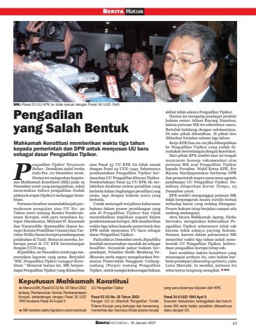 BERITAINDONESIA, 18 Januari 2007 65BERITA HUKUMPengadilanyang Salah BentukKeputusan Mahkamah Konstitusifl Menurut MK, Pasal 53 UU No. 30 Tahun 2002tentang Pembentukan Komisi PemberantasanKorupsi, bertentangan dengan Pasal 24 UUD1945 terutama Pasal 24 A ayat 5.fl MK memberi waktu tiga tahun untuk membuatUU Pengadilan TipikorPasal 53 UU No. 30 Tahun 2002:Dengan UU ini dibentuk Pengadilan TindakPidana Korupsi yang bertugas dan berwenangmemeriksa dan memutus tindak pidana korupsiyang penuntutannya diajukan oleh KPK.Pasal 24 A UUD 1945 Ayat 5:Susunan, kedudukan, keanggotaan dan hukumacara MA serta badan peradilan dibawahnyadiatur dengan UU.Mahkamah Konstitusi memberikan waktu tiga tahunkepada pemerintah dan DPR untuk menyusun UU barusebagai dasar Pengadilan Tipikor.engadilan Tipikor TerancamBubar. Demikian judul beritaIndo Pos, 20 Desember 2006.Harian ini melaporkan keputusan Mahkamah Konstitusi (MK) pada 19Desember 2006 yang mengejutkan, yaknimenyatakan bahwa pengadilan tindakpidana korupsi (tipikor) melanggar konstitusi.Putusan tersebut menindaklanjuti permohonan pengujian atas UU No. 30Tahun 2002 tentang Komisi Pemberantasan Korupsi, oleh para terpidana korupsi. Diantaranya, Mulyana W. Kusumahdan Nazaruddin Sjamsuddin (kasus korupsi Komisi Pemilihan Umum) dan Tarcisius Walla (kasus korupsi pembangunanpelabuhan di Tual). Menurut mereka, beberapa pasal di UU KPK bertentangandengan UUD 1945.Republika, 20 Desember 2006 juga menurunkan laporan yang sama. Berjudul“MK: Pengadilan Tipikor Langgar Konstitusi.” Menurut harian ini, MK berpendapat Pengadilan Tipikor yang didasarkanatas Pasal 53 UU KPK itu tidak sesuaidengan Pasal 24 UUD 1945. Seharusnyapembentukan Pengadilan Tipikor berdasarkan UU Pengadilan Khusus Tipikor.Pemberlakuan Pasal 53 UU KPK itu melahirkan dualisme sistem peradilan yangberbeda dalam lingkungan peradilan yangsama, tapi dengan hukum acara yangberbeda.Untuk mencegah terjadinya kekacauanhukum dalam proses persidangan yangada di Pengadilan Tipikor dan tidakmenimbulkan implikasi negatif dalampemberantasan korupsi, MK memberikanwaktu tiga tahun kepada pemerintah danDPR untuk menyusun UU baru sebagaidasar Pengadilan Tipikor.Pada edisi 21 Desember 2006, Republikakembali menurunkan masalah ini sebagaiheadline. Sejumlah pakar hukum berpendapat, Presiden Susilo Bambang Yudhoyono perlu segera mengeluarkan Peraturan Pemerintah Pengganti Undangundang (Perpu) tentang PengadilanTipikor, untuk mengisi kekosongan hukumakibat tidak adanya Pengadilan Tipikor.Harian ini mengutip pendapat praktisihukum senior Adnan Buyung Nasution,bahwa putusan MK itu sebetulnya rancu.Bertolak belakang dengan substansinya.Di satu pihak dibatalkan, di pihak laindibiarkan berjalan selama tiga tahun.Kerja KPK bisa sia-sia jika dilimpahkanke Pengadilan Tipikor yang sudah dinyatakan bertentangan dengan konstitusi.Dari pihak KPK sendiri saat ini tengahmenyusun konsep rekomendasi atasputusan MK soal Pengadilan Tipikorkepada Presiden. Wakil Ketua KPK, EryRiyana Hardjapamekas berharap DPRdan pemerintah segera menyusun agendapembuatan UU Pengadilan Tipikor. Demikian dilaporkan Koran Tempo, 23Desember 2006.KPK sendiri menganggap putusan MKtidak berpengaruh secara yuridis formalterhadap kasus yang sedang ditangani.Proses hukum tetap berjalan sampai adaundang-undangnya.Juru bicara Mahkamah Agung, DjokoSarwoko, mengatakan keberadaan Pengadilan Tipikor seharusnya tidak sahkarena tidak adanya payung hukum.Namun, karena dalam putusannya MKmenyebut waktu tiga tahun untuk membentuk UU Pengadilan Tipikor, keberadaan pengadilan korupsi tetap sah.Dari sembilan hakim konstitusi yangmenangani perkara itu, satu hakim berbeda pendapat (dissenting opinion), yaituLaica Marzuki. Ia menilai, putusan ituseharusnya langsung mengikat. RHPMK: Pasal 53 UU KPK itu tidak sesuai dengan Pasal 24 UUD 1945.