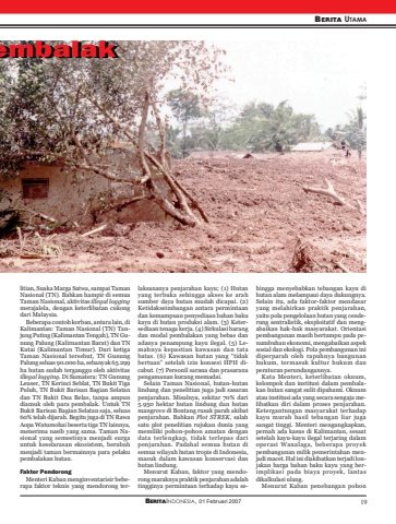 BERITAINDONESIA, 01 Februari 2007 19BERITA UTAMAlitian, Suaka Marga Satwa, sampai TamanNasional (TN). Bahkan hampir di semuaTaman Nasional, aktivitas illegal loggingmerajalela, dengan keterlibatan cukongdari Malaysia.Beberapa contoh korban, antara lain, diKalimantan: Taman Nasional (TN) Tanjung Puting (Kalimantan Tengah), TN Gunung Palung (Kalirnantan Barat) dan TNKutai (Kalimantan Timur). Dari ketigaTaman Nasional tersebut, TN GunungPalung seluas 90.000 ha, sebanyak 65.299ha hutan sudah terganggu oleh aktivitasillegal logging. Di Sumatera: TN GunungLeuser, TN Kerinci Seblat, TN Bukit TigaPuluh, TN Bukit Barisan Bagian Selatandan TN Bukit Dua Belas, tanpa ampundiamuk oleh para pembalak. Untuk TNBukit Barisan Bagian Selatan saja, seluas60% telah dijarah. Begitu juga di TN RawaAopa Watumohai beserta tiga TN lainnya,menerima nasib yang sama. Taman Nasional yang semestinya menjadi surgauntuk keselarasan ekosistem, berubahmenjadi taman bermainnya para pelakupembalakan hutan.Faktor PendorongMenteri Kaban menginventarisir beberapa faktor teknis yang mendorong terlaksananya penjarahan kayu; (1) Hutanyang terbuka sehingga akses ke arahsumber daya hutan mudah dicapai. (2)Ketidakseimbangan antara permintaandan kemampuan penyediaan bahan bakukayu di hutan produksi alam. (3) Ketersediaan tenaga kerja. (4) Sirkulasi barangdan modal pembalakan yang bebas danadanya penampung kayu ilegal. (5) Lemahnya kepastian kawasan dan tatabatas. (6) Kawasan hutan yang “tidakbertuan” setelah izin konsesi HPH dicabut. (7) Personil sarana dan prasaranapengamanan kurang memadai.Selain Taman Nasional, hutan-hutanlindung dan penelitian juga jadi sasaranpenjarahan. Misalnya, sekitar 70% dari5.950 hektar hutan lindung dan hutanmangrove di Bontang rusak parah akibatpenjarahan. Bahkan Plot STREK, salahsatu plot penelitian rujukan dunia yangmemiliki pohon-pohon amatan dengandata terlengkap, tidak terlepas daripenjarahan. Padahal semua hutan disemua wilayah hutan tropis di Indonesia,masuk dalam kawasan konservasi danhutan lindung.Menurut Kaban, faktor yang mendorong maraknya praktik penjarahan adalahtingginya permintaan terhadap kayu sehingga menyebabkan tebangan kayu dihutan alam melampaui daya dukungnya.Selain itu, ada faktor-faktor mendasaryang melahirkan praktik penjarahan,yaitu pola pengelolaan hutan yang cenderung sentralistik, eksploitatif dan mengabaikan hak-hak masyarakat. Orientasipembangunan masih bertumpu pada penumbuhan ekonomi, mengabaikan aspeksosial dan ekologi. Pola pembangunan inidiperparah oleh rapuhnya bangunanhukum, termasuk kultur hukum danperaturan perundangannya.Kata Menteri, keterlibatan oknum,kelompok dan institusi dalam pembalakan hutan sangat sulit dipahami. Oknumatau institusi ada yang secara sengaja melibatkan diri dalam proses penjarahan.Ketergantungan masyarakat terhadapkayu murah hasil tebangan liar jugasangat tinggi. Menteri mengungkapkan,pernah ada kasus di Kalimantan, sesaatsetelah kayu-kayu ilegal terjaring dalamoperasi Wanalaga, beberapa proyekpembangunan milik pemerintahan menjadi macet. Hal ini diakibatkan terjadi lonjakan harga bahan baku kayu yang berimplikasi pada biaya proyek, lantasdikalkulasi ulang.Menurut Kaban penebangan pohonembalak embalak