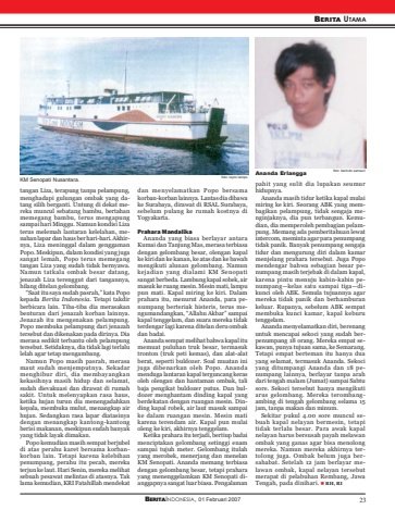 BERITAINDONESIA, 01 Februari 2007 23BERITA UTAMAtangan Liza, terapung tanpa pelampung,menghadapi gulungan ombak yang datang silih berganti. Untung di dekat mereka muncul sebatang bambu, bertahanmemegang bambu, terus mengapungsampai hari Minggu. Namun kondisi Lizaterus melemah lantaran kelelahan, menahan lapar dan haus ber hari-hari. Akhirnya, Liza meninggal dalam genggamanPopo. Meskipun, dalam kondisi yang jugasangat lemah, Popo terus memegangtangan Liza yang sudah tidak bernyawa.Namun tatkala ombak besar datang,jenazah Liza terenggut dari tangannya,hilang ditelan gelombang.“Saat itu saya sudah pasrah,” kata Popokepada Berita Indonesia. Tetapi takdirberbicara lain. Tiba-tiba dia merasakanbenturan dari jenazah korban lainnya.Jenazah itu mengenakan pelampung.Popo membuka pelampung dari jenazahtersebut dan dikenakan pada dirinya. Diamerasa sedikit terbantu oleh pelampungtersebut. Setidaknya, dia tidak lagi terlalulelah agar tetap mengambang.Namun Popo masih pasrah, merasamaut sudah menjemputnya. Sekadarmenghibur diri, dia membayangkankekasihnya masih hidup dan selamat,sudah dievakuasi dan dirawat di rumahsakit. Untuk melenyapkan rasa haus,ketika hujan turun dia menengadahkankepala, membuka mulut, menangkap airhujan. Sedangkan rasa lapar diatasinyadengan menangkap kantong-kantongberisi makanan, meskipun sudah banyakyang tidak layak dimakan.Popo kemudian masih sempat berjubeldi atas perahu karet bersama korbankorban lain. Tetapi karena kelebihanpenumpang, perahu itu pecah, merekaterjun ke laut. Hari Senin, mereka melihatsebuah pesawat melintas di atasnya. Taklama kemudian, KRI Fatahillah mendekatdan menyelamatkan Popo bersamakorban-korban lainnya. Lantas dia dibawake Surabaya, dirawat di RSAL Surabaya,sebelum pulang ke rumah kostnya diYogyakarta.Prahara MandalikaAnanda yang biasa berlayar antaraKumai dan Tanjung Mas, merasa terbiasadengan gelombang besar, olengan kapalke kiri dan ke kanan, ke atas dan ke bawahmengikuti alunan gelombang. Namunkejadian yang dialami KM Senopatisangat berbeda. Lambung kapal sobek, airmasuk ke ruang mesin. Mesin mati, lampupun mati. Kapal miring ke kiri. Dalamprahara itu, menurut Ananda, para penumpang berteriak histeris, terus mengumandangkan, “Allahu Akbar” sampaikapal tenggelam, dan suara mereka tidakterdengar lagi karena ditelan deru ombakdan badai.Ananda sempat melihat bahwa kapal itumemuat puluhan truk besar, termasuktronton (truk peti kemas), dan alat-alatberat, seperti buldozer. Soal muatan inijuga dibenarkan oleh Popo. Anandamenduga lantaran kapal terguncang kerasoleh olengan dan hantaman ombak, talibaja pengikat buldozer putus. Dan buldozer menghantam dinding kapal yangberdekatan dengan ruangan mesin. Dinding kapal robek, air laut masuk sampaike dalam ruangan mesin. Mesin matikarena terendam air. Kapal pun mulaioleng ke kiri, akhirnya tenggelam.Ketika prahara itu terjadi, bertiup badaimenciptakan gelombang setinggi enamsampai tujuh meter. Gelombang itulahyang merobek, menerjang dan menelanKM Senopati. Ananda memang terbiasadengan gelombang besar, tetapi praharayang menenggelamkan KM Senopati dianggapnya sangat luar biasa. Pengalamanpahit yang sulit dia lupakan seumurhidupnya.Ananda masih tidur ketika kapal mulaimiring ke kiri. Seorang ABK yang membagikan pelampung, tidak sengaja menginjaknya, dia pun terbangun. Kemudian, dia memperoleh pembagian pelampung. Memang ada pemberitahuan lewatintercom, meminta agar para penumpangtidak panik. Banyak penumpang sengajatidur dan mengurung diri dalam kamarmenjelang prahara tersebut. Juga Popomendengar bahwa sebagian besar penumpang masih terjebak di dalam kapal,karena pintu menuju kabin-kabin penumpang—kelas satu sampai tiga—dikunci oleh ABK. Semula tujuannya agarmereka tidak panik dan berhamburankeluar. Rupanya, sebelum ABK sempatmembuka kunci kamar, kapal keburutenggelam.Ananda menyelamatkan diri, berenanguntuk mencapai sekoci yang sudah berpenumpang 18 orang. Mereka empat sekawan, punya tujuan sama, ke Semarang.Tetapi empat berteman itu hanya duayang selamat, termasuk Ananda. Sekociyang ditumpangi Ananda dan 18 penumpang lainnya, berlayar tanpa arahdari tengah malam (Jumat) sampai Sabtusore. Sekoci tersebut hanya mengikutiarus gelombang. Mereka terombangambing di tengah gelombang selama 15jam, tanpa makan dan minum.Sekitar pukul 4.00 sore muncul sebuah kapal nelayan bermesin, tetapitidak terlalu besar. Para awak kapalnelayan harus bersusah payah melawanombak yang ganas agar bisa menolongmereka. Namun mereka akhirnya tertolong juga. Ombak belum juga bersahabat. Setelah 12 jam berlayar melawan ombak, kapal nelayan tersebutmerapat di pelabuhan Rembang, JawaTengah, pada dinihari. RH, RIKM Senopati Nusantara.Ananda Erlangga foto: repro tempofoto: berindo samsuri