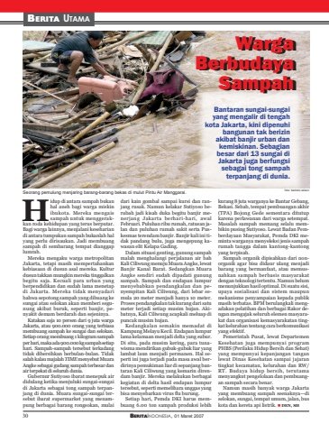 30 BERITAINDONESIA, 01 Maret 2007BERITA UTAMABantaran sungai-sungaiyang mengalir di tengahkota Jakarta, kini dipenuhibangunan tak berizinakibat banjir urban dankemiskinan. Sebagianbesar dari 13 sungai diJakarta juga berfungsisebagai tong sampahterpanjang di dunia.idup di antara sampah bukanhal aneh bagi warga miskinibukota. Mereka mengaissampah untuk menggerakkan roda kehidupan yang terus berputar.Bagi warga lainnya, menjalani kesehariandi antara tumpukan sampah bukanlah halyang perlu dirisaukan. Jadi membuangsampah di sembarang tempat dianggaplumrah.Mereka mengaku warga metropolitanJakarta, tetapi masih mempertahankankebiasaan di dusun asal mereka. Kulturdusun takkan mungkin mereka tinggalkanbegitu saja. Kecuali para urban yangberpendidikan dan sudah lama menetapdi Jakarta. Mereka tidak menyadaribahwa sepotong sampah yang dibuang kesungai atau selokan akan memberi segunung akibat buruk, seperti banjir, penyakit demam berdarah dan sejeninya.Katakan saja 10 persen dari 9 juta wargaJakarta, atau 900.000 orang yang terbiasamembuang sampah ke sungai dan selokan.Setiap orang membuang 1 kilogram sampahper hari, maka ada 900.000 kg sampah setiaphari. Sampah-sampah tersebut terkadangtidak dibersihkan berbulan-bulan. Tidaksalah kalau majalah TIME menyebut MuaraAngke sebagai gudang sampah terbesar danair terpekat di seluruh dunia.Gubernur Sutiyoso ibarat menepuk airdidulang ketika menjuluki sungai-sungaidi Jakarta sebagai tong sampah terpanjang di dunia. Muara sungai-sungai tersebut ibarat supermarket yang menampung berbagai barang rongsokan, mulaidari kain gombal sampai kursi dan ranjang rusak. Namun kelakar Sutiyoso berubah jadi kisah duka begitu banjir menerjang Jakarta berhari-hari, awalFebruari. Puluhan ribu rumah, ratusan jalan dan puluhan rumah sakit serta Puskesmas terendam banjir. Banjir kali ini tidak pandang bulu, juga mengepung kawasan elit Kelapa Gading.Dalam situasi genting, gunung sampahmalah menghalangi perjalanan air bahKali Ciliwung menuju Muara Angke, lewatBanjir Kanal Barat. Sedangkan MuaraAngke sendiri sudah dipadati gunungsampah. Sampah dan endapan lumpurmenyebabkan pendangkalan dan penyempitan Kali Ciliwung, dari lebar semula 20 meter menjadi hanya 10 meter.Proses pendangkalan tak kurang dari satumeter terjadi setiap musim hujan. Akibatnya, Kali Ciliwung acapkali meluap dipuncak musim hujan.Kedangkalan semakin memadat diKampung Melayu Kecil. Endapan lumpurlama kelamaan menjadi delta yang subur.Di situ, pada musim kering, para tunawisma mendirikan gubuk-gubuk liar yanglambat laun menjadi permanen. Hal seperti ini juga terjadi pada masa awal berdirinya pemukiman liar di sepanjang bantaran Kali Ciliwung yang kemarin direndam banjir. Mereka melakukan berbagaikegiatan di delta hasil endapan lumpurtersebut, seperti memelihara unggas yangbisa menyebarkan virus flu burung.Setiap hari, Pemda DKI harus membuang 6.00 ton sampah produksi lebihkurang 8 juta warganya ke Bantar Gebang,Bekasi. Sebab, tempat pembuangan akhir(TPA) Bojong Gede sementara ditutupkarena perlawanan dari warga setempat.Masalah sampah memang selalu membikin pusing Sutiyoso. Lewat Badan Pemberdayaan Masyarakat, Pemda DKI meminta warganya menyeleksi jenis sampahrumah tangga dalam kantong-kantongyang terpisah.Sampah organik dipisahkan dari nonorganik agar bisa didaur ulang menjadibarang yang bermanfaat, atau memusnahkan sampah berbasis masyarakatdengan teknologi tertentu. Namun belummenunjukkan hasil optimal. Di suatu sisi,upaya sosialisasi dan sistem maupunmekanisme penyampaian kepada publikmasih terbatas. BPM berulangkali mengadakan pelatihan dan berbagai Rakor dengan mengajak seluruh elemen masyarakat dan organisasi kemasyarakatan tingkat kelurahan tentang cara berkomunikasiyang efektif.Pemerintah Pusat, lewat DepartemenKesehatan juga mempunyai programPHBS (Perilaku Hidup Bersih dan Sehat)yang mempunyai kepanjangan tanganlewat Dinas Kesehatan sampai jajarantingkat kecamatan, kelurahan dan RW/RT. Budaya hidup bersih, terutamamenyangkut pengelolaan dan pembuangan sampah secara benar.Namun masih banyak warga Jakartayang membuang sampah seenaknya—diselokan, sungai, tempat umum, jalan, buskota dan kereta api listrik. „ DEN, SHHWargaBerbudayaSampahWargaBerbudayaSampahSeorang pemulung menjaring barang-barang bekas di mulut Pintu Air Manggarai. foto: berindo wilson
