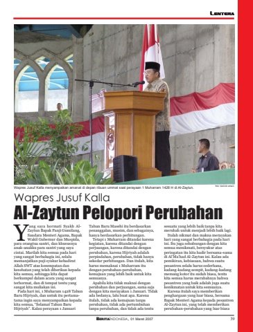 BERITAINDONESIA, 01 Maret 2007 39LENTERAWapres Jusuf KallaAl-Zaytun Pelopori PerubahanYang saya hormati Syakh AlZaytun Bapak Panji Gumilang,Saudara Menteri Agama, BapakWakil Gubernur dan Muspida,para orangtua santri, dan khususnyaanak-anakku para santri yang sayacintai. Marilah kita semua pada hariyang sangat berbahagia ini, selalumemanjatkan puji syukur kehadiratAllah SWT atas kesempatan dankesehatan yang telah diberikan kepadakita semua, sehingga kita dapatberkumpul dalam acara yang sangatterhormat, dan di tempat tentu yangsangat kita muliakan ini.Pada hari ini, 1 Muharam 1428 TahunBaru Hijriyah, dan untuk itu pertamatama ingin saya menyampaikan kepadakita semua, “Selamat Tahun BaruHijriyah”. Kalau perayaan 1 JanuariTahun Baru Masehi itu berdasarkanpenanggalan, musim, dan sebagainya,hanya berdasarkan perhitungan.Tetapi 1 Muharram ditandai karenakegiatan, karena ditandai denganperjuangan, karena ditandai denganperubahan, karena Hijriyah adalahperpindahan, perubahan, tidak hanyasekedar perhitungan. Dan itulah, kitaharus memaknai 1 Muharram itudengan perubahan-perubahan,kemajuan yang lebih baik untuk kitasemuanya.Apabila kita tidak maknai denganperubahan dan perjuangan, sama sajadengan kita merayakan 1 Januari. Tidakada bedanya, lalu buat apa. Karenaitulah, tidak ada kemajuan tanpaperubahan, tidak ada pertumbuhantanpa perubahan, dan tidak ada tentusesuatu yang lebih baik tanpa kitamerubah untuk menjadi lebih baik lagi.Itulah nikmat dan makna merayakanhari yang sangat berbahagia pada hariini. Itu juga sehubungan dengan kitasemua menikmati, bersyukur atasperingatan itu kita hadir bersama-samadi Al’Ma’had Al-Zaytun ini. Kalau adapemikiran, kebiasaan, bahwa suatupesantren selalu harus sederhana,kadang-kadang sempit, kadang-kadangmemang kotor itu sudah biasa, tentukita semua harus merubahnya bahwapesantren yang baik adalah juga suatukenikmatan untuk kita semuanya.Karena itulah saya memberikanpenghargaan yang luar biasa, bersamaBapak Menteri Agama kepada pesantrenAl-Zaytun ini, yang telah memberikanperubahan-perubahan yang luar biasaWapres Jusuf Kalla menyampaikan amanat di depan ribuan ummat saat perayaan 1 Muharram 1428 H di Al-Zaytun. foto: berindo wilson