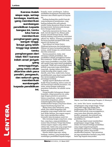 40 BERITAINDONESIA, 01 Maret 2007LenteraLENTERA40kepada suatu pandangan, bahwapendidikan keagamaan haruslah tidakseteratur atau sebaik seperti Al-Zaytunini.Kadang-kadang kita sendiri banyakyang mempunyai pemahaman, yangkadang-kadang kita sulit pahamisendiri, kalau pesantren Islam itu kotor,kurang teratur, bertanya pula kenapakotor kenapa tidak teratur.Tapi kalau (pesantren itu) besar, danbaik, mewah seperti ini, ditanya pulakenapa mewah kenapa besar. Inilahkadang-kadang yang perlu kita merubahpikiran itu. Bahwa, memang, perubahanitu harus berubah menjadi lebih baik,seperti (Al-Zaytun) ini.Tapi nikmat ini bukan hanyadinikmati kebesaran dan kebaikannya.Nikmat ini harus bermanfaat bagi kitasemua, untuk bangsa ini, untuk ummatdan kita semuanya.Karena pesantren, tentu, misiutamanya adalah pendidikan, danpendidikan adalah peningkatan harkatkita semuanya. Tidak ada bangsa yangmaju tanpa pendidikan yang baik. Tidakada ummat yang maju tanpa pendidikanyang baik. Tidak ada orang pribadi demipribadi yang maju tanpa pendidikanyang baik. Apalagi dalam alam dimanaorang bersaing antar negara, antardaerah, antar kota, maka tentu, hanyapendidikanlah yang dapat memperbaikidan memenangkan persainganpersaingan tersebut.Apalagi seperti dijelaskan tadi olehSyakh Panji Gumilang, bahwa santri disini berasal dari seluruh nusantara. Ini,tentu, sesuai dengan maknanyapesantren Indonesia. Ini adalah warnaIndonesia.Orang berpikir kebangsaan denganberpidato, tetapi pesantren ini, samajuga dengan pesantren-pesantrenlainnya yang besar, sama juga denganuniversitas yang besar, justrumelambangkan kita bagaimanamelaksanakan bangsa yang besar dalamnegara kesatuanyang besar ini.Bukan hanya dari Indonesia, tentu,sebab, kita sudah dengarkan tadipengajian yang sangat indah dari santriasal Afrika Selatan, dan negara-negaralain, tentu memberikan maknatersendiri akan kemajuan santri ini.Kita memang bangsa yang besar, yangluas, yang kaya, yang penduduknyanomor lima di dunia. Tetapi kita belumsemaju negara-negara yang sekitarsekitar kita. Salah satu yang sangat kuatmemberikan pengaruh kemajuan ituadalah pendidikan itu sendiri.Karena itulah siapa saja, setiaplembaga, institusi, yang memberikansumbangan pendidikan kepada bangsaini, tentu kita harus memberikanpenghargaan yang sangat tinggi. Tetapiyang lebih tinggi lagi adalah tentupenghargaan dari Allah SWT karenainilah amal jariyah yang sesungguhnya,yang tentu akan diterima oleh parapendiri, pengasuh, dan seluruh yangmemberikan sumbangsih kepadapendidikan ini.Kita juga dapat sesaat memberikanpenghargaan sangat tinggi. Kalauselama ini banyak lembaga pendidikanyang sangat tergantung kepadamasyarakat sekitarnya, lembaga ini kitamenghargai, bahwa masyarakatmemberikan bantuan. Tapi pesantrenini juga memberikan bantuan yang lebihbesar lagi kepada masyarakatKarena itulahsiapa saja, setiaplembaga, institusi,yang memberikansumbanganpendidikan kepadabangsa ini, tentukita harusmemberikanpenghargaan yangsangat tinggi.Tetapi yang lebihtinggi lagi adalahtentupenghargaan dariAllah SWT karenainilah amal jariyahyangsesungguhnya,yang tentu akanditerima oleh parapendiri, pengasuh,dan seluruh yangmemberikansumbangsihkepada pendidikanini.Wapres Jusuf Kalla didampingi Pangdam III Siliwangi M