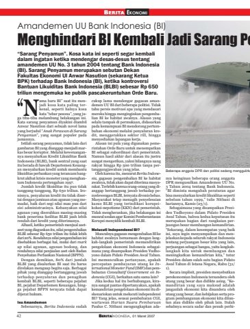 42 BERITAINDONESIA, 01 Maret 2007BERITA EKONOMI“Sarang Penyamun”. Kosa kata ini seperti segar kembalidalam ingatan ketika mendengar desas-desus tentangamandemen UU No. 3 tahun 2004 tentang Bank Indonesia(BI). Sarang Penyamun merupakan sebutan DekanFakultas Ekonomi UI Anwar Nasution (sekarang KetuaBPK) terhadap Bank Indonesia (BI), ketika kontroversiBantuan Likuiditas Bank Indonesia (BLBI) sebesar Rp 650triliun mengemuka ke publik pascakeruntuhan Orde Baru.ama baru BI” saat itu menjadi kosa kata paling terkenal, seperti halnya kosakata “tebar pesona”, yang juga tiba-tiba melambung belakangan ini.Kata sarang penyamun diyakini diambilAnwar Nasution dari sebuah novel lamayang berjudul “Anak Perawan di SarangPenyamun”, yang sangat populer padajamannya.Istilah sarang penyamun, tidak lain darigambaran BI yang dianggap menjadi markas besar koruptor. Melalui kewenangannya menyalurkan Kredit Likuiditas BankIndonesia (BLBI), bank sentral yang saatitu berada di bawah Departemen Keuangan menyalurkan kredit untuk membantulikuiditas perbankan yang terancam bangkrut akibat krisis moneter yang menghantam Indonesia pertengahan 1997.Jumlah kredit likuiditas itu pun tidaktanggung-tanggung, Rp 650 triliun. Ironisnya, penyaluran kredit itu tidak disertai dengan jaminan atau agunan yang memadai, baik dari segi nilai mau pun darisisi administrasinya. Kebanyakan nilaiagunan yang diserahkan masing-masingbank penerima fasilitas BLBI jauh lebihrendah dari kredit yang diterimanya.Alhasil, ketika pemerintah menjual asetaset yang diagunkan itu, nilai pengembalianBLBI sebesar Rp 650 triliun itu tidak lebihdari 20%. Rendahnya nilai pengembalian inidisebabkan berbagai hal, mulai dari markup nilai agunan, agunan bodong, danrendahnya nilai penjualan aset oleh BadanPenyehatan Perbankan Nasional (BPPN).Dengan demikian, 80% dari jumlahBLBI yang disalurkan BI saat itu harusdirelakan menguap begitu saja. Berbagaipihak yang dianggap bertanggung jawabterhadap penyaluran dan penagihankembali BLBI, seperti beberapa pejabatBI, pejabat Departemen Keuangan, hingga pejabat BPPN ternyata tidak dapatdijerat hukum.Isu AmandemenSebenarnya, Berita Indonesia sudahcukup lama mendengar gagasan amandemen UU BI dari beberapa politisi. Tidaktahu persis motivasi apa yang mendasarimereka hingga menginginkan pengembalian BI ke habitat awalnya. Alasan yangselalu tampak di permukaan, didasarkanpada kemampuan BI mendorong pertumbuhan ekonomi melalui penyaluran kredit, menggerakkan sektor rill, hinggamenyediakan lapangan kerja.Alasan ini pula yang digunakan pemerintahan Orde Baru untuk menempatkanBI sebagai subordinasi dari pemerintah.Namun hasil akhir dari alasan itu justrusangat mengerikan, yakni hilangnya uangrakyat hingga Rp 500 triliun tanpa pertanggungjawaban yang jelas.Oleh karena itu, menurut Berita Indonesia, gagasan pengembalian BI ke habitatawalnya, tidak akan dapat diterima masyarakat. Terlebih karena orang-orang yang dianggap bertanggung jawab terhadap penyelewengan BLBI, ternyata divonis bebas.Masyarakat tetap menagih penyelesaiankasus BLBI yang terindikasi korupsikolusi-nepotisme (KKN) dari pemerintah.Tidak mengherankan, jika belakangan inimuncul usulan agar Komisi PemberantasanKorupsi menyidik kembali BLBI.Melucuti Independensi BI?Munculnya gagasan mengembalian BI kehabitat awalnya bersamaan dengan langkah-langkah pemerintah memandirikanpengelolaan ekonomi Indonesia sebagaimana yang disampaikan Presiden Yudhoyono dalam Pidato Presiden Awal Tahun.Ini memunculkan pertanyaan, apakahpercepatan pembayaran utang ke International Moneter Fund (IMF) dan pembubaran Consultatif Government on Indonesia (CGI), berkaitan satu sama lain?Jika kedua hal itu berhubungan, kiranya sangat pantas dipertanyakan, apakahkemandirian pengelolaan ekonomi itu diskenariokan untuk melucuti independensiBI? Yang jelas, seusai pembubaran CGI,wartawan Harian Suara PembaruanPaulus C. Nitbani mengungkapkan adanya keinginan beberapa orang anggotaDPR mengusulkan Amandemen UU No.3 Tahun 2004 tentang Bank Indonesia.“BI diminta mengubah peraturan agarbisa menyalurkan kredit likuiditas sepertisebelum tahun 1999,” tulis Nitbani dihariannya, Kamis (25/1).Sebagaimana yang disampaikan Presiden Yudhoyono dalam Pidato PresidenAwal Tahun, bahwa kedua keputusan itumerupakan bagian dari rangkaian perjuangan besar membangun kemandirian.“Sekarang, dalam kesempatan yang baikini, saya ingin menyampaikan dan menjelaskan kepada seluruh rakyat Indonesiatentang perjuangan besar kita yang lain,perjuangan sebagai bangsa, yaitu langkahlangkah kita untuk membangun danmeningkatkan kemandirian kita,” tuturPresiden dalam salah satu bagian PidatoAwal Tahun di Istana Negara, Rabu (31/1).Secara implisit, presiden menyebutkanperekonomian Indonesia tersandera olehutang yang besar dan didikte asing. “Kemandirian yang saya maksud adalahjanganlah ekonomi kita disandera olehutang yang besar, dan kebijakan serta program pembangunan ekonomi kita dituntun atau didikte oleh pihak lain. Itulahsebabnya secara sadar dan penuh perhiAmandemen UU Bank Indonesia (BI)Menghindari BI Kembali Jadi Sarang Pe“NBeberapa anggota DPR dan politisi sedang menggulirka