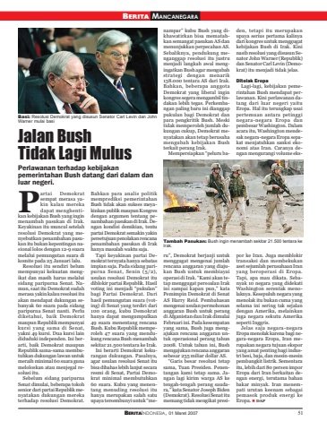 BERITAINDONESIA, 01 Maret 2007 51BERITA MANCANEGARAJalan BushTidak Lagi MulusPerlawanan terhadap kebijakanpemerintahan Bush datang dari dalam danluar negeri.artai Demokratsempat merasa yakin kalau merekadapat menghentikan kebijakan Bush yang inginmenambah pasukan di Irak.Keyakinan itu muncul setelahresolusi Demokrat yang menyebutkan penambahan pasukan itu bukan kepentingan nasional lolos dengan 12-9 suaramelalui pemungutan suara dikomite pada 25 Januari lalu.Resolusi itu sendiri belummempunyai kekuatan mengikat dan masih harus melaluisidang paripurna Senat. Namun, saat itu Demokrat sudahmerasa yakin kalau resolusi ituakan mendapat dukungan sebanyak 60 suara pada sidangparipurna Senat nanti. Perludiketahui, baik Demokratmaupun Republik mempunyaikursi yang sama di Senat,yakni 49 kursi. Dua kursi laindiduduki independen. Ini berarti, baik Demokrat maupunRepublik sama-sama membutuhkan dukungan lawan untukmeraih minimal 60 suara gunameloloskan atau menjegal resolusi itu.Sebelum sidang paripurnaSenat dimulai, beberapa tokohsenior dari partai Republik menyatakan dukungan merekaterhadap resolusi Demokrat.Bahkan para analis politikmemprediksi pemerintahanBush tidak akan sukses meyakinkan publik maupun Kongresdengan argumen tentang penambahan pasukan di Irak. Dengan kondisi demikian, tentupartai Demokrat semakin yakinpersetujuan penolakan rencanapenambahan pasukan di Irakhanya masalah waktu saja.Tapi keyakinan partai Demokrat ternyata hanya sebatasimpian saja. Pada sidang paripurna Senat, Senin (5/2),usulan resolusi Demokrat itudiblokir partai Republik. Hasilvoting ini menjadi “pukulan”bagi Partai Demokrat. Darihasil pemungutan suara (voting) di Senat yang terdiri dari100 orang, kubu Demokrathanya dapat mengumpulkan49 suara menentang rencanaBush. Kubu Republik memperoleh 47 suara yang mendukung rencana Bush menambahsekitar 21.500 tentara ke Irak.Ini berarti Demokrat kekurangan dukungan. Pasalnya,agar usulan resolusi Senat itubisa dibahas lebih lanjut secararesmi di Senat, Partai Demokrat minimal membutuhkan60 suara. Kubu yang menentang menuding resolusi ituhanya merupakan salah satuupaya tersembunyi untuk “menampar” kubu Bush yang dikhawatirkan bisa mematahkan semangat pasukan AS danmenunjukkan perpecahan AS.Sebaliknya, pendukung menganggap resolusi itu justrumenjadi langkah awal mengingatkan Bush agar mengubahstrategi dengan menarik138.000 tentara AS dari Irak.Bahkan, beberapa anggotaDemokrat yang liberal inginkongres segera mengambil tindakan lebih tegas. Perkembangan paling baru ini dianggappukulan bagi Demokrat danpara pengkritik Bush. Meskitidak memperoleh jumlah dukungan cukup, Demokrat menyatakan akan tetap berusahamengubah kebijakan Bushterkait perang Irak.Mempersiapkan “peluru baden, tetapi itu merupakanupaya serius pertama kalinyadari kongres untuk menggugatkebijakan Bush di Irak. Kininasib resolusi yang disusun Senator John Warner (Republik)dan Senator Carl Levin (Demokrat) itu menjadi tidak jelas.Ditolak EropaLagi-lagi, kebijakan pemerintahan Bush mendapat perlawanan. Kini perlawanan datang dari luar negeri yaituEropa. Hal itu terungkap usaipertemuan antara petingginegara-negara Eropa danpembesar Washington. Dalamacara itu, Washington mendesak negara-negara Eropa sepakat menjatuhkan sanksi ekonomi atas Iran. Caranya dengan mengurangi volume eksru”, Demokrat berjanji untukmenggugat mengenai jumlahrencana anggaran yang diajukan Bush untuk membiayaioperasi di Irak. “Kami akan tetap menggugat persoalan Irakini sampai kapan pun,” kataPemimpin Demokrat di SenatAS Harry Reid. Pembahasanmengenai usulan permohonananggaran Bush untuk perangdi Afganistan dan Irak dimulaiFebruari ini. Pada kesempatanyang sama, Bush juga mengajukan rencana anggaran untuk operasional perang tahun2008. Untuk tahun ini, Bushmengajukan rencana anggaransebesar 235 miliar dollar AS.“Garis besar resolusi tetapsama, Tuan Presiden. Penentangan kami tetap sama. Jangan lagi kirim warga AS ketengah-tengah perang saudara,” kata Senator Joseph Biden(Demokrat). Resolusi Senat itumemang tidak mengikat presipor ke Iran. Juga memblokirtransaksi dan membekukanaset sejumlah perusahaan Iranyang beroperasi di Eropa.Tapi, apa mau dikata. Sebanyak 10 negara yang didekatiWashington serentak menolaknya. Kesepuluh negara yangmenolak itu bukan cuma yangselama ini sering tak sejalandengan Amerika, melainkanjuga negara sekutu Amerikaseperti Inggris.Jelas saja negara-negaraEropa menolak karena bagi negara-negara Eropa, Iran merupakan negara tujuan eksporyang amat penting bagi industri besi, baja, dan mesin-mesinpembangkit listrik. Sementaraitu, lebih dari 80 persen imporEropa dari Iran berkaitan dengan energi, terutama bahanbakar minyak. Iran menempati urutan keenam sebagaipemasok produk energi keEropa. DAPPBasi: Resolusi Demokrat yang disusun Senator Carl Levin dan JohnWarner mulai basiTambah Pasukan: Bush ingin menambah sekitar 21.500 tentara keIrak.