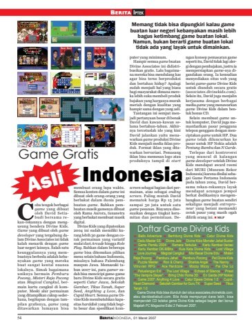 54 BERITAINDONESIA, 01 Maret 2007BERITA IPTEKMemang tidak bisa dipungkiri kalau gamebuatan luar negeri kebanyakan masih lebihbagus ketimbang game buatan lokal.Namun, bukan berarti game buatan lokaltidak ada yang layak untuk dimainkan.oba tengok berbagaigame yang dibuatoleh David Setiabudi bersama rekan-rekannya dengan mengusung bendera Divine Kids.Game yang dibuat oleh gamedeveloper yang tergabung dalam Divine Associates ini tidakkalah menarik dengan gameluar negeri lainnya. Salah satukeunggulannya yang membuatnya berbeda adalah kebanyakan game yang merekabuat sangat kental nuansalokalnya. Simak bagaimanauniknya bermain PemburuPocong, Misteri Raja Pocongatau Magical Cangkul, bermain kartu cangkul di komputer. Meski alur permainanyang ditampilkan cukup sederhana, begitupun dengan tampilan grafisnya, game yangditawarkan lumayan bisamembuat orang lupa waktu.Semua konten dalam game inidibuat oleh orang-orang yangberbakat dalam dunia pembuatan game. Bahkan pembuatan musik gamenya dibuatoleh Rama Aurora, tunanetrayang berbakat membuat musikdigital.Divine Kids yang dipatenkan2004 ini sudah memiliki kurang lebih 30 game dengan corak permainan yang variatifmulai dari Arcade hingga RolePlay. Bahkan dalam beberapagame bisa ditemukan pilihanmenu selain bahasa Indonesia,misalnya bahasa Palembangmaupun Jawa. Memasuki tahun 2007 ini, para gamer sudah bisa mencicipi game-gamebaru Divine Kids secara gratisseperti Catur Jawa, SekolahGambar, Tikus Tanah, SuperSeed, Anything 4 Love, danCupid Heart. Semua game Divine Kids membutuhkan kapasitas harddisk yang tidak begitu besar dan spesifikasi komputer yang minimum.Hampir semua game buatanDivine Associates ini didistribusikan gratis. Lalu bagaimana mereka bisa mendulang kasagar bisa terus berproduksidan bertahan hidup? Apalagisudah menjadi hal yang biasabagi masyarakat dimana mereka lebih suka membeli produkbajakan yang harganya murahmeriah dengan kualitas yanghampir sama dengan yang asli.Tantangan ini sempat menjadi pertanyaan besar di benakDavid dan kawan-kawan selama bertahun-tahun. Akhirnya tercetuslah ide yang kiniDavid jalankan yaitu menawarkan game produksi DivineKids menjadi media iklan produk. Format iklan yang ditawarkan bervariasi. Pemasangiklan bisa memesan logo atauproduknya tampil di startngan konsep pemasaran gameseperti itu, David tidak lagi alergi dengan pembajakan, justru iamempersiapkan game-nya digandakan orang. Ia kemudianmenyediakan situs web yangberisi game-game Divine Kidsuntuk diunduh secara gratis(associates.divinekids.com).Selain itu, David juga menjalinkerjasama dengan berbagaimedia game yang menawarkangame Divine Kids dalam bentuk bonus CD.Selain membuat game untuk komputer, David juga memanfaatkan pasar penggunatelepon genggam dengan menciptakan game untuk HP. Duagame telah diluncurkan kepasar untuk HP Nokia adalahPentung Bambu dan N Garde.Terlepas dari kontroversiyang muncul di kalangangame developer setelah DivineKids mendapat award resmidari MURI (Museum RekorIndonesia) karena dinilai sebagai Game Pertama Indonesiapada tahun 2004, David bersama rekan-rekannya layakmendapat acungan jempolberkat dedikasinya mengembangkan game buatan sendirisekaligus menjadi entrepreneur yang berani memasukiceruk pasar yang masih ogahdilirik orang ini. MLPDaftar Game Divine Kidsfl Bello Adventure fl Berhitung Divine Kids fl Catur Divine Kidsfl Dadu Master SE fl Divine Jets fl Divine Kids-Monster Jahat Busterfl Game Pemilu 2004 fl Kamera Terkutuk fl Kartu Kembar-Variasifl Kartu Kembar DK-MBhs fl Kuis Kata Divine Kids fl Lost Villagefl Love Journey fl Magical Cangkul fl Misi Besar Divine Edu fl MisteriRaja Pocong fl Pemburu Jahat fl Pemburu Pocong fl Pet Divine Kidsfl Puzzle Master fl Ron & Cherry fl Sharkie Angel fl The Nanny flVitruvian RPG fl Ace Hardcore fl Mozzy Mizzy fl Pai Che Lofl Petualangan Eril fl The Lost Village fl Echoes of Silence fl Priest“The Vampire Slayer” fl Bring Chiki Home 3D fl En Garde (HP Nokia)fl Game 2007: Anything 4 Love fl Catur Djawa Online 1.0 fl CupidHeart Diamond fl Sekolah Gambar for Guru TK fl Super Seed fl TikusTanah 1.0Game Divine Kids bisa diunduh dari situs associates.divinekids.com.atau davidsetiabudi.com. Bila Anda mempunyai dana lebih, bisamemperoleh CD koleksi game Divine Kids sebagai bagian dari bonusMajalah PC Magazine Edisi 2 Februari 2007.screen sebagai bagian dari permainan, atau sebagai endingscreen. Paling murah Davidmematok harga Rp 15 jutasampai 30 juta untuk satugame pesanan. Biayanya disesuaikan dengan tingkat kerumitan dan permintaan. DeGame GratisAsli IndonesiaC