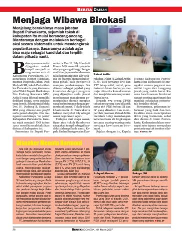 56 BERITAINDONESIA, 01 Maret 2007BERITA DAERAHMenjaga Wibawa BirokasiDisnaker Menata HarmoniMenjelang berakhirnya masa jabatanBupati Purwakarta, sejumlah tokoh dikabupaten itu mulai berancang-ancang.Diantaranya dengan melakukan berbagaiaksi secara sistematis untuk mendongkrakpopularitasnya. Sasarannya adalah agarbisa maju sebagai kandidat dan terpilihdalam pilkada nanti.eberapa nama mulaidijagokan untuktampil menjadi orang nomor satu diKabupaten Purwakarta. Diantaranya Memet Hamdan,mantan Dispenda Jabar, DediMulyadi SH, tokoh Partai Golkar Purwakarta yang kini menjabat Wakil Bupati. BerikutnyaDrs Endang Koswara MM,Asda II yang dikenal memilikidedikasi tinggi, serta pejabatyang bersih. Selanjutnya SekdaDrs. H. Dudung B. SupardiMM yang dikenal low profilserta penuh disiplin. Dia mengenal seutuhnya ‘isi perut’Kabupaten Purwakarta. Karena sejak menjadi PNS tahun1972 mendharmabhaktikandirinya di kabupaten ini.Sementara itu Bupati Purwakarta Drs H. Lily HambaliHasan MSi memiliki popularitas yang sangat tinggi. Pengamat kinerja pemerintahan menilai kepemimpinan Lily selama ini mampu merangkul semua pihak, baik pengeritikmaupun pendukungnya. Diadikenal sebagai pejabat yangkonsisten dengan programyang dijanjikan serta piawaimembangun manajemen pemerintahan daerah maupunyang berhubungan dengan pemerintah pusat. Tokoh-tokohkharismatik di Purwakartabahkan menyebut Lily sebagaisosok negarawan sejati.Terlepas dari siapa sosok,figur atau tokoh flamboyanyang akan tampil sebagai kandidat dalam pilkada nanti, Kepala Badan Kepegawaian Daerah dan Diklat H. Zainal ArifinS. SH. MH berharap PNS danPTT tetap solid, netral, profesional dalam berkarya menuju cita-cita kemakmurandan kesejahteraan masyarakatPurwakarta.Kepada 572 orang CPNStahun 2005 yang baru dilantikserta 168 PNS eselon III danIV yang dirotasi dan memperoleh promosi, Zainal Arifinmeminta tetap membangunkebersamaan di lingkungankerjanya masing-masing sertamenjaga kewibawaan birokrasi.Sejalan dengan itu, KepalaHumas Kabupaten Purwakarta Nina Meinawati SH mengakui semua pegawai memiliki tugas dan tanggungjawab yang makin berat. Karena kewibawaan birokrasisangat penting agar fungsi danmanfaat pelayanan pemerintah berjalan efektif .Menurutnya, pelayanan informasi yang baik dan berkualitas akan menciptakaniklim yang harmonis, sehatdan damai di bumi Purwakarta. Kedamaian dalam mencapai satu tujuan merupakanprestasi yang tak terukur nilainya. BND, SPAda kiat jitu dilakukan DinasTenaga Kerja (Disnaker) Purwakarta dalam menata hubungan harmoni dengan pengusaha dan tenaga kerja di daerahnya. Mereka berhasil menumbuhkan produktivitasusaha, meningkatkan kesejahteraan tenaga kerja, dan sekaligusmeningkatkan pendapatan daerah.Kadisnaker Purwakarta SukoyoSH saat berbincang dengan BeritaIndonesia mengungkapkan, kiat tersebut adalah pemaparan programdan peraturan tenaga kerja dilakukan dengan model diskusi. Pihakpengusaha, serikat pekerja dan tokoh masyarakat diundang duduk bersama membicarakan gambaran peluang investasi, informasi lapangankerja dan pengenalan karakterlingkungan masyarakat sekitar perusahaan. Kemudian kesepakatandibuat untuk dilaksanakan bersama.PT. Jamsostek pun ikut diundang.Terutama untuk perumusan 4 program utama Jamsostek. Di manapihak perusahaan mempunyai kewajiban menyetorkan besaran iuranberupa JKK (1,7 %), JHT (5,7 %), JK(0,3 %) serta JPK (3 % untuk lajangdan 6 % untuk yang berkeluarga)dikalikan satu bulan gaji.Melalui pendekatan ini, menurutSukoyo, bisa dihindari adanya pelaksanaan yang kurang dari aturansebenarnya, seperti tidak sesuainya tenaga kerja yang dilaporkanatau tersendatnya klaim pembayarannya Jamsostek. “Pendekatanseperti ini efektif hasilnya, namunapabila ada perusahaan yang melanggar akan ditegur. Bila perlu dilakukan tindakan tegas,” paparnya.Kepala Cabang Jamsostek Purwakarta Achyad Munas didampingiBagian Pemasaran, Herkules menjelaskan, pada awal tahun 2007peserta Jamsostek di KabupatenPurwakarta terdapat 217 perusahaan dengan jumlah peserta48.277 orang ditambah beberapausaha home industry seperti pertokoan, perhotelan, rumah makandan usaha lain.Perhitungan iuran yang diterimaada yang jauh di bawah UMK,namun ada pula upah yang mencapai Rp 3.000.000,- per bulan.Untuk pelayanan kesehatan, PT.Jamsostek bekerja sama dengan31 pusat pelayanan kesehatan,terdiri dari klinik, Puskesmas danRSU untuk melayani 63 perusahaan yang ikut paket B, sedang144 perusahaan lainnya memilihpaket A.Achyad Munas berharap semuapihak terutama perusahaan melaporkan data otentik tenaga kerja danmenyetor iuran tepat waktu sesuaiupah yang sebenarnya agar dalampelayanan pada tenaga kerja dapatdiberikan secara tepat dan memuaskan. Dia pun mengimbau tenagakerja memahami hak dan kewajibannya dan bekerja menghasilkanproduksi maksimal demi tujuan masadepan yang sejahtera. BND, SPB Zainal ArifinAchyad Munas Sukoyo SH