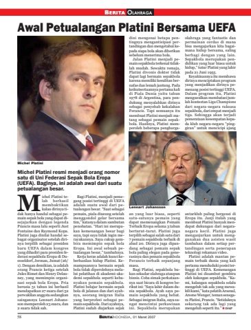 58 BERITAINDONESIA, 01 Maret 2007BERITA OLAHRAGAAwal Petualangan Platini Bersama UEFAMichel Platini resmi menjadi orang nomorsatu di Uni Federasi Sepak Bola Eropa(UEFA). Baginya, ini adalah awal dari suatupetualangan besar.ichel Platini telah berhasilmembuktikankalau dirinya tidak hanya handal sebagai pemain sepak bola yang dapat disejajarkan dengan legendaPrancis masa lalu seperti JustFontaine dan Raymond Kopa.Platini juga dinilai handal sebagai organisator setelah dirinya terpilih sebagai presidenbaru UEFA dalam kongresyang dihadiri para presiden federasi sepakbola Eropa di Duesseldorf, Jerman, Jumat (26/1). Dengan demikian, ia adalahorang Prancis ketiga setelahJules Rimet dan Henry Delauney, yang memimpin organisasi sepak bola Eropa. Priaberusia 51 tahun ini berhasilmendapatkan 27 suara dari 52perwakilan anggota sedangkansaingannya Lennart Johansson memperoleh 23 suara, dan2 suara tidak sah.Bagi Platini, menjadi pemegang posisi tertinggi di UEFAadalah suatu awal dari petualangan besar. “Saat sebagaipemain, piala diusung setelahmenggondol gelar bersamatim,” katanya dalam sambutanpenobatan. “Hari ini merupakan kemenangan besar bagisaya, tapi saya tidak ingin merayakannya. Saya cukup gembira memimpin sepak bolaEropa. Ini awal sebuah petualangan besar,” tambahnya.Kerja keras adalah kunci keberhasilan hidup Platini. Kemampuannya bermain sepakbola tidak diperolehnya melalui pelatihan di akademi-akademi sepakbola seperti kebanyakan pemain sepakbola.Platini belajar bermain sepakbola di jalanan dan dari ayahnya, seorang imigran Italiayang berprofesi sebagai pemain sepakbola. Dari ayahnya,Platini sudah diajarkan sejakdini mengenai betapa pentingnya mengantisipasi pertandingan dan mengetahui kepada siapa bola akan diberikansebelum menerima bola.Jalan Platini menjadi pemain sepakbola terkenal tidaklah mudah. Sewaktu remaja,Platini divonis dokter tidakdapat lagi bermain sepakbolakarena memiliki kesulitan bernafas dan lemah jantung. Padakeikutsertaannya pertama kalidi Piala Dunia yaitu tahun1978 di Argentina, para pendukung menyalahkan dirinyasebagai penyebab kekalahanPerancis. Tapi semuanya itumembuat Platini menjadi matang sebagai pemain sepakbola. Hasilnya, Platini memperoleh beberapa penghargaolahraga yang fantastis danpermainan cerdas di manabisa mengajarkan kita bagaimana hidup bersama, salingberbagi dengan yang lain.Sepakbola merupakan pendidikan yang luar biasa untukhidup,” tutur Platini yang lahirpada 21 Juni 1955.Keyakinannya itu membawadirinya menciptakan programyang menjadikan dirinya pemenang posisi tertinggi UEFA.Dalam program itu, Platinimengusulkan membatasi jumlah kontestan Liga Championsdari negara-negara raksasasepakbola, dari empat menjaditiga. Sehingga akan terjadipemerataan kesempatan kepada klub negara-negara “pinggiran” untuk mencicipi ajangantarklub paling bergensi diEropa itu. Janji itulah yangmembuat Platini banyak mendapat dukungan dari negaranegara kecil. Platini jugamenganjurkan untuk menggunakan dua asisten wasittambahan dalam setiap pertandingan serta penerapanteknologi rekaman video.Platini adalah mantan pemain terbaik dunia yang kalipertama menduduki posisi tertinggi di UEFA. KemenanganPlatini ini disambut gembiraoleh kalangan sepakbola. “Kami, kalangan sepakbola selalumengeluh tak ada yang mewakili kami,” kata pelatih Arsenal,Arsene Wenger, teman senegara Platini, Prancis. “Setidaknyasekarang tak ada lagi yangmengeluh seperti itu.” DAPan yang luar biasa, sepertisatu-satunya pemain yangdapat memenangkan PemainTerbaik Eropa selama 3 tahunberturut-turut. Platini jugaterpilih sebagai salah satu dari7 pemain sepakbola terbaik diabad 20. Dirinya juga dipandang sebagai pemain sepakbola paling elegan pada generasinya dan pemain sepakbolaPerancis terbaik sepanjangmasa.Bagi Platini, sepakbola bukan sekadar olahraga ataupunbisnis. Coba simak perkataannya saat bicara di kongres berikut ini: “Saya lahir dalam dunia sepakbola. Ayah saya pemain sepakbola yang hebat.Sebagai imigran Italia, saya sangat mencintai perkawinanini. Sepakbola merupakanM Lennart JohanssonMichel Platini