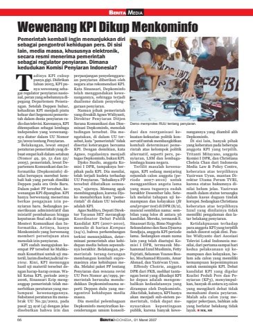 66 BERITAINDONESIA, 01 Maret 2007BERITA MEDIAWewenang KPI Dikup MenkominfoPemerintah kembali ingin menunjukkan dirisebagai pengontrol kehidupan pers. Di sisilain, media massa, khususnya elektronik,secara resmi menerima pemerintahsebagai regulator penyiaran. Dimanakedudukan Komisi Penyiaran Indonesia?adinya KPI cukuppunya gigi. Didirikantahun 2003, KPI punya wewenang sebagai regulator penyiaran nasional, peran yang sebelumnya dipegang Departemen Penerangan. Setelah Deppen bubar,kehadiran KPI menjadi pintukeluar dari hegemoni pemerintah dalam dunia penyiaran radio dan televisi. Karenanya, KPIditempatkan sebagai lembagaindependen yang wewenangnya diatur dalam UU Nomor32/2002 tentang Penyiaran.Belakangan, lewat empatperaturan pemerintah yang dibuat empat kali dalam setahun(Nomor 49, 50, 51 dan 52/2005), pemerintah, lewat Departemen Komunikasi dan Informatika (Depkominfo) dinilai berupaya merebut kembali hak yang pernah dimilikiDeppen pada era Orde Baru.Dalam paket PP tersebut, kewenangan KPI dipangkas. KPIhanya berwenang menerimaberkas pengajuan izin penyiaran baru. Sedangkan pemeriksaan administratif daninisiatif pembahasan hinggakeputusan final ada di tanganMenteri Komunikasi dan Informatika. Artinya, hanyaMenkominfo yang berwenangmemberi persetujuan ataumenolak izin penyiaran.KPI sudah mengajukan keempat PP tersebut ke Mahkamah Konstitusi untuk uji materiil, lazim disebut judicial review. Kini, KPI menungguhasil uji materiil tersebut dengan harap-harap cemas. Wakil Ketua KPI, periode 2003-2006, Sinansari Ecip menganggap pemerintah telah menerbitkan peraturan yang melampaui kewenangannya.Substansi peraturan itu menabrak UU No.32/2002, padapasal 33 ayat (4) dengan jelasdisebutkan bahwa izin danperpanjangan penyelenggaraan penyiaran diberikan olehnegara atas rekomendasi KPI.Kata Sinansari, Depkominfotelah menggandakan kewenangannya, sehingga terjadidualisme dalam penyelenggaraan penyiaran.Namun pihak pemerintahyang diwakili Agnes Widiyanti,Direktur Penyiaran DitjenSarana Komunikasi dan Diseminasi Depkominfo, menolaktudingan tersebut. Dia mengatakan, di dalam UU tersebut, kata “pemerintah” tidakdisertai keterangan bersamaKPI. Dengan demikian, kataAgnes, regulasinya menjaditugas Depkominfo, bukan KPI.Djoko Susilo, anggota Komisi I DPR, tampaknya berpihak pada KPI. Dia menilai,telah terjadi kudeta terhadapUU Penyiaran. “Sebaiknya PPtersebut dibatalkan semuanya,” ujarnya. Memang agakmembingungkan, karena Djoko menafsirkan kata “pemerintah” di dalam UU tersebutadalah KPI.Agus Sudibyo, Deputi Direktur Yayasan SET merangkapKoordinator Debat PublikKandidat KPI (2007-2010),menulis di harian Kompas(24/1), bahwa perkembanganterkini menunjukkan, determinasi pemerintah atas kehidupan media belum sepenuhnya berakhir. Belakangan, pemerintah terang-teranganmembangun kembali supremasinya atas kehidupan media. Melalui paket PP tentangPenyiaran dan rencana revisiUU Pers Nomor 40/1999, pemerintah berusaha mendudukkan Depkominfosama seperti Deppen dulu yang mengontrol kehidupan mediamassa.Dia menilai pelembagaanDepkominfo menyiratkan kecenderungan umum konsolidasi dan reorganisasi kekuatan-kekuatan politik konservatif untuk membangkitkankembali determinasi pemerintah atas kelompok politikalternatif, seperti pers, penyiaran, LSM dan lembagalembaga kuasa negara.Terlilit masalah kewenangan, KPI sedang menjaringsejumlah calon anggota (periode 2007-2010) untukmenggantikan angota lamayang masa tugasnya sudahberakhir Desember lalu. Setelah melalui tahapan uji kemampuan dan kelayakan (fitand proper test) di DPR (8/2),muncul sembilan nama: sembilan yang lolos di antara 36kandidat. Mereka, termasuk S.Sinansari Ecip, Bimo NugrohoSekundatmo dan Sasa DjuarsaSendjaja, anggota KPI periodelama. Sedangkan enam namalain yang telah disetujui Komisi I DPR, termasuk Muhammad Izzul Muslimin, FettyFajriati, Selamun Yoanes Bosko, Mochamad Riyanto, AmarAhmad, dan Yazirwan Uyun.Effendy Choirie, anggotaDPR dari FKB, melihat tantangan berat yang dihadapi KPIke depan adalah mengembalikan kedaulatannya yangdirampas oleh Depkominfo.Jika tidak, katanya, KPI hanyaakan menjadi sub-sistem pemerintah, tidak dapat menyuarakan kepentingaanpublik, karena banyak kewenangannya yang diambil alihDepkominfo.Di sisi lain, banyak pihakyang keberatan pada beberapaanggota KPI yang terpilih.Tritanti Mitayano, anggotaKomisi I DPR, dan ChristianaChelsia Chan dari IndonesiaMedia Law & Policy Centre,keberatan atas terpilihnyaYazirwan Uyun, mantan Direktur Utama Perum TVRI,karena status hukumnya dinilai belum jelas. Yazirwanmasih dalam status tersangkadalam kasus dugaan tindakkorupsi. Sedangkan Christianakeberatan atas terpilihnyaIzzul yang dinilainya tidakmemiliki pengalaman dan latar belakang penyiaran.Ketidakpuasan terhadappara anggota KPI yang terpilihsudah disorot sejak dini. Paulus Widiyanto dari AsosiasiTelevisi Lokal Indonesia menilai, dari pertama sampai harikedua pelaksanaan uji kemampuan dan kelayakan, belum ada calon yang memilikikemampuan kepemimpinanuntuk memimpin KPI. Debatkandidat KPI yang digelarKoalisi Peduli Pers dan Penyiaran (KP3), menyimpulkan, banyak di antara 25 calonyang mengikuti debat tidakmemahami dunia peyiaran.Malah ada calon yang mengejar pekerjaan, bahkan adayang berlatar belakang tidaklayak. MK, SHTDemo memprotes RUU tentang penyiaran.
