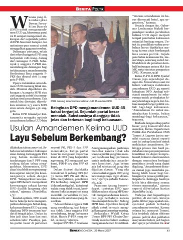BERITAINDONESIA, 29 Maret 2007 57BERITA POLITIKUsulan Amandemen Kelima UUDLayu Sebelum Berkembang?Keinginan DPD mengamandemen UUD 45bakal terganjal. Sejumlah partai besarmenolak. Substansinya dianggap tidakjelas dan terkesan bagi-bagi kekuasaan.dilakukan tahun 2007 ini. Sebab sisa kebutuhan dukunganakan datang dari anggota FKByang belum memberikantandatangan dan F PPP yangsedang dalam tahap penggodokan. Menurutnya, DPDakan bisa lebih memperjuangkan aspirasi rakyat jika kewenangannya setara denganDPR. “Memperkuat kewenangan DPD berarti memperkuatkewenangan rakyat karenaDPD dipilih langsung olehrakyat,” ujarnya. (Republika,1/3)Kendati optimis, DPD masihharus bekerja keras mengumpulkan dukungan. Sebab langkah amandemen UUD 45 yangdigalang DPD terancam kandas di tengah jalan. Usulan itubisa jadi akan layu dan matisebelum lahir. Pasalnya, partai-partai besar di parlemenseperti PG, PDI-P dan PPPmenolaknya. Ketiga partaibesar ini menguasai mayoritaskursi di DPR yang berjumlah550 orang. PG menguasai 127kursi, PDI-P 109 dan PPP 58kursi.Dalam diskusi dialektikademokrasi di gedung DPR (2/3), Ketua DPP PG Adi Matalatta menyatakan, penolakanPG terhadap langkah DPDdidasarkan tiga hal. Yakni segiwaktu yang tidak tepat, keseriusan fraksi atau parpol yangmemiliki perwakilan di parlemen serta substansi yang diusulkan.“Ada sembilan anggota FKByang mendukung, tapi ketuanya tidak. Lima anggota PKSmendukung, tetapi ketuanyatidak. Hanya F-PBR yang solid, 11 orang,” ujarnya.Sekjen DPP PDI-P PramonoAnung menegaskan, partainyamenolak karena tidak adawacana publik yang bisa menjadi landasan bagi parlemenuntuk melanjutkan amandemen konstitusi. Juga belumada hal substansial yang bisadijadian alasan. “Yang adawacana dari anggota DPD yangkewenangannya ingin ditambah,” ujarnya. (Media Indonesia, 3/3)Pramono Anung berpendapat, tuntutan DPD agardilaksanakan sidang MPR untuk mengamandemen konstitusi juga berbahaya karenabisa menjadi bola liar. SidangMPR bisa dijadikan banyakpihak untuk bermain menggolkan agenda masing-masing.Sedangkan Wakil KetuaUmum DPP PPP Chozin Chumaidy menilai belum saatnyamengamandemen konstitusi.acana yang dikembangkanDewan Perwakilan Daerah(DPD) untuk mengamandemen UUD 45, khususnya pasal22 D sempat memperoleh dukungan dari sejumlah politisidi DPR. Secercah harapan danoptimisme pun muncul untukmenggolkan gagasan tersebut.Dukungan pertama, selaindari seluruh anggota DPD yangberjumlah 128 orang, datangdari kalangan F-PKB. Sebanyak 9 anggota F-PKB menandatangani dukungan bagiterlaksananya amandemen itu.Berikutnya lima anggota FPKS dan disusul oleh 11 anggota F-PBR.Upaya melakukan amandemen UUD memang tidak mudah. Minimal diperlukan dukungan 1/3 angota MPR atau226 anggota untuk bisa mengajukan usul amandemen. Danuntuk bisa disetujui, diperlukan minimal 2/3 suara MPRatau setara dengan 452 anggota.Ketua DPD Ginandjar Kartasasmita mengaku optimisamandemen kelima UUD bisa“Wacana amandemen ini harus dicermati betul, apa urgensinya,” katanya.Senada dengan itu, Gubernur Lemhannas Muladi berpendapat usulan perubahankelima UUD dapat menjaditempat perebutan kekuasaansejumlah lembaga negara. Untuk itu pemilihan waktu perubahan harus dipikirkan matang karena akan berdampakluas secara politik. Gejalaperebutan kekuasaan itu, menurutnya, sekarang sudah terlihat dalam ide penataan kembali hubungan antara MA danMK serta tuntutan penguatanDPD. (Kompas, 9/3)Ketua F-PD di DPR SyariefHasan juga sependapat dengan itu. Menurutnya saat inibelum waktunya melakukanamandemen UUD 45 sepertikeinginan DPD. Apalagi substansi amandemen itu seharusnya untuk peningkatan kinerja lembaga negara dan bukan menjadi target politik untuk bagi-bagi kekuasaan.“Amandemen itu untuk meningkatkan kinerja, bukanmembagi-bagi kekuasaan,”tegasnya.Berbeda dengan sikap partaibesar yang konservatif danmenolak, Ketua DepartemenPolitik dan Perubahaan CSISTommi A Legowo justru menilai suasana damai sepertisaat ini cukup kondusif untukmelakukan amandemen. Sehingga proses dan hasil perubahan atau penyempurnaankonstitusi itu dapat komprehensif, koheren dan konsistendengan munculnya berbagaipemikiran jernih yang dapatdigalang. “Amandemen di masa damai juga membuka peluang lebih besar bagi terbangunnya proses politik partisipatoris. Sehingga hasilnyalebih bisa diterima semuaelemen masyarakat,” ujarnyaseperti diberitakan harianRepublika (7/3).Terlepas dari kepentinganpolitisi, di sisi lain, kiranyaperlu dilihat juga apakah masyarakat peduli terhadapamandemen tersebut. Karenaselama ini, menurut Tommi,kita terjebak dalam elitismeproses politik dan pelibatanmasyarakat belum jadi bagiandari upaya perubahan itu. SPWPBR dukung amandemen kelima UUD 45 usulan DPD.foto: repro republika
