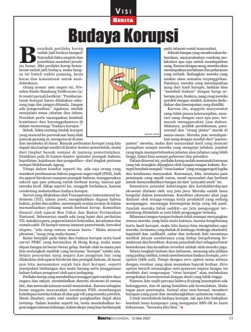 BERITAINDONESIA, 10 Mei 2007 13V ISIBERITABudaya Korupsienarkah perilaku korupsudah jadi budaya bangsa?Sejumlah fakta empiris danpenelitian memberi jawaban, benar. Jika perilaku korup benarbenar sudah jadi budaya, maka bangsa ini butuh waktu panjang, kerjakeras dan konsistensi untuk mendobraknya.Orang nomor satu negeri ini, Presiden Susilo Bambang Yudhoyono (2/8-2006) pernah berikrar: “Pemberantasan korupsi harus dilakukan sekarang juga dan jangan ditunda. Janganada pengecualian.” Agaknya, setelahmenjalani masa jabatan dua tahun,Presiden perlu menegaskan kembalikomitmen dan kesungguhannya didalam memerangi “budaya korupsi.”Sebab, fakta tentang tindak korupsiyang muncul ke permukaan hanyalahpuncak gunung es, mengerucut di atasdan membeku di dasar. Banyak perbuatan korupsi yang kitadapati dan hadapi sendiri di kantor-kantor pemerintah, mulaidari tingkat bawah sampai di jantung pemerintahan.Demikian pula di kantor-kantor aparatur penegak hukum;kepolisian, kejaksaan dan pengadilan—dari tingkat pertamasampai Mahkamah Agung.Tetapi dalam kondisi seperti itu, ada saja orang yangmemberi pembenaran bahwa pegawai negeri sipil (PNS), baikitu aparat birokrasi maupun penegak hukum, menggunakansekecil apa pun peluang untuk berbuat korup, karena gajimereka kecil. Sikap seperti ini, sungguh berbahaya, karenacenderung melestarikan budaya korupsi.Survei yang dilakukan oleh Transparency International Indonesia (TII), tahun 2006, mengukuhkan dugaan bahwahakim, polisi dan militer, menempati urutan teratas di dalammemanfaatkan peluang untuk berbuat korup. Kemudiandisusul oleh aparat Bea Cukai dan Badan PertanahanNasional. Sebenarnya masih ada yang luput dari perhatianTII, misalnya guru, pegawai kantor kelurahan, kecamatan danrumah sakit. Di hampir semua instansi pemerintah, bercokolstigma, “ada uang semua urusan beres.” Maka munculplesetan, “uang yang maha kuasa.”Kalau berpijak pada fakta dan budaya korupsi serta hasilsurvei PERC yang bermarkas di Hong Kong, maka masadepan bangsa ini benar-benar gelap. Seolah-olah ke mana punkita melangkah mahluk yang bernama “korupsi” selalu ada.Selain pencurian uang negara dan pungutan liar yangdilakukan oleh aparat birokrasi dan penegak hukum, di manapun kita menemukan wajah lain dari korupsi, sepertimanipulasi timbangan dan mutu barang serta penggunaanbahan-bahan pengawet oleh para pedagang.Perilaku korup yang membudaya menggerogoti sumber dayanegara dan rakyat, menimbulkan distorsi ekonomi di semualini, dan merusak tatanan sosial masyarakat. Karena sebagianbesar anggota masyarakat, terutama PNS, membangunkehidupan mereka bukan di atas gaji riil yang mereka peroleh.Mesti disadari, suatu saat sumber penghasilan ilegal akantertutup. Dalam kondisi seperti ini, tentu menimbulkan kegoncangan tatanan keluarga, dalam skope yang luas berdampakpada tatanan sosial masyarakat.Sebuah bangsa yang mendewakan kebendaan, masyarakatnya condong melakukan apa saja untuk mendapatkanuang. Karena dengan uang, mereka akanmendapatkan perlakuan dan pelayananyang terbaik. Sedangkan mereka yangmiskin akan semakin terpinggirkan.Fatalnya, mereka yang mendapatkanuang dari hasil korupsi, bahkan bisa“membeli hukum” dengan harga seberapa pun. Soalnya, uang yang merekaperoleh dengan mudah, lantaran kedudukan dan kesempatan yang dimiliki.Karena itu, anggota masyarakatyang tidak punya keterampilan, mencari uang dengan cara apa pun, termasuk menggunakan jasa dukun.Makanya, praktik perdukunan, paranormal dan “orang pintar” marak dimana-mana. Mereka pun mendapatkan uang dengan mudah dari “pasienpasien” mereka, mulai dari masyarakat kecil yang mencaripesugihan sampai mereka yang mengejar jabatan, pejabatyang ingin mempertahankan jabatan atau jabatan yang lebihtinggi, kalau bisa sampai gubernur dan presiden.Dalam dimensi ini, perilaku korup sudah memasuki kawasanyang tak mungkin dijangkau oleh tangan-tangan hukum. Korupsi berubah menjadi “virus kanker” yang menggerogoti logikadan ketahanan masyarakat. Karenanya, kita, terutama parapemimpin yang masih waras, mesti menyadari dan berbuatuntuk menyembuhkan bangsa ini dari “penyakit aneh” ini.Sementara penyakit kekurangan dan ketidakberdayaanekonomi dialami oleh 109 juta jiwa. Mereka sudah lamabergulat dalam kemiskinan. Kesulitan ekonomi akut jugadialami oleh tenaga-tenaga kerja produktif yang sedangmenganggur, menunggu kesempatan kerja yang tak pasti.Jumlah mereka tidak sedikit—40 juta penganggur terselubung ditambah 10 juta lebih penganggur terbuka.Bilamana tangan-tangan hukum tidak mampu menjangkausemua mereka yang buta mata hatinya, karena bergelimangharta hasil korupsi, maka kita hanya bisa mengimbau agarmereka, terutama yang duduk di lembaga-lembaga eksekutif,legislatif dan yudikatif, sadar dan terketuk hati nuraninyamelihat jutaan saudaranya yang hidup bergelimang kemiskinan dan kesulitan. Karena penyebab dari sebagian besarkemiskinan dan kesulitan tersebut adalah ulah mereka juga.Selain langkah hukum dan imbauan, memang ada pilihanyang paling radikal, untuk memberantas budaya korupsi, zerooption (titik nol). Tetapi dengan zero option sama artinyadengan revolusi yang akan memakan banyak korban. Zerooption berarti memangkas satu generasi supaya bangsa inisembuh dari rongrongan “virus korupsi” atau melakukanpengobatan konvensional dengan dosis yang lebih tinggi.Namun, kita wajib percaya bahwa di ujung kesempitan adakelonggaran, dan di ujung kesulitan ada kemudahan. Makatugas para pemimpin, formal atau non-formal, memberiharapan yang pasti dan membangkitkan optimisme rakyat.Untuk mendobrak budaya korupsi, tak apa kita hidupkankembali tema kampanye yang mengantar SBY-JK ke kursikekuasaan, “bersama kita bisa.” Bilustrasi: dendy