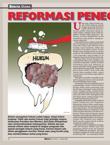 14 BERITAINDONESIA, 10 Mei 2007BERITA UTAMA14 BERITAINDONESIA, 10 Mei 2007Sistem penegakan hukum sudah bagus, tetapi belumlengkap. Tidak ada sanksi hukum bagi petinggi negara,khususnya Presiden dan Menteri, jika tidak melaporkanatau menyembunyikan kekayaannya. Sebaik apa punsebuah sistem akan lumpuh di tangan penguasa danaparat penegak hukum yang korup. Karena hukum adadalam genggaman mereka. Hanya sapu yang bersih yangbisa membersihkan lantai yang kotor.ang suap, ibarat bumbu masak, boleh dibilang identikdengan penyedap pelayananpublik. Boleh jadi aparat pelayanan publik, khususnya aparat penegak hukum, sebagian besar sudah ketagihan “bumbu sedap pelayanan.” Kebiasaan tersebut digambarkan sudahmembudaya, bagi pemberi, apalagi penerima uang suap.Kalau tidak percaya, silakan simak hasilsurvei Transparency International Indonesia (TII), tahun 2006. Menurut surveitersebut, aparat kepolisian, militer danperadilan menempati urutan teratasdengan rekor masing-masing 70, 55 dan53 persen. TII melakukan survei terhadap1.760 responden yang tersebar di 32kabupaten dan kota di seluruh Indonesia.Menurut Ketua Dewan Pengurus TII,Todung Mulia Lubis, para responden yangberprofesi pengusaha, terbelah di dalammemandang uang suap. Sebanyak 49persen responden setuju dengan praktiksuap dalam pelayanan publik. Yang setujupunya alasan sendiri—suap suatu yanglumrah ibarat memberi zakat, supayaurusan lancar dan lantaran gaji pegawainegeri kecil.Sedangkan responden yang tidak setuju(50%), juga punya alasan: merusak sistemdan menimbulkan biaya tinggi.Temuan lain TII, para responden (32%)mengandalkan Komisi PemberantasanKorupsi (KPK) untuk memerangi suapdan korupsi, menempati urutan pertama(32%). Andalan kedua, asosiasi bisnis(24%), andalan ketiga dan keempat, pers(16%) dan LSM (12%). Sedangkan polisidan tokoh agama masing-masing memperoleh kepercayaan 6% dan 3%.Sedangkan pihak KPK sendiri, menurutDeputi Pengawasan dan PengaduanMasyarakat, Junino Jahya, masih mengalami kendala internal, terutama sumberdaya yang terbatas. “Itu bisa ditutupi jikaaparat hukum lain bisa membantu,” kataJunino kepada Maruasas dari Berita Indonesia. Tetapi Junino mengamati, aparatkepolisian dan kejaksaan sampai saat inimasih menghadapi kesulitan. Ini, katanya,terlepas dari integritas para anggota.Beban mereka sangat banyak di dalampenyelesaian pidana umum.KPK juga masih mengeluhkan seranganbalik dari koruptor, dibikin repot olehpengaduan judicial review (uji materialUU) ke Mahkamah Konstitusi. Ada jugapendapat-pendapat di media massa yangmenyerang KPK. “Ini menambah bebanUREFORMASI PENE REFORMASI PENEGilustrasi: dendy
