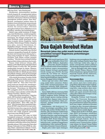 16 BERITAINDONESIA, 10 Mei 2007BERITA UTAMAKPK dan Polri,” kata Hendarman.Hendarman, menyampaikan jawabantertulis kepada BI, mengutarakan bahwapenegakan hukum juga perlu melakukanreformasi, khususnya reformasi di bidangpenanganan perkara pidana. Kata Hendarman, penanganan perkara harus dilakukan secara profesional, proporsional,transparan, akuntabel dan independen.Namun dia menyarankan reformasipenegakan hukum harus dilakukan secarabertahap, simultan dan berkelanjutan.Sistem yang sudah tersistem di Kejaksaan, kata Hendarman, melalui pengendalian penanganan perkara korupsi secaraberjenjang. dan dengan pengawasan melekat (Waskat) untuk mencegah aparatjaksa tergoda dalam lingkaran mafiaperadilan. Selain dengan Waskat, integritaspara jaksa, menurut Hendarman, ditingkatkan dengan “siraman rohani” berdasarkan ajaran agama yang mereka anut.Sebuah sumber yang tidak mau disebutnamanya mengatakan kepada BI, teladangerakan anti korupsi harus datang dari orang-orang terdepan di negeri, misalnyaPresiden, baik dalam ucapan maupuntindakan. “Mereka harus menjadi teladanbagi perilaku hidup sederhana dan bersih.Supaya tidak terkesan tebang pilih,katanya, perlu ditarik garis yang tegas antaratindak korupsi di masa lalu, dan gerakanpembersihan korupsi ke depan. Katanya,mesti dilakukan zero option atau semuanyadimulai dari titik nol. Sebaik apa pun sistemyang dibuat, katanya, akan sia-sia di tanganpara pelaku yang tidak bersih dan tidak jujur.Coba simak pernyataan Presiden SusiloBambang Yudhoyono ketika mulai menabuh genderang “perang” melawan korupsisampai detik ini. “Saya akan terus berjuang melawan korupsi dan mendengarkan koreksi dari rakyat untuk memberantas korupsi.” Pernyataan ini diikrarkanSBY, panggilan akrab Presiden Susilo, 27November, hanya sebulan setelah dilantiksebagai Presiden, Oktober 2004.Lantas dua tahun kemudian, 2 Agustus2006, SBY kembali mengikrarkan: “Pemberantasan korupsi harus dilakukansekarang juga dan jangan ditunda. Janganada pengecualian.” Ikrar SBY yang terbaru: “Saya berjanji akan membantu pimpinan BUMN yang dituduh korupsi padahal tidak korupsi atau yang merasa diadilioleh pers. Aparat penegak hukum dimintacermat dan tidak gegabah menyidikseseorang yang diduga korupsi.”Tentu pernyataan SBY yang ini tidakbermaksud menjawab “serangan pers danpublik” atas langkah dua menterinya, YusrilIhza Mahendra dan Hamid Awaluddin yangmembantu melicinkan aliran dana HutomoMandala sebesar USD 10 juta dari Putra dariBanque Nationale de Paris (PNB) ke rekening Dirjen Administrasi Hukum Umum,Departemen Hukum dan HAM. MS, SHDua Gajah Berebut HutanBenarkah jaksa dan polisi masih berebut lahanpenyidikan korupsi? Bagaimana perkembangankewenangannya?ublik masih ingat kasus PLNyang melibatkan Dirut PLNEddie Widiono, Septembertahun lalu. Kapolri JenderalSutanto didesak untuk memerintahkananak buahnya segera menuntaskankasus dugaan korupsi pembangkitlistrik tenaga gas (PLTG) Borangsenilai Rp 122 miliar itu. Namun,berkas-berkas yang disodorkan kepolisian kepada Kejaksaan Agung ditolakkarena dianggap belum lengkap.Belum lagi soal status cekal Eddieyang sudah habis sementara MabesPolri tidak memperpanjangnya dankejaksaan terkesan tidak mengantisipasi dengan membiarkan habis masacekal itu.Kasus Eddie akhirnya memang tidakberlanjut. Peristiwa ini sempat menimbulkan sangkaan kedua lembaga ituasyik dengan egonya masing-masing.Menimbulkan dugaan kalau kinerjakejaksaan dan kepolisian tidak profesional. Apalagi sampai ada kesanrebutan ‘lahan’.Sebelumnya, ada kontroversi ’rebutan’ kewenangan penyidikan kasuskorupsi tiga mantan direktur Bank Indonesia. Lalu ’perseteruan’ kedua korpspenegak hukum terdepan itu sesuaibebasnya Eng San, yang berujung padaditangkapnya lima jaksa atas tuduhanpemalsuan BAP. Konon kabarnya, halitu juga berkaitan dengan dituntutbebasnya Iwik - terdakwa tunggal kasuspembunuhan Udin wartawan Bernas -oleh Jaksa Penuntut Umum di Bantul.Begitu pula reaksi tajam kalangankejaksaan atas penangkapan lima jaksaoleh polisi (sebagai buntut kasus EngSan), beberapa waktu lalu, juga semakin menegaskan belum padunyadua lembaga penegak hukum tersebut.Hal ini disangkal oleh Jaksa AgungMuda Tindak Pidana Khusus (JAMPidsus) Kejaksaan Agung HendarmanSupandji kepada Berita Indonesia,sesungguhnya istilah itu tidak ada.Kewenangan BaruNamun demikian, tampaknya akanada aturan main baru untuk jaksa,yang diatur dalam Rancangan UndangUndang Kitab Hukum Acara Pidanayang baru, yang nantinya akan mempertajam kesan rebutan lahan itu.Salah satu pasal menarik dicermati,yakni jaksa diberi kewenangan menghentikan penuntutan.Mengutip Profesor Andi Hamzah,Ketua Tim Penyusun RancanganKUHAP, perkara yang dapat dihentikan penuntutannya antara lain perkarakecil atau ringan, pelakunya berumur70 tahun ke atas, ancaman pidananyatidak lebih dari lima tahun, serta untukyang kerugiannya sudah diganti.Dalam pasal 99 RUU KUHAP, jaksajuga diberi kewenangan melakukanpenyidikan. Pasal ini jelas menambahsemakin kental rasa sentimen di kalangan penegak hukum. Pasal itusekaligus mengaburkan prinsip pemisahan unsur criminal justice systemyang selama ini dianut; fungsi hakimmengadili, jaksa sebagai penuntut danPolri sebagai penyidik. RHPJaksa dan polisi sering terlibat konflik kewenangan.