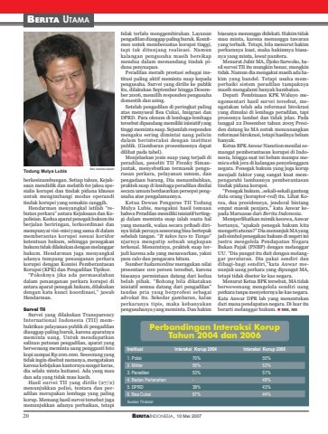 20 BERITAINDONESIA, 10 Mei 2007BERITA UTAMAberkesinambungan. Setiap tahun, Kejaksaan mendidik dan melatih 60 jaksa spesialis korupsi dan tindak pidana khususuntuk mengimbangi modus operanditindak korupsi yang semakin canggih.Hendarman menyangkal istilah “rebutan perkara” antara Kejaksaan dan Kepolisian. Kedua aparat penegak hukum ituberjalan beriringan, terkoordinasi danmempunyai visi-misi yang sama di dalammemberantas korupsi sesuai koridorketentuan hukum, sehingga penegakanhukum tidak dilakukan dengan melanggarhukum. Hendarman juga menyangkaladanya tumpang penanganan perkarakorupsi dengan Komisi PemberantasanKorupsi (KPK) dan Pengadilan Tipikor.“Pokoknya jika ada permasalahandalam penanganan perkara korupsi diantara aparat penegak hukum, dilakukandengan kata kunci koordinasi,” jawabHendarman.Survei TIISurvei yang dilakukan TransparencyInternational Indonesia (TII) membuktikan pelayanan publik di pengadilandianggap paling buruk, karena aparatnyameminta uang. Untuk mendapatkansalinan putusan pengadilan, aparat yangberwenang meminta uang pengganti fotokopi sampai Rp 200.000. Seseorang yangtidak ingin disebut namanya, mengatakankarena kebijakan kantornya sangat keras,dia selalu minta kuitansi. Ada yang maudan ada yang tidak mau kasih.Hasil survei TII yang dirilis (27/2)menunjukkan polisi, tentara dan peradilan merupakan lembaga yang palingkorup. Memang hasil survei tersebut jugamenunjukkan adanya perbaikan, tetapitidak terlalu menggembirakan. Layananpengadilan dianggap paling buruk. Komitmen untuk memberantas korupsi tinggi,tapi tak ditunjang realisasi. Namunkalangan pengusaha masih bersikapmendua dalam memandang tindak pidana penyuapan.Peradilan meraih prestasi sebagai institusi paling aktif meminta suap kepadapengusaha. Survei yang dirilis ke publikitu, dilakukan September hingga Desember 2006, memilih responden pengusahadomestik dan asing.Setelah pengadilan di peringkat palingatas menyusul Bea Cukai, Imigrasi danDPRD. Para oknum di lembaga-lembagatersebut dipandang memiliki inisiatif yangtinggi meminta suap. Sejumlah respondenmengaku sering dimintai uang pelicindalam berinteraksi dengan institusipublik. (Gambaran prosentasenya dapatdilihat pada tabel).Menjelaskan jenis suap yang terjadi diperadilan, peneliti TII Frenky Simanjuntak, menyebutkan termasuk pengurusan perkara, pelayanan umum, danpengadaan barang. Dia menambahkan,praktek suap di lembaga peradilan dinilaisecara umum berdasarkan persepsi pengusaha atas pengalamannya.Ketua Dewan Pengurus TII TodungMulya Lubis, mengakui hasil temuanbahwa Peradilan memiliki inisiatif tertinggi dalam meminta suap ialah suatu halyang menarik, walau secara pribadi dirinya tidak percaya seseorang bisa bertepuksebelah tangan. “It takes two to Tango”ujarnya mengutip sebuah ungkapanterkenal. Menurutnya, praktek suap terjadi karena ada yang menawarkan, yaknipara calo dan pengacara hitam.Sumber hukumonline meragukan nilaipresentase 100 persen tersebut, karenabiasanya permintaan datang dari keduabelah pihak. “Bohong bila dikatakaninisiatif semua datang dari pengadilan”tandas pria yang berprofesi sebagaiadvokat itu. Sekedar gambaran, kalauperkaranya tipis, maka kebanyakanpengusahanya yang meminta. Dan hakimbiasanya menunggu didekati. Hakim tidakmau minta, karena menunggu tawaranyang terbaik. Tetapi, bila menurut hakimperkaranya kuat, maka hakimnya biasanya yang minta, lewat panitera.Menurut Jubir MA, Djoko Sarwoko, hasil survei TII itu mungkin benar, mungkintidak. Namun dia mengakui masih ada hakim yang bandel. Tetapi usaha memperbaiki sistem peradilan tampaknyamasih mengalami banyak hambatan.Deputi Pembinaan KPK Waluyo mengomentari hasil survei tersebut, mengatakan telah ada reformasi birokrasiyang dimulai di lembaga peradilan, tapiprosesnya lambat dan tidak jelas. Padatanggal 22 Desember tahun 2005 Presiden datang ke MA untuk mencanangkanreformasi birokrasi, tetapi hasilnya belumbanyak.Ketua BPK Anwar Nasution menilai semangat pemberantasan korupsi di Indonesia, hingga saat ini belum mampu memicu efek jera di kalangan penyelenggaranegara. Penegak hukum yang juga korupmenjadi faktor yang sangat kuat mempengaruhi lambannya pemberantasantindak pidana korupsi.“Penegak hukum...sekali-sekali gantungdulu orang (koruptor-red) itu. Lihat Korea, dua presidennya, jenderal bintangempat masuk penjara,” kata Anwar kepada Maruasas dari Berita Indonesia.Memperlihatkan mimik kecewa, Anwarbertanya, “apakah penegak hukum kitamengerti aturan?” Dia menunjuk MA yangjadi simbol penegakan hukum di negeri inijustru mengelola Pendapatan NegaraBukan Pajak (PNBP) dengan melanggarUU. “Dia pungut itu duit dengan melanggar peraturan. Dia pakai sendiri dandibagi-bagi sendiri,”kata Anwar menunjuk uang perkara yang dipungut MA,tetapi tidak disetor ke kas negara.Menurut Ketua BPK tersebut, MA tidakberwewenang mengelola sendiri uangperkara tanpa menyetornya ke kas negara.Kata Anwar DPR lah yang menentukandari mana pendapatan negara. Di luar ituberarti melanggar hukum. MH, SHInstitusi Interaksi Korup 2004 Interaksi Korup 2006Perbandingan Interaksi KorupTahun 2004 dan 2006Todung Mulya Lubis foto: berindo wilson1. Polisi 70% 55%2. Militer 55% 53%3. Peradilan 53% 51%4. Badan Pertanahan - 48%5. DPRD 38% 43%6. Bea Cukai 67% 44%Sumber: TII diolah