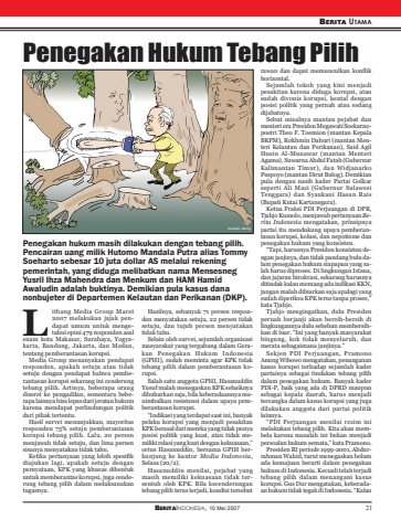 BERITAINDONESIA, 10 Mei 2007 21BERITA UTAMAPenegakan Hukum Tebang PilihPenegakan hukum masih dilakukan dengan tebang pilih.Pencairan uang milik Hutomo Mandala Putra alias TommySoeharto sebesar 10 juta dollar AS melalui rekeningpemerintah, yang diduga melibatkan nama MensesnegYusril Ihza Mahendra dan Menkum dan HAM HamidAwaludin adalah buktinya. Demikian pula kasus dananonbujeter di Departemen Kelautan dan Perikanan (DKP).itbang Media Group Maret2007 melakukan jajak pendapat umum untuk mengetahui opini 479 responden asalenam kota Makasar, Surabaya, Yogyakarta, Bandung, Jakarta, dan Medan,tentang pemberantasan korupsi.Media Group menanyakan pendapatresponden, apakah setuju atau tidaksetuju dengan pendapat bahwa pemberantasan korupsi sekarang ini cenderungtebang pilih. Artinya, beberapa orangdiseret ke pengadilan, sementara beberapa lainnya bisa lepas dari jeratan hukumkarena mendapat perlindungan politikdari pihak tertentu.Hasil survei menunjukkan, mayoritasresponden 75% setuju pemberantasankorupsi tebang pilih. Lalu, 20 persenmenjawab tidak setuju, dan lima persensisanya menyatakan tidak tahu.Ketika pertanyaan yang lebih spesifikdiajukan lagi, apakah setuju denganpernyataan, KPK yang khusus dibentukuntuk memberantas korupsi, juga cenderung tebang pilih dalam melaksanakantugasnya.Hasilnya, sebanyak 71 persen responden menyatakan setuju, 22 persen tidaksetuju, dan tujuh persen menyatakantidak tahu.Selain oleh survei, sejumlah organisasimasyarakat yang tergabung dalam Gerakan Penegakan Hukum Indonesia(GPHI), sudah meminta agar KPK tidaktebang pilih dalam pemberantasan korupsi.Salah satu anggota GPHI, HasanuddinYusuf malah menegaskan KPK sebaiknyadibubarkan saja, bila keberadaannya menimbulkan resistensi dalam upaya pemberantasan korupsi.“Indikasi yang terdapat saat ini, banyakpelaku korupsi yang menjadi pesakitanKPK berasal dari mereka yang tidak punyaposisi politik yang kuat, atau tidak memiliki relasi yang kuat dengan kekuasaan,”cetus Hasanuddin, bersama GPIH berkunjung ke kantor Media Indonesia,Selasa (20/2).Hasanuddin menilai, pejabat yangmasih memiliki kekuasaan tidak tersentuh oleh KPK. Bila kecenderungantebang pilih terus terjadi, kondisi tersebutrawan dan dapat memunculkan konflikhorizontal.Sejumlah tokoh yang kini menjadipesakitan karena diduga korupsi, atausudah divonis korupsi, kental denganposisi politik yang pernah atau sedangdijabatnya.Sebut misalnya mantan pejabat danmenteri era Presiden Megawati Soekarnopoetri Theo F. Toemion (mantan KepalaBKPM), Rokhmin Dahuri (mantan Menteri Kelautan dan Perikanan), Said AgilHusin Al-Munawar (mantan MenteriAgama), Suwarna Abdul Fatah (GubernurKalimantan Timur), dan WidjanarkoPuspoyo (mantan Dirut Bulog). Demikianpula dengan nasib kader Partai Golkarseperti Ali Mazi (Gubernur SulawesiTenggara) dan Syaukani Hasan Rais(Bupati Kutai Kartanegara).Ketua Fraksi PDI Perjuangan di DPR,Tjahjo Kumolo, menjawab pertanyaan Berita Indonesia mengatakan, prinsipnyapartai itu mendukung upaya pemberantasan korupsi, kolusi, dan nepotisme danpenegakan hukum yang konsisten.“Tapi, harusnya Presiden konsisten dengan janjinya, dan tidak pandang bulu dalam penegakan hukum siapapun yang salah harus diproses. Di lingkungan Istana,dan jajaran birokrasi, sekarang harusnyaditindak kalau memang ada indikasi KKN,jangan malah dibiarkan saja apalagi yangsudah diperiksa KPK terus tanpa proses,”kata Tjahjo.Tjahjo mengingatkan, dulu Presidenpernah berjanji akan bersih-bersih dilingkungannya dulu sebelum membersihkan di luar. “Ini yang banyak masyarakatbingung, kok tidak menyeluruh, danmerata sebagaimana janjinya.”Sekjen PDI Perjuangan, PramonoAnung Wibowo mengatakan, penanganankasus korupsi terhadap sejumlah kaderpartainya sebagai tindakan tebang pilihdalam penegakan hukum. Banyak kaderPDI-P, baik yang ada di DPRD maupunsebagai kepala daerah, harus menjaditersangka dalam kasus korupsi yang jugadilakukan anggota dari partai politiklainnya.“PDI Perjuangan menilai rezim inimelakukan tebang pilih. Kita akan membela karena masalah ini bukan menjadipersoalan hukum semata,” kata Pramono.Presiden RI periode 1999-2001, Abdurrahman Wahid, turut menegaskan belumada kemajuan berarti dalam penegakanhukum di Indonesia. Kecuali telah terjaditebang pilih dalam menangani kasuskorupsi. Gus Dur mengatakan, keberadaan hukum tidak tegak di Indonesia. “KalauLilustrasi: dendy