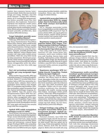 24 BERITAINDONESIA, 10 Mei 2007BERITA UTAMAsumber daya manusia karena keterbatasan tempat. Kalau kita mau merekruttenaga 100 orang, misalnya, mau kitataruh dimana? Tempat kita terbatas.Kedua, di UU tentang KPK mengamanatkan bahwa penyidik hanya bisa darikepolisian dan kejaksaan. Sementarakepolisian dan kejaksaan sendiri punyaketerbatasan, tentunya orang-orangterbaik akan mereka manfaatkan sendiri.Kalau dibuka peluang non polisi dan jaksamenjadi penyidik, prediksi kita, akanmembuat KPK lebih berdaya.Tetapi bukankah penyidik membutuhkan keahlian khusus?Tidak juga. KPK tidak boleh mengeluarkan Surat Pemberhentian PenyidikanPekara (SP3). Berarti, kalau sudah beradadalam tahap penyidikan harus sampaipada tahap penuntutan. Strategi yang kitalakukan, penyidikannya yang kita intensifkan. Ternyata, penyidik-penyidik kitamampu. Buktinya, semua (dugaan kasuskorupsi-red) yang sudah masuk prosespenyidikan, tidak ada yang tidak masukke tahap penuntutan. Berarti para penyidik kita sudah mampu menjadi penyidik.Akan tetapi, karena penyidik kita terbatas(hanya menggunakan polisi dan jaksared), kasus yang bisa kita sidik jugaterbatas.Dari sisi perundang-undangan,kendala apa yang menganjal tugasKPK?Selain sumber daya penyidik, KPK jugaterkendala dengan UU tentang Kerahasiaan Bank. Dalam UU tersebut tidak dicantumkan bahwa KPK bisa menembus kerahasiaan bank, walupun diatur bahwaperbankan harus bekerja sama denganKPK. UU perpajakan juga demikian. Datadata perpajakan sangat bermanfaat buatkita, karena berhubungan langsung dengan LHKPN. Juga ada aturan yangmengamanatkan bahwa KPK bisa menyita, tetapi tidak bisa menggeledah.Artinya, kalau menggledah harus mendapat izin dari Pengadilan Negeri (PN).Selama ini memang tidak ada kendalayang berarti untuk mendapatkan izin dariPN, cuma agak unik karena bisa menyitatetapi tidak bisa menggeldah.Apakah KPK sudah mengajukanpentingnya revisi UU KPK?Secara formal, kita tentunya tidak bisa,karena itu domain eksekutif dan legislatif.Tetapi, secara informal kita sudah mengajukannya berkali-kali, baik kepadaPresiden maupun Komisi III DPR. Dalamsetiap kali pertemuan, semisal RapatDengar Pendapat (RDP), kita sampaikanitu, tapi sampai saat ini belum terwujud.Bahkan dari awal KPK berdiri pun, begitumenemukan kendala-kendala, sudah kitasampaikan. Hanya saja, kita tidak menunggu itu dalam bekerja.Apakah KPK menyadari bahwa dimata masyarakat KPK itu sangathebat. Dan itu berbahaya jika kelakKPK tidak mampu mewujudkanharapan itu?Oh ya. Harapan masyarakat terlalubesar mengakibatkan mereka melihat apayang dilakukan KPK sangat kecil. Tapi, dijaman sebelum KPK, ada nggak gubernurmasuk penjara, bupati masuk penjara,mantan menteri dan mantan hakim ataumantan panitera masuk penjara?Bagaimana tanggapan KPK padaputusan hakim yang ringan. Contohnya mantan Gubernur Kalimantan Timur Suwarna A.F yang divonis kurang dari tiga tahun penjara?Tapi yang seperti ini hanya kasusSuwarna A.F saja. Kasus-kasus lain,umumnya, justru para terdakwa tidakmau naik banding. Karena kalau naikbanding, hukumannya justru ditambaholeh Pengadilan Tinggi, dan ditambah lagioleh Mahkamah Agung. Banyak di antaraterdakwa yang kita bawa ke pengadilan,menyerah ketika putusan pengadilannegeri dijatuhkan.Bagaimana pandangan KPK terhadap kinerja Pengadilan TindakPidana Korupsi (Tipikor)?Kendalanya juga ada. Majelis Tipikorcumadua, dan adanya hanya di JakartaPusat. Bayangkan ketika kita menanganikasus Bupati Dompu dan Gubernur Aceh,kita harus membawa saksi dan dokumandari sana. Kita tidak bermaksud agarPengadilan Tipikor ada di sana, tetapimisalnya majelisnya bisa ditambah.Bayangkan dua majelis, masing-masinglima hakim, menangani sekian puluhperkara. Tahun lalu, KPK mengajukan 27kasus. Mana ada Pengadilan Negeri yangmampu menyelesaikan kasus korupsisebanyak itu. Jadi kita bisa sidang sampaimalam. Dalam satu hari, satu majelis bisasampai tiga kali sidang. Itu luar biasa,tetapi katanya justru mau dihapus.Sebagai lembaga yang paling diharapkan masyarakat dalam pemberantasan korupsi, apakah penyidik-penyidik KPK sendiri bersihdari korupsi?Namanya manusia, saya tidak bisamengatakan begitu (bersih dari korupsired). Kita menjaga dan mencegah supayaitu tidak terjadi. Kita kan nggak tau isihati orang. Untuk mencegahnya, kita buataturan, batasan, kode etik, dan aturanpegawai. Bahwa dari situ masih ada yanglolos, itu manusiawi sekali.Dalam mempekerjakan penyidikPolri dan Kejaksaan di KPK, bagaimana prosedurnya?KPK meminta kepada Polri dan Kejaksaan dengan kriteria tertentu, laludiuji. Kita membutuhkan penyidik dengankriteria lebih. Jadi dalam tes tersebut,tidak semua lolos. Misalnya, beberapawaktu lalu ada 20 jaksa yang direkomendasikan Kejaksaan, yang lolos hanya 4orang.Terbangunnya mafia peradilanmembuat pemberantasan korupsisemakin sulit. Sudah sejauh manalangkah KPK memberantas korupsidi lingkungan penegak hukum?Kita akan berjalan terus. Sampai saatini, sudah beberapa kasus gratifikasi (suapdi kalangan penegak hukum-red) yangberhasil dibongkar KPK. Tetapi harusdiakui, membuktikan tindak pidanagratifikasi itu sangat sulit. Bagaimanakalau hal itu terjadi di kamar hotel, kitatidak tahu. Kita tidak bisa membuktikan,kecuali tertangkap tangan. Di sinilahperan serta masyarakat. Terbongkarnyapenyuapan panitera Pengadilan NegeriJakarta Pusat oleh pengacara AbdullahPuteh, misalnya, semata-mata karenalaporan masyarakat—sampai sekarangkita tidak tahu siapa yang melapor. Tapilaporannya sangat akurat dan langsungkita tindak lanjuti, Alhamdulillah berhasil.Apa resep jitu yang akan digunkanKPK dalam memberantas mafiaperadilan ini?Kita terlebih dahulu mempelajari polapola kerja mereka (para penegak hukumred). Lalu kita menunggu momentumuntuk menangkap mereka. Di sinilahperlunya peran masyarakat. „ MH, SH