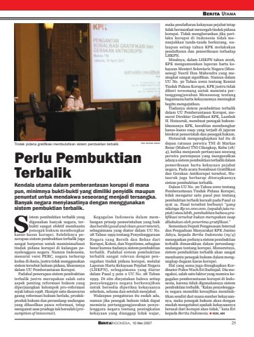 BERITAINDONESIA, 10 Mei 2007 25BERITA UTAMAPerlu PembuktianTerbalikKendala utama dalam pemberantasan korupsi di manapun, minimnya bukti-bukti yang dimiliki penyidik maupunpenuntut untuk mendakwa seseorang menjadi tersangka.Banyak negara menyiasatinya dengan menggunakansistem pembuktian terbalik.istem pembuktian terbalik yangdigunakan banyak negara, terbukti sangat efektif membantupenegak hukum membongkarkasus-kasus korupsi. Selebihnya penerapan sistem pembuktian terbalik jugasangat berperan untuk meminimalisasitindak pidana korupsi di kalangan penyelenggara negara. Namun Indonesia,menurut versi PERC, negara terkorupkedua di dunia, justru tidak menggunakansistem tersebut hukum pidana, khususnyadalam UU Pemberantasan Korupsi.Padahal penerapan sistem pembuktianterbalik justru merupakan salah satuaspek penting reformasi hukum yangdiperjuangkan kelompok pro-reformasisejak tahun 1998. Hampir satu dasawarsagaung reformasi hukum berlalu, produkproduk hukum dan perundang-undanganyang dihasilkan pasca reformasi, tetapmenganut asas praduga tak bersalah (presumption of innocence).Kegagalan Indonesia dalam membangun prinsip pemerintahan yang baikdan bersih (good and clean government),sebagaimana yang diatur dalam UU No.28 Tahun 1999 tentang PenyelenggaraanNegara yang Bersih dan Bebas dariKorupsi, Kolusi, dan Nepotisme, sebagianbesar karena tiadanya sistem pembuktianterbalik. Padahal sistem pembuktianterbalik sangat relevan dengan pencegahan tindak pidana korupsi, melaluiLaporan Harta Kekayaan Pejabat Negara(LHKPN), sebagaimana yang diaturdalam Pasal 5 poin 2 UU No. 28 Tahun1999. Di situ dinyatakan bahwa setiappenyelenggara negara berkewajibanuntuk bersedia diperiksa kekayaanyasebelum, selama dan setelah menjabat.Walaupun pengaturan itu sudah ada,namun jika penegak hukum tidak dapatmeminta pertanggungjawaban penyelenggara negara tentang peningkatankekayaan yang dianggap tidak wajar,maka pendaftaran kekayaan pejabat tetaptidak bermanfaat mencegah tindak pidanakorupsi. Tidak mengherankan jika perilaku korupsi di Indonesia tidak menunjukkan tanda-tanda berkurang, walaupun setiap tahun KPK melakukanpendaftaran dan pemeriksaan terhadapLHKPN.Misalnya, dalam LHKPN tahun 2006,KPK mengumumkan laporan harta kekayaan Menteri Sekretaris Negara (Menseneg) Yusril Ihza Mahendra yang meningkat sangat signifikan. Namun dalamUU No. 30 Tahun 2002 tentang KomisiTindak Pidana Korupsi, KPK justru tidakdiberi wewenang untuk meminta pertanggungjawaban Mensesneg tentangbagaimana harta kekayaannya meningkatbegitu mengejutkan.Tiadanya sistem pembuktian terbalikdalam UU Pemberantasan Korupsi, menurut Direktur Gratifikasi KPK, LambokH. Hutauruk, membuat penegak hukumkhususnya KPK, kesulitan membongkarkasus-kasus suap yang terjadi di jajaranbirokrat pemerintah dan penegak hukum.Hutauruk mengungkapkan hal itu didepan ratusan perwira TNI di MarkasBesar (Mabes) TNI Cilangkap, Rabu (18/4), ketika menjawab pertanyaan seorangperwira perempuan yang mengusulkanadanya sistem pembuktian terbalik dalampemeriksaan harta kekayaan pejabatnegara. Pada acara Sosialisasi Gratifikasidan Gerakan Antikorupsi tersebut, Hutauruk juga berharap diterapkannyasistem pembuktian terbalik.Dalam UU No. 20 Tahun 2001 tentangPemberantasan Tindak Pidana Korupsi,tidak mengatur satu pasal pun tentangpembuktian terbaik kecuali pada Pasal 12ayat 1a. Pasal tersebut berbunyi “yangnilainya Rp 10.000.000. (sepuluh juta rupiah) atau lebih, pembuktian bahwa gratifikasi tersebut bukan merupakan suapdilakukan oleh penerima gratifikasi.”Sementara Deputi Pengawasan Internaldan Pengaduan Masyarakat KPK JuninoJahya, kepada Berita Indonesia (19/4)menegaskan perlunya sistem pembuktianterbalik dimasukkan dalam perundangundangan tentang korupsi. Menurutnya,sistem pembuktian terbalik akan sangatmembantu penegak hukum dalam mengungkap dugaan kasus korupsi.Hal yang sama juga diungkapkan Kordinator Police Wach Eri Sudrajad. Dia mengakui, salah satu faktor yang memicu kegagalan pemberantasan korupsi di Indonesia, karena tidak digunakannya sistempembuktian terbalik. “Kalau penyelenggara negara memiliki kewajiban membuktikan sendiri dari mana sumber kekayaannya, maka penegak hukum akan denganmudah mengetahui apakah kekayaannyaberasal dari korupsi atau tidak,” kata Erikepada Berita Indonesia. MH, SHSfoto: berindo wilson Tindak pidana gratifikasi membutuhkan sistem pembuktian terbalik.