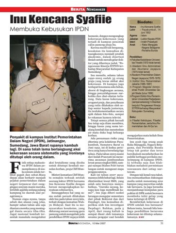 BERITAINDONESIA, 10 Mei 2007 31Inu Kencana SyafiieMembuka Kebusukan IPDNPenyakit di kampus Institut PemerintahanDalam Negeri (IPDN), Jatinangor,Sumedang, Jawa Barat rupanya kambuhlagi. Di sana telah lama berlangsung aksikekerasan secara sistematis yang ironisnyaditutupi oleh orang dalam.isik setiap mahasiswa IPDN dalam penampilannya di muka umum selalu terlihat gagah dan sehat.Masadepan akan berkarir menjadipejabat pemerintahan dalamnegeri terpancar dari sunggingan senyum manis mereka,terlebih apabila sedang pulangkampung ke daerah asal pengirimnya.Namun siapa nyana, tanpasebab dan alasan yang jelas,hampir saban tahun ada sajadiantara mereka yang meninggal dunia secara tiba-tiba.Jagat nasional kembali tersentak manakala mengetahuiaksi brutalisme yang dicobauntuk ditutupi kembali menelan korban, praja Cliff Muntu.Misteri kematian Cliff Muntu semakin terkuak setelahseorang lektor IPDN bernamaInu Kencana Syafiie denganberani mengungkapkan kenyataan sebenarnya.Sesungguhnya hal yang sama sudah pernah dilakukanoleh Inu pada tahun 2003 lalu,terkait dengan kematian Wahyu Hidayat. Saat itu ia menyuarakan kesaksian, yangdidorong nurani seorang gurupamong untuk mengubah polapendidikan IPDN supaya lebihhumanis, dengan mengungkapkekerasan-kekerasan yangterjadi di kampus pencetakcalon pamong praja itu.Karena masih tak bergaung,kesaksian itu kemudian dituangkannya menjadi produkakademis, dalam disertasiilmiah untuk meraih gelar doktor yang diberinya judul, “Pengawasan Kinerja STPDN terhadap Masyarakat KabupatenSumedang”.Inu menulis, selama tahun1990-2005 sudah 35 orangpraja yang tewas akibat aksikekerasan. Di kampus jugaterdapat fenomena seks bebas,aborsi di lingkungan asrama,hingga penyalahgunaan narkotika dan obat-obatan terlarang. Data kasus kekerasan,arogansi praja, dan penyiksaanyang rutin dilakukan oleh setiap senior kepada juniornya,itu terdokumentasikan secaraapik dalam foto-foto, sampaike rekaman kamera televisi.Tetapi semua pihak kecualiInu tetap saja diam membisu,hingga kasus yang sama terulang kembali dan meneteskanair mata duka bagi keluargakorban.Ada persamaan risiko yangditerima pria kelahiran Payakumbuh, Sumatera Barat 15Juni 1952, ini di kedua peristiwa yang hanya berselang tigatahun. Pada tahun 2003 suamidari Indah Praseyati ini menerima ancaman pembunuhanlewat pesan singkat SMS, sampai-sampai Mabes Polri turuntangan untuk mengusut siapapengancamnya.Kali ini tahun 2007 ancamannya lebih hebat lagi. Selaindiintimidasi lewat SMS, yangsalah satu bunyinya menyebutkan, “Guruku sayang, kenapa kau tega memfitnah kami?”, Inu juga diberi sanksilarangan mengajar sementaradari pihak Rektorat dan dariDepdagri. Inu kemudian diperiksa oleh tim investigasiDepdagri. Bahkan, pada 5April, dari ruang kuliah iasempat diusir oleh temannyasesama pengajar saat hendakmengajarkan mata kuliah IlmuPemerintahan.Inu ayah tiga orang anakRaka Manggala, Nagara Belagama, dan Periskha Bundatetap tak gentar dan terusbersikukuh membeberkan kepublik berbagai perilaku menyimpang di kampus IPDN.Ia terbuka saja dan blakblakan meladeni permintaanwawancara dari setiap wartawan.Dengan tak kenal rasa takut,Inu memanfaatkan dukunganmedia untuk menentang aruskampus yang mayoritas sudahtak bersuara. Ia juga bersediamenjambangi kumpulan parapolitisi di DPR untuk bersuaramembuka tabir gelap yanglama tertutupi di IPDN.Berakhirkah kekerasan diIPDN setelah Inu bersuara?Belum tentu, kecuali bila lembaga pendidikan beraromakekerasan ini ditutup selamalamanya. HTFNama : Inu Kencana SyafiieLahir : Payakumbuh, 14Juni 1952Agama : IslamJabatan : Lektor Kepala IPDNIsteri : Indah PrasetyatiAnak : -Raka Manggala -Nagara Belagama -Periskha BundaPendidikan: Fakultas Kedokteran Universitas Trisakti (1972-tidak tamat) Akademi Ilmu Administrasidan Akuntansi Jayapura(1975-tidak tamat) Akademi Pmerintahan DalamNegeri Jayapura (1976-1979) Institut Ilmu PemerintahanJakarta (1985-1987) Program Magister Administrasi Publik Universitas Gajah Mada (lulus 1990) Program Doktor Ilmu Pemerintahan Universitas Padjadjaran(sampai sekarang) Disertasiberjudul: Pengawasan KinerjaSTPDN terhadap MasyarakatKabupaten Sumedang.Buku: Filsafat Kehidupan, FilsafatPemerintahan, serta Ilmu Pemerintahan dan Al-Qur’an.Biodata:BERITA NEWSMAKER