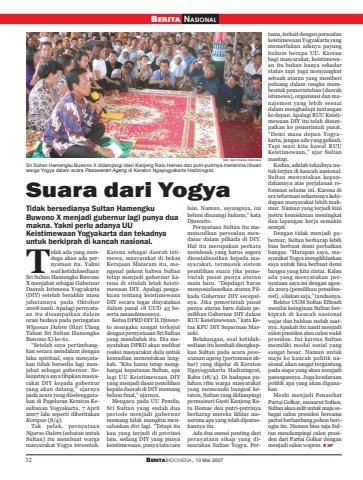 32 BERITAINDONESIA, 10 Mei 2007BERITA NASIONALSuara dari YogyaTidak bersedianya Sultan HamengkuBuwono X menjadi gubernur lagi punya duamakna. Yakni perlu adanya UUKeistimewaan Yogyakarta dan tekadnyauntuk berkiprah di kancah nasional.idak ada yang menduga akan ada pernyataan itu. Yaknisoal ketidaksediaanSri Sultan Hamengku BuwonoX menjabat sebagai GubernurDaerah Istimewa Yogyakarta(DIY) setelah berakhir masajabatannya pada Oktober2008 nanti. Apalagi pernyataan itu disampaikan dalamorasi budaya pada peringatanWiyosan Dalem (Hari UlangTahun Sri Sultan HamengkuBuwono X) ke-61.“Setelah saya pertimbangkan secara mendalam denganlaku spiritual, saya menyatakan tidak bersedia lagi menjabat sebagai gubernur. Selanjutnya saya titipkan masyarakat DIY kepada gubernuryang akan datang,” ujarnyapada acara yang diselenggarakan di Pagelaran Keraton Kesultanan Yogyakarta, 7 April2007 lalu seperti diberitakanKompas (8/4).Tak pelak, pernyataanNgarso Dalem (sebutan untukSultan) itu membuat wargamasyarakat Yogya tersentak.Karena sebagai daerah istimewa, masyarakat di bekasKerajaan Mataram itu, mengenal pakem bahwa Sultantetap menjadi gubernur karena di situlah letak keistimewaan DIY. Apalagi pengakuan tentang keistimewaanDIY secara tegas dinyatakandalam pasal 18 UUD 45 beserta amandemennya.Ketua DPRD DIY H.Djuwarto mengaku sangat terkejutdengan pernyataaan Sri Sultanyang mendadak itu. Dia menyatakan DPRD akan melihatreaksi masyarakat dulu untukkemudian menentukan langkah. “Kita harus tetap menghargai keputusan Sultan, apalagi UU Keistimewaan DIYyang menjadi dasar pemilihankepala daerah di DIY memangbelum final,” ujarnya.Mengacu pada UU Pemilu,Sri Sultan yang sudah duaperiode menjadi gubernurmemang tidak mungkin mencalonkan diri lagi. “Tetapi itukan yang terjadi di provinsilain, sedang DIY yang punyakeistimewaan, punya tata caralain. Namun, sayangnya, inibelum dinaungi hukum,” kataDjuwarto.Pernyataan Sultan itu memunculkan persoalan mendasar dalam pilkada di DIY.Hal itu merupakan perkaramendesak yang harus segeradisosialisasikan kepada masyarakat, termasuk sistempemilihan suara jika pemerintah pusat punya aturanmain baru. “Depdagri harusmenyosialisasikan aturan Pilkada Gubernur DIY secepatnya. Jika pemerintah pusatpunya aturan baru dalam pemilihan Gubernur DIY dalamRUU Keistimewaan,” kata Ketua KPU DIY Suparman Marzuki.Belakangan, soal ketidaksediaan itu kembali diungkapkan Sultan pada acara pesowanan ageng (pertemuan akbar) yang digelar di KeratonNgayogyakarta Hadiningrat,Rabu (18/4). Di hadapan puluhan ribu warga masyarakatyang memenuhi bangsal keraton, Sultan yang didampingipermaisuri Gusti Kanjeng Ratu Hemas dan putri-putrinyaberharap mereka ikhlas menerima apa yang telah diputuskannya itu.Ada dua esensi penting daripernyataan sikap yang disuarakan Sultan Yogya. Pertama, terkait dengan persoalankeistimewaan Yogyakarta yangmemerlukan adanya payunghukum berupa UU. Karenabagi masyarakat, keistimewaan itu bukan hanya sekadarstatus tapi juga menyangkutsebuah aturan yang memberipeluang dalam rangka membentuk pemerintahan (daerahistimewa), organisasi dan manajemen yang lebih sesuaidalam menghadapi tantanganke depan. Apalagi RUU Keistimewaan DIY itu telah disampaikan ke pemerintah pusat.“Demi masa depan Yogyakarta, jangan ada yang gelisah.Tapi mari kita kawal RUUKeistimewaan,” ujar Sultanmantap.Kedua, adalah tekadnya untuk terjun di kancah nasional.Sultan menyatakan kegundahannya atas perjalanan reformasi selama ini. Karena diera reformasi seharusnya kehidupan masyarakat lebih makmur. Namun yang terjadi kinijustru kemiskinan meningkatdan lapangan kerja semakinsempit.Dengan tidak menjadi gubernur, Sultan berharap lebihbisa berbuat demi perbaikanbangsa. “Harapan saya, masyarakat Yogya mengikhlaskansaya untuk bisa berbuat demibangsa yang kita cintai. Kalauada yang menyatakan pernyataan saya ini dengan agenda 2009 (pemilihan presidenred) , silakan saja,” tandasnya.Rektor UGM Sofian Effendimenilai keinginan Sultan berkiprah di kancah nasionalwajar dan bahkan sudah saatnya. Apakah itu nanti menjadicalon presiden atau calon wakilpresiden. Ini karena Sultanmemiliki modal sosial yangsangat besar. Namun untukmaju ke kancah politik nasional, akan sangat tergantungpada siapa yang akan menjadipasangannya. Juga kendaraanpolitik apa yang akan digunakan.Meski menjadi PenasihatPartai Golkar, menurut Sofian,Sultan akan sulit untuk maju sebagai calon presiden bersamapartai berlambang pohon beringin itu. Namun bisa saja Sultan mendampingi calon presiden dari Partai Golkar denganmenjadi calon wapres. SPTSri Sultan Hamengku Buwono X didampingi isteri Kanjeng Ratu Hemas dan putri-putrinya menerima ribuanwarga Yogya dalam acara Pesowanan Ageng di Keraton Ngayogyakarta Hadiningrat.foto: repro media indonesia