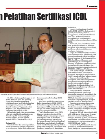 BERITAINDONESIA, 10 Mei 2007 35LENTERAn Pelatihan Sertifikasi ICDLDi akhir pelatihan, pada tanggal 17-18Maret diadakan ujian dan 38 orangdinyatakan lulus menyelesaikanpelatihan dengan hasil baik. Sedangkanseorang peserta, berasal dari BPKBDaerah Instimewa Yogyakarta yakniNugroho Tyas, dinyatakan belummenyelesaikan seluruh modul.Rekapitulasi hasil ujian menunjukkan,nilai rata-rata Module 1 adalah 90,32,Module 2 91,66, Module 3 92,58,Module 4 93,92, Module 5 92,66,Module 6 89,87, dan Module 7 93,13.Tentang ICDLPara instruktur dan asisten pelatihan,sehari-hari bekerja sebagai pengajar diICDL Al-Zaytun Global Information andCommunication Technology (ICDLAGICT).ICDL-AGICT didirikan tahun 2002.Pada 3 Januari 2003 ICDL-AGICTberhasil mendapatkan akreditasi darikantor pusat ICDL, di London, Inggrissebagai test centre yang pertama untukseluruh kawasan Indonesia.Pada bulan Desember 2006 ICDLLicensee in Indonesia, atau ICDLAGICT, sebagai perpanjangan tangankantor pusat ICDL di Indonesia,berhasil membangun kesepakatankerjasama dengan Direktorat JenderalPendidikan Luar Sekolah, Depdiknas,untuk memberikan pelatihan-pelatihanpenguasaan komputer, kepada unit-unitpelaksana teknis daerah pendidikannonformal.Dengan akreditasi yang dimilikiitulah, ICDL-AGICT berhak merekrutpeserta, melakukan pelatihanmenggunakan silabus dan kurikulumdari ICDL, serta melaksanakanserangkaian tes kepada pesertapelatihan untuk mendapatkan sertifikasiICDL.Termasuk, pada bulan Maret 2007tadi, Al-Zaytun melakukan pelatihansertifikasi ICDL bagi para pegawai unitpelaksana teknis pendidikan luarsekolah se Indonesia.Dirjen Pendidikan Luar Sekolah AceSuryadi mengatakan, pilihan atas ICDLsebagai lembaga akreditasi/sertifikasiliterasi komputer di lingkungan DitjenPLS, Depdiknas, didasarkan padapertimbangan, ICDL merupakanlembaga independen yang telah diakuisecara luas oleh banyak negara danberbagai organisasi internasional sepertiUNESCO, UNDP, dan Uni Eropa.ICDL diakui sebagai benchmarkinternasional untuk keterampilankomputer, sama persis halnya denganTOEFL untuk pelatihan bahasa Inggris.Kata Ace, literasi komputermerupakan salah satu strategi dalammenghadapi tantangan globalisasi,dengan menyiapkan programPendidikan Kecakapan Hidup (LifeSkills) di bidang Teknologi Informasidan Komunikasi (TIK).Kebijakan literasi komputerdimaksudkan untuk mendorongmasyarakat mengenal, memahami, danmampu menggunakan komputer atauTIK baik itu untuk keperluan yangberkaitan dengan pekerjaan, maupunpembelajaran dan aktivitas lainnya.Caranya, mengembangkan semualembaga UPT/Daerah PendidikanNonformal menjadi lembaga ICDL TestCenter, selanjutnya meningkat menjadiICDL Training Center.Kehadiran ICDL di Indonesia diwakilioleh MYR Agung Sidayu, dari YayasanPesantren Indonesia (YPI), duduksebagai Chairman of the ICDL Licenseein Indonesia. Sedangkan Chris Evdemonduduk sebagai Chief Executive Officer(CEO) ICDL Asia Pasific.Menurut Chris, ICDL adalah standarglobal yang memberikan sertifikasiuntuk mengukur kompetensi penggunaS Depdiknas, Ace Suryadi bertukar naskah kerjasama membangun pendidikan nonformal. foto: dok