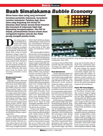 BERITAINDONESIA, 10 Mei 2007 41BERITA EKONOMIBuah Simalakama Bubble EconomyAliran besar dana asing yang memasukiinvestasi portofolio Indonesia, berpotensimemicu turbulensi. Fatalnya lagi, danadana yang tergolong hot money inibiasanya akan keluar secara besar-besaranjika investasi di Indonesia tidak lagidipandang menguntungkan. Jika hal initerjadi, perekonomian secara umum akanmengalami kejutan (shock) dan tidakjarang menjadi pemicu krisis.ana asing yang terus mengalir ke investasi portofolioIndonesia, telahmemicu perbedaan pendapatdi antara pelaku ekonomi danpara pengamat. Pada satu sisi,aliran dana asing ini dapatdipahami sebagai wujud kepercayaan investor asing yangmemandang perekonomianIndonesia memiliki prospekyang semakin baik. Namun disisi lain, hal itu sangat berpotensi menjadi ancaman untuk menghancurkan perekonomian Indonesia, bila manadana asing itu keluar dariinvestasi portofolio secaraserempak.Menguasai SetengahSaham di BEJKalangan pelaku ekonomimenilai aliran investasi portofolio asing, masih dalam batasbatas yang wajar. Jika dilihatdari IHSG yang terus melambung menuju angka 2.000,kebanyakan dipengaruhi naiknya harga saham perusahaanperusahaan berbasis sumberdaya alam seperti perusahaanperusahaan tambang, migasdan perkebunan. Sementaraaliran investasi asing ke SuratUtang Negara (SUN), Sertifikat Bank Indonesia (SBI),dan obligasi, karena masingmasing jenis investasi itu masih menguntungan di Indonesia dibanding dengan negaranegara lain.Namun demikian, kalanganekonom tidak sepakat terhadap pandangan para pelakubisnis tersebut. Menurut mereka, aliran dana ke investasipotofolio sudah berada padatitik yang mengkhawatirkan.Selain tidak didukung denganperkembangan yang setara disisi fundamental ekonomi,kinerja perusahaan-perusahaan yang listing di BEJ jugatidak merefleksikan debutISGH.Hal yang mengkhawatirkan,jika investor-investor asing itumerasa investasi portofolio diIndonesia tidak menguntungkan lagi, tentu akan membawakeluar investasinya menujunegara-negara yang lebih menguntungkan. Pada saat itulahaliran keluar (pull out) investasi asing menimbulkangoncangan yang besar, bahkantidak sedikit yang memperkirakan memicu krisis keuangan yang cukup dahsyat.Hingga saat ini, investasiasing yang ditempatkan di SBIhampir mencapai 10% dari total dana SBI yang pertengahanApril 2007 mencapai Rp 253triliun. Dana asing ini jugamenunjukkan pegerakan yangcukup signifikan, dari Rp 18triliun pada Desember 2006menjadi Rp 22,22 triliun padaApril 2007. Sementara danaasing yang ditempatkan diSurat Utang Negara (SUN),mencapai Rp 67 triliun padaMaret 2007. Dana ini jugameningkat signifikan dari posisi Desember 2006 yang masih sebesar Rp 55 triliun.Tetapi yang paling mengkhawatirkan adalah posisidana asing yang diinvestasikanpada saham-saham di BEJ.Hingga Maret 2007, dari totalkepemilikan saham di BEJyang sebesar Rp 745,16 triliun,proporsi dana asing mencapaiRp 510,74 triliun atau lebihdari separuh. Posisi ini tentusangat mengkhawatirkan, karena bila investasi di BEJ tidakmenarik lagi dan mendoronginvestasi itu keluar, akanmengakibatkan BEJ rontok.Buah SimalakamaAnalisa ekonomi seperti inimemang tidak berlebihan. Krisis ekonomi yang menghantamAsia pada pertengahan 1997,juga ditengarai hal serupa. DiIndonesia, krisis moneter(krismon) dipicu capital outflow, yakni keluarnya danainvestasi dari seluruh investasiportofolio, karena para investor memandang sangat berbahaya jika terus mempertahankan investasinya di negarayang sedang mengalami kegoncangan ekonomi.Kekhawatiran pengulangankrisis seperti inilah yang membayangi banyak ekonom, hingga meminta BI lebih berhati-hatimemenej kebijakan moneternya. BI sendiri sudah menunjukkan arah kebijakan moneteryang kaku. Hal ini terlihat jelasdari penetapan Suku BungaAcuan BI (BI rate) yang dipertahankan pada kisaran 9%.Jika berpijak pada tingkatlaju inflasi, yang menjadi dasarpenetapan suku bunga, makaBI Rate sebesar 9% sudah sangat terlalu tinggi. Laju inflasiyang saat ini berada pada kisaran 6,5%, sebenarnya menjadi momentum menurunkanBI Rate hingga 8% sampai7,5%. Akan tetapi jika BI menyesuaikan tingkat suku bunganya pada laju inflasi, dikhawatirkan akan mendorongpelarian modal (capital outflow) yang berpotensi memicudistabilitas moneter. Dalamhal ini BI seperti berhadapandengan buah simalakama.Sektor Rill Tetap StagnanWalau di satu sisi kebijakanBI diarahkan menjaga stabilitas moneter dengan tingkatsuku bunga tinggi, namun disisi lain telah mengorbankankinerja sektor riil. BI Rate yangmenjadi acuan bagi penetapansuku bunga kredit dan biayadana pihak ketiga (DPK) olehperbankan, membuat sukubunga kredit perbankan yangjuga tinggi.Kondisi moneter seperti inimenjadi komponen kemahalandalam menggerakkan duniausaha. Dengan tingkat sukubunga kredit yang tinggi, parapelaku usaha akan berpikir duakali untuk memanfaatkan danaperbankan, baik untuk modalkerja maupun biaya peningkatan kapasitas usahanya. „MHDKinerja perusahaan-perusahaan yang listing di BEJ juga tidakmerefleksikan debut ISGH.