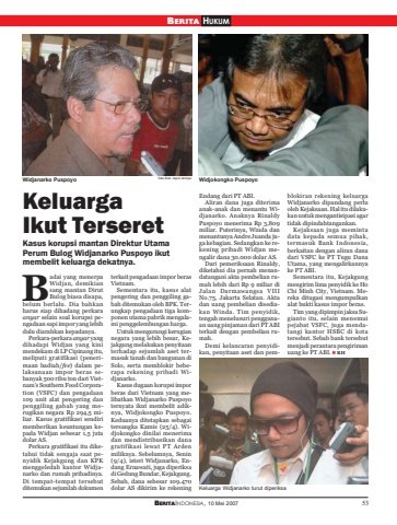 BERITAINDONESIA, 10 Mei 2007 53BERITA HUKUMKeluargaIkut TerseretKasus korupsi mantan Direktur UtamaPerum Bulog Widjanarko Puspoyo ikutmembelit keluarga dekatnya.adai yang menerpaWidjan, demikiansang mantan DirutBulog biasa disapa,belum berlalu. Dia bahkanharus siap dihadang perkaraanyar selain soal korupsi pengadaan sapi impor yang lebihdulu diarahkan kepadanya.Perkara-perkara anyar yangdihadapi Widjan yang kinimendekam di LP Cipinang itu,meliputi gratifikasi (penerimaan hadiah/fee) dalam pelaksanaan impor beras sebanyak 500 ribu ton dari Vietnam’s Southern Food Corporation (VSFC) dan pengadaan109 unit alat pengering danpenggiling gabah yang merugikan negara Rp 294,5 miliar. Kasus gratifikasi sendirimemberikan keuntungan kepada Widjan sebesar 1,5 jutadolar AS.Perkara gratifikasi itu diketahui tidak sengaja saat penyidik Kejakgung dan KPKmenggeledah kantor Widjanarko dan rumah pribadinya.Di tempat-tempat tersebutditemukan sejumlah dokumenterkait pengadaan impor berasVietnam.Sementara itu, kasus alatpengering dan penggiling gabah ditemukan oleh BPK. Terungkap pengadaan tiga komponen utama pabrik mengalami penggelembungan harga.Untuk mengurangi kerugiannegara yang lebih besar, Kejakgung melakukan penyitaanterhadap sejumlah aset termasuk tanah dan bangunan diSolo, serta memblokir beberapa rekening pribadi Widjanarko.Kasus dugaan korupsi imporberas dari Vietnam yang melibatkan Widjanarko Puspoyoternyata ikut membelit adiknya, Widjokongko Puspoyo.Keduanya ditetapkan sebagaitersangka Kamis (25/4). Widjokongko dinilai menerimadan mendistribusikan danagratifikasi lewat PT Ardenmiliknya. Sebelumnya, Senin(9/4), isteri Widjanarko, Endang Ernawati, juga diperiksadi Gedung Bundar, Kejakgung.Sebab, dana sebesar 109.470dolar AS dikirim ke rekeningEndang dari PT ABI.Aliran dana juga diterimaanak-anak dan menantu Widjanarko. Anaknya RinaldyPuspoyo menerima Rp 3,809miliar. Puterinya, Winda danmenantunya Andre Juanda juga kebagian. Sedangkan ke rekening pribadi Widjan mengalir dana 30.000 dolar AS.Dari pemeriksaan Rinaldy,diketahui dia pernah menandatangani akta pembelian rumah lebih dari Rp 9 miliar diJalan Darmawangsa VIIINo.75, Jakarta Selatan. Aktadan uang pembelian disediakan Winda. Tim penyidik,tengah menelusuri penggunaan uang pinjaman dari PT ABIterkait dengan pembelian rumah.Demi kelancaran penyidikan, penyitaan aset dan pemblokiran rekening keluargaWidjanarko dipandang perluoleh Kejaksaan. Hal itu dilakukan untuk mengantisipasi agartidak dipindahtangankan.Kejaksaan juga memintadata kepada semua pihak,termasuk Bank Indonesia,berkaitan dengan aliran danadari VSFC ke PT Tugu DanaUtama, yang mengalirkannyake PT ABI.Sementara itu, Kejakgungmengirim lima penyidik ke HoChi Minh City, Vietnam. Mereka ditugasi mengumpulkanalat bukti kasus impor beras.Tim yang dipimpin jaksa Sugianto itu, selain menemuipejabat VSFC, juga mendatangi kantor HSBC di kotatersebut. Sebab bank tersebutmenjadi perantara pengirimanuang ke PT ABI. RHBWidjanarko Puspoyo foto-foto: repro tempo Widjokongko PuspoyoKeluarga Widjanarko turut diperiksa