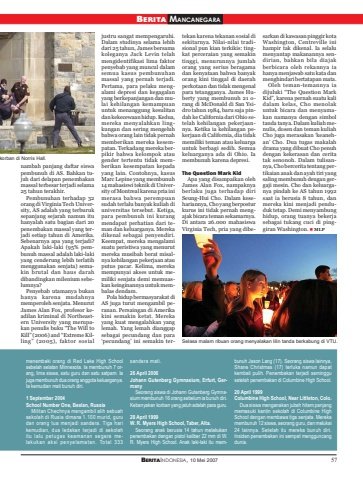 BERITAINDONESIA, 10 Mei 2007 57BERITA MANCANEGARAmenembaki orang di Red Lake High Schoolsebelah selatan Minnesota. Ia membunuh 7 orang, lima siswa, satu guru dan satu satpam. Iajuga membunuh dua orang anggota keluarganya.Ia kemudian mati bunuh diri.1 September 2004School Number One, Beslan, RussiaMilitan Chechnya mengambil alih sebuahsekolah di Rusia dimana 1.100 murid, gurudan orang tua menjadi sandera. Tiga harikemudian, dua ledakan terjadi di sekolahitu lalu petugas keamanan segera melakukan aksi penyelamatan. Total 333sandera mati.26 April 2006Johann Gutenberg Gymnasium, Erfurt, GermanySeorang siswa di Johann Gutenberg Gymnasium membunuh 16 orang sebelum ia bunuh diri.Kebanyakan korban yang jatuh adalah para guru.28 April 1999W. R. Myers High School, Taber, Alta.Seorang anak berusia 14 tahun melakukanpenembakan dengan pistol kaliber 22 mm di W.R. Myers High School. Anak laki-laki itu membunuh Jason Lang (17). Seorang siswa lainnya,Shane Christmas (17) terluka namun dapatkembali pulih. Penembakan terjadi seminggusetelah penembakan di Columbine High School.20 April 1999Columbine High School, Near Littleton, Colo.Dua siswa mengenakan jubah hitam panjangmemasuki kantin sekolah di Columbine HighSchool dengan membawa tiga senjata. Merekamembunuh 12 siswa, seorang guru, dan melukai24 lainnya. Setelah itu mereka bunuh diri.Insiden penembakan ini sempat mengguncangdunia.nambah panjang daftar siswapembunuh di AS. Bahkan tujuh dari delapan penembakanmassal terbesar terjadi selama25 tahun terakhir.Pembunuhan terhadap 32orang di Virginia Tech University, AS adalah yang terburuksepanjang sejarah namun ituhanyalah satu bagian dari 20penembakan massal yang terjadi setiap tahun di Amerika.Sebenarnya apa yang terjadi?Apakah laki-laki (95% pembunuh massal adalah laki-lakiyang cenderung lebih terlatihmenggunakan senjata) semakin brutal dan haus darahdibandingkan milenium sebelumnya?Penyebab utamanya bukanhanya karena mudahnyamemperoleh senjata. MenurutJames Alan Fox, profesor keadilan kriminal di Northeastern University yang merupakan penulis buku “The Will toKill” (2006) and “Extreme Killing” (2005), faktor sosialjustru sangat mempengaruhi.Dalam studinya selama lebihdari 25 tahun, James bersamakoleganya Jack Levin telahmengidentifikasi lima faktorpenyebab yang muncul dalamsemua kasus pembunuhanmassal yang pernah terjadi.Pertama, para pelaku mengalami depresi dan kegagalanyang berkepanjangan dan mulai kehilangan kemampuanuntuk menanggung kesulitandan kekecewaan hidup. Kedua,mereka menyalahkan lingkungan dan sering mengeluhbahwa orang lain tidak pernahmemberikan mereka kesempatan. Terkadang mereka berpikir bahwa kelompok ataugender tertentu tidak memberikan kesempatan kepadayang lain. Contohnya, kasusMarc Lepine yang membunuh14 mahasiswi teknik di University of Montreal karena pria inimerasa bahwa perempuansudah terlalu banyak kuliah diuniversitas tersebut. Ketiga,para pembunuh ini kurangmendapat perhatian dari teman dan keluarganya. Merekadikenal sebagai penyendiri.Keempat, mereka mengalamisuatu peristiwa yang menurutmereka musibah berat misalnya kehilangan pekerjaan atauputus pacar. Kelima, merekamempunyai akses untuk memiliki senjata demi memuaskan keinginannya untuk membalas dendam.Pola hidup bermasyarakat diAS juga turut mengambil peranan. Persaingan di Amerikakini semakin ketat. Merekayang kuat mengalahkan yanglemah. Yang lemah dianggapsebagai pecundang dan para‘pecundang’ ini semakin tertekan karena tekanan sosial disekitarnya. Nilai-nilai tradisional pun kian terkikis: tingkat perceraian yang semakintinggi, menurunnya jumlahorang yang serius beragamadan kenyataan bahwa banyakorang kini tinggal di daerahperkotaan dan tidak mengenalpara tetangganya. James Huberty yang membunuh 21 orang di McDonald di San Ysidro tahun 1984, baru saja pindah ke California dari Ohio setelah kehilangan pekerjaannya. Ketika ia kehilangan pekerjaan di California, dia tidakmemiliki teman atau keluargauntuk berbagi sedih. Semuakeluarganya ada di Ohio. Iamembunuh karena depresi.The Question Mark KidApa yang disampaikan olehJames Alan Fox, nampaknyaberlaku juga terhadap diriSeung-Hui Cho. Dalam kesehariannya, Cho yang berposturkurus ini tidak pernah mengajak bicara teman sekamarnya.Di antara 26.000 mahasiswaVirginia Tech, pria yang dibesarkan di kawasan pinggir kotaWashington, Centreville inihampir tak dikenal. Ia selalumenyantap makanannya sendirian, bahkan bila diajakberbicara oleh rekannya iahanya menjawab satu kata danmenghindari bertatapan mata.Oleh teman-temannya iadijuluki “The Question MarkKid”, karena pernah suatu kalidalam kelas, Cho menolakuntuk bicara dan menyamakan namanya dengan simboltanda tanya. Dalam kuliah menulis, dosen dan teman kuliahCho juga merasakan ‘keanehan’ Cho. Dua tugas makalahdrama yang dibuat Cho penuhdengan kekerasan dan ceritatak senonoh. Dalam tulisannya, Cho bercerita tentang pertikaian anak dan ayah tiri yangsaling membunuh dengan gergaji mesin. Cho dan keluarganya pindah ke AS tahun 1992saat ia berusia 8 tahun, danmereka kini menjadi penduduk tetap. Demi menyambunghidup, orang tuanya bekerjasebagai tukang cuci di pinggiran Washington. MLPkorban di Norris Hall.Selasa malam ribuan orang menyalakan lilin tanda berkabung di VTU.
