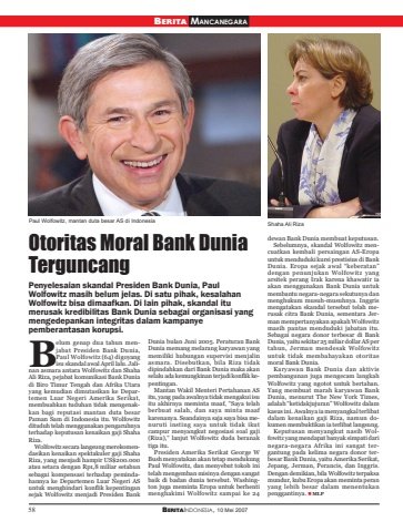 58 BERITAINDONESIA, 10 Mei 2007BERITA MANCANEGARAOtoritas Moral Bank DuniaTerguncangPenyelesaian skandal Presiden Bank Dunia, PaulWolfowitz masih belum jelas. Di satu pihak, kesalahanWolfowitz bisa dimaafkan. Di lain pihak, skandal itumerusak kredibilitas Bank Dunia sebagai organisasi yangmengedepankan integritas dalam kampanyepemberantasan korupsi.elum genap dua tahun menjabat Presiden Bank Dunia,Paul Wolfowitz (64) digoyangisu skandal awal April lalu. Jalinan asmara antara Wolfowitz dan ShahaAli Riza, pejabat komunikasi Bank Duniadi Biro Timur Tengah dan Afrika Utarayang kemudian dimutasikan ke Departemen Luar Negeri Amerika Serikat,membuahkan tuduhan tidak mengenakkan bagi reputasi mantan duta besarPaman Sam di Indonesia itu. Wolfowitzdituduh telah menggunakan pengaruhnyaterhadap keputusan kenaikan gaji ShahaRiza.Wolfowitz secara langsung merekomendasikan kenaikan spektakuler gaji ShahaRiza, yang menjadi hampir US$200.000atau setara dengan Rp1,8 miliar setahunsebagai kompensasi terhadap pemindahannya ke Departemen Luar Negeri ASuntuk menghindari konflik kepentingansejak Wolfowitz menjadi Presiden BankB Dunia bulan Juni 2005. Peraturan BankDunia memang melarang karyawan yangmemiliki hubungan supervisi menjalinasmara. Disebutkan, bila Riza tidakdipindahkan dari Bank Dunia maka akanselalu ada kemungkinan terjadi konflik kepentingan.Mantan Wakil Menteri Pertahanan ASitu, yang pada awalnya tidak mengakui isuitu akhirnya meminta maaf, “Saya telahberbuat salah, dan saya minta maafkarenanya. Seandainya saja saya bisa menuruti insting saya untuk tidak ikutcampur menyangkut negosiasi soal gaji(Riza),“ lanjut Wolfowitz duda beranaktiga itu.Presiden Amerika Serikat George WBush menyatakan akan tetap mendukungPaul Wolfowitz, dan menyebut tokoh initelah mengemban misinya dengan sangatbaik di badan dunia tersebut. Washington juga meminta Eropa untuk berhentimenghakimi Wolfowitz sampai ke 24dewan Bank Dunia membuat keputusan.Sebelumnya, skandal Wolfowitz mencuatkan kembali persaingan AS-Eropauntuk menduduki kursi prestisius di BankDunia. Eropa sejak awal “keberatan”dengan penunjukan Wolfowitz yangarsitek perang Irak karena khawatir iaakan menggunakan Bank Dunia untukmembantu negara-negara sekutunya danmenghukum musuh-musuhnya. Inggrismengatakan skandal tersebut telah merusak citra Bank Dunia, sementara Jerman mempertanyakan apakah Wolfowitzmasih pantas menduduki jabatan itu.Sebagai negara donor terbesar di BankDunia, yaitu sekitar 25 miliar dollar AS pertahun, Jerman mendesak Wolfowitzuntuk tidak membahayakan otoritasmoral Bank Dunia.Karyawan Bank Dunia dan aktivispembangunan juga mengecam langkahWolfowitz yang ngotot untuk bertahan.Yang membuat marah karyawan BankDunia, menurut The New York Times,adalah “ketidakjujuran” Wolfowitz dalamkasus ini. Awalnya ia menyangkal terlibatdalam kenaikan gaji Riza, namun dokumen membuktikan ia terlibat langsung.Keputusan menyangkut nasib Wolfowitz yang mendapat banyak simpati darinegara-negara Afrika ini sangat tergantung pada kelima negara donor terbesar Bank Dunia, yaitu Amerika Serikat,Jepang, Jerman, Perancis, dan Inggris.Dengan demikian, bila Wolfowitz terpaksamundur, kubu Eropa akan meminta peranyang lebih besar dalam menentukanpenggantinya. MLPPaul Wolfowitz, mantan duta besar AS di Indonesia Shaha Ali Riza