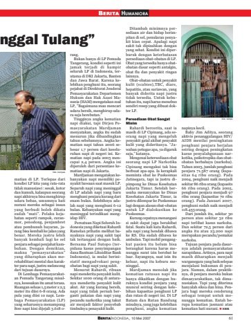 BERITAINDONESIA, 10 Mei 2007 61BERITA HUMANIORAnggal Tulang”matian di LP. Terlepas darikondisi LP kita yang rata-ratatidak manusiawi : sesak, kotordan kumuh, kalaupun seorangnapi akhirnya bisa menghirupudara bebas, umumnya hatinurani mereka sebagai insanyang berbudi boleh dikatasudah “mati”. Pelaku kejahatan seperti rampok, curanmor, penodong, penjambretatau pembunuh bayaran, jarang bisa kembali ke jalan yangbenar. Mereka justru lebihbanyak kembali lagi ke selpenjara sebagai penjahat kambuhan. Dengan demikian,makna “pemasyarakatan”yang diharapkan akan merehabilitasi mental dan karakter para napi, justru melencengdari tujuan dasarnya.Di Lembaga Pemasyarakatan Pemuda Tangerang misalnya, kesesakan itu amat terasa.Ruangan seluas 1,5 meter x 2,5meter itu diisi 6-8 orang. Adapula yang diisi 10 napi. Lembaga Pemasyarakatan (LP)yang seharusnya menampung800 napi kini dijejali 3.618 orang.Bukan hanya di LP PemudaTangerang, kondisi seperti inijamak terjadi di hampirseluruh LP di Indonesia, terutama di DKI Jakarta, Bantendan Jawa Barat. Karena kelebihan penghuni itu, seorangpejabat di Direktorat JenderalPemasyarakatan DepartemenHukum dan Hak Azasi Manusia (HAM) mengatakan soalLP, ”Bagaimana mau mencariudara bersih, menghirup udara saja berebutan.”Tingginya angka kematiannapi diakui, tapi Dirjen Pemasyarakatan Mardjamanmenyatakan, angka itu sudahmenurun jika dibandingkantahun sebelumnya. Angka kematian napi tahun 2006 sebesar 1,7 persen dari keseluruhan napi di negeri ini. Kematian napi pada 2005 mencapai 2,4 persen. Angka inidiperoleh dari persentase kematian napi di Jakarta.Mardjaman mengatakan kebanyakan napi memiliki penyakit bawaan saat masuk LP.Separuh napi yang meninggaldi LP adalah napi yang barumenghuni penjara kurang darienam bulan. Selebihnya adalah napi yang menghuni 6-12bulan. Kebanyakan napi yangmeninggal terindikasi mengidap HIV. Persatuan Napi Seluruh Indonesia yang diketuai RahardiRamelan prihatin melihat banyaknya napi yang sakit tapitak tertangani dengan baik.Bersama Paul Sutopo (terpidana kasus penyimpangandana Bantuan Likuiditas BankIndonesia), ia mulai berinisiatif mengadvokasi pengobatan bagi napi yang sakit.Menurut Rahardi, ribuannapi menderita penyakit kulit.Sekitar 1000 orang di antaranya menderita penyakit kulitakut. Air yang kurang bersih,napi yang tidak pernah berganti pakaian dan napi yangpecandu narkotika yang takutair menjadi faktor penyebabtimbulnya penayakit kulit.Ditambah minimnya persediaan air dan hidup berimpitan di sel, penularan penyakit kian cepat. Apalagi napisakit tak dipisahkan denganyang sehat. Kondisi ini diperburuk dengan keterbatasanpersediaan obat-obatan di LP.Obat yang tersedia hanya obatobatan dasar seperti antalgin,obat flu dan penyakit ringanlainnya.Obat-obatan untuk penyakitkulit (scabies),TBC, diare,hepatitis, atau sariawan, yangbanyak diderita napi justrutidak tersedia. Untuk kebutuhan itu, napi harus menebussendiri resep yang dibuat dokter LP.Persediaan Obat SangatMinimRahardi bercerita, saat iamasih di LP Cipinang, ada seorang napi yang mengeluhpenyakit gatal akibat penyakitkulit yang dideritanya. “Jawaban petugas apa, ya digaruksaja,” katanya.Mengenai ketersediaan obatseorang napi LP NarkotikaCipinang mengakui tak bisaberbuat apa-apa. Ia kerapkalimeminta obat ke PuskesmasJatinegara, tapi ia justru dipimpong ke Dinas KesehatanJakarta Timur. Setelah berusaha menanyakan ke DinasKesehatan Jakarta Timur, iajustru dilempar ke Puskesmaslagi dengan alasan obat-obatanuntuk LP dialokasikan kePuskesmas.Kurang cepatnya menanganisi sakit dapat juga berakibatfatal. Suatu kali kata Rahardi,ada napi yang hendak dibawake RS. Dia sudah dibawa keambulan. Tapi mobil pengangkut pasien itu belum bisaberangkat karena harus menunggu surat izin berobat keluar. Sayangnya, saat izin itukeluar, napi itu keburu meninggal.Mardjaman menolak jikakematian ratusan napi ituhanya dikaitkan dengan buruknya kondisi penjara yangmuncul seiring dengan kelebihan kapasitas penghuni LPdan rutan di negeri ini. Di LPBatam dan Rutan Bandungmisalnya, yang juga kelebihanpenghuni, angka kematiannapinya kecil.Baby Jim Aditya, seorangaktivis penanggulangan HIV/AIDS menilai peningkatanpenghuni penjara berjalanseiring dengan peningkatankasus penyalahgunaan narkotika, psikotropika dan obatobatan berbahaya (narkoba).Tahun 2003, jumlah penghunipenjara 71.587 orang (kapasitas 64 ribu orang). Pada2004, penghuni naik menjadisekitar 86 ribu orang (kapasits66 ribu orang). Pada 2005,penghuni penjara menjadi 97ribu orang (kapasitas 70 ribuorang). Pada Januari 2007,penghuni sudah naik menjadi118.453 orang.Dari jumlah itu, sekitar 30persen atau sekitar 32 ribunapi terlibat kasus narkoba.Dan sekitar 72,5 persen dariangka itu atau 23.200 napimerupakan pecandu/pemakainarkoba.Tujuan penjara pada dasarnya adalah pemasyarakatannarapidana. Artinya, para napimasih diharapkan menjadiwarganegara yang baik selepasmenjalani hukuman di penjara. Namun, dalam praktiknya, di penjara mereka bukandimasyarakatkan, tak dimanusiakan. Tapi yang diterimahanyalah siksa dan hina. Penjara bagi mereka cenderungsebagai tempat untuk menunggu kematian. Entah berupa kematian jasmani ataukematian hati nurani. SBRfoto: kompasfoto: tempo