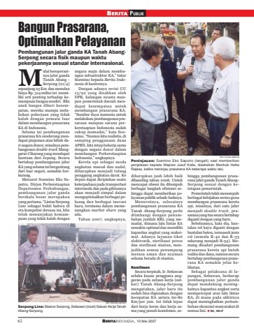 62 BERITAINDONESIA, 10 Mei 2007BERITA PUBLIKBangun Prasarana,Optimalkan PelayananPembangunan jalur ganda KA Tanah AbangSerpong secara fisik maupun waktupekerjaannya sesuai standar internasional.ulai beroperasinya jalur gandaTanah Abang -Serpong (21/4)sepanjang 23 Km dan menelanbiaya Rp. 314 miliar ini memiliki arti penting terhadap kemampuan bangsa sendiri. Bilaanak bangsa diberi kesempatan, mereka mampu melakukan pekerjaan yang tidakkalah dengan pemain luardalam membangun prasaranaKA di Indonesia.Selama ini pembangunanprasarana KA cenderung mendapat pinjaman atau hibah dari negara donor, misalnya pembangunan double track Manggarai-Cikarang yang mendapatbantuan dari Jepang. Secarabertahap pembangunan jalurKA yang selama ini bergantungdari luar negeri, semakin berkurang.Menurut Soemino Eko Saputro, Dirjen PerkeretaapianDepartemen Perhubungan,pembangunan jalur gandaberskala besar merupakanyang pertama. “Lintas SerpongLine sebagai bukti bahwa diera kompetisi dewasa ini, kitatelah menunjukan kemampuan yang tidak kalah dengannegara maju dalam membangun infrastruktur KA,” tuturSoemino kepada Berita Indonesia di kantornya.Dengan adanya revisi UU13/92 yang disahkan olehDPR, kalangan swasta maupun pemerintah daerah mendapat kesempatan untukmembangun prasarana KA.”Sumber daya manusia untukmelakukan pembangunan prasarana maupun sarana perkeretaapian Indonesia sudahcukup memadai,” kata Soemino. “Namun kita realistis, disamping penggunaan danaAPBN, kita tetap bekerja samadengan negara donor dalammembangun PerkeretaapianIndonesia,” ungkapnya.Kereta api sebagai modaangkutan massal dan andal,diharapkan menjadi tulangpunggung angkutan darat. Kedepan dapat diciptakan suatuketerpaduan pada transportasiintermoda dan pada gilirannyaakan menjadi simpul dalammengoptimalkan berbagai peluang dan berbagai inovasibaru, terutama dalam memenangkan market share yangada.Tahun 2007, ungkapnya,Serpong Line: Stasiun Serpong, Setiawan (inzet) Satuan Kerja TanahAbang-Serpong.foto: berindo samsuriMdiharapkan jauh lebih baikdibanding tahun 2006. Untukmencapai obsesi itu ditempuhberbagai langkah efisiensi sehingga dapat memberikan pelayanan publik sebaik-baiknya.Menurutnya, selesainyapembangunan prasarana KATanah Abang-Serpong perludiimbangi dengan penambahan jumlah KRL yang memadai, dimana lalu lintas KAsemakin optimal dan memilikikapasitas angkut yang maksimal. Adanya layanan tiketelektronik, sterilisasi perondan sterilisasi stasiun, menjadikan semua penumpangmerasa aman dan nyamanselama berada di stasiun.KomitmenSecara terpisah, Ir. Setiawanselaku kuasa pengguna anggaran pada satuan kerja (satker) Tanah Abang-Serpongmengatakan, jalur baru itusudah bisa digunakan dengankecepatan KA antara 60-80Km/per jam. Ini tidak lepasdari kerja keras dan kerja sama yang penuh komitmen, sePeninjauan: Soemino Eko Saputro (tengah) saat memberikanpenjelasan kepada Wapres Jusuf Kalla, disaksikan Menhub HattaRajasa, ketika meninjau prasarana KA beberapa waktu lalu.foto: humas dephubhingga pembangunan prasarana jalur ganda Tanah AbangSerpong sesuai dengan ketetapan pemerintah.Pemerintah telah menempuhberbagai kebijakan serius gunamembangun prasarana keretaapi, misalnya, dari satu jalurmenjadi double track, prasarana yang tua secara bertahapdiganti dengan yang baru.Sebelumnya, kata dia, bantalan rel kayu diganti denganbantalan beton, termasuk jenisrel (semula R-42 dan R-33sekarang menjadi R-54). Memang disadari pembangunanprasarana kereta api butuhwaktu dan dana, namun secarabertahap pembangunan prasarana KA semakin jelas kelihatan.Sebagai pelaksana di lapangan, Setiawan, berharappembangunan jalur gandadapat mendukung meningkatnya kapasitas angkut sertamempercepat arus lalu lintasKA, di mana pada akhirnyadapat meningkatkan pertumbuhan ekonomi masyarakat disemua lini. RI, MLP