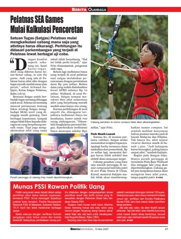 BERITAINDONESIA, 10 Mei 2007 65BERITA OLAHRAGAPelatnas SEA GamesMulai Kalkulasi PencoretanMunas PSSI Rawan Politik UangPolitik uang amat rawan terjadi dalam setiappemilihan calon ketua sebuah organisasi,termasuk PSSI. Guna mencegah terjadinyapraktek kotor tersebut, Panitia MusyawarahNasional PSSI di Makassar Sulawesi Selatan,19-21 April lalu telah melakukan berbagaiupaya.Salah satunya dengan verifikasi formulirpengajuan calon ketua umum dan komiteeksekutif. Selanjutnya, pembatasan money politics dilakukan dengan mengedepankan aturanpemilihan lewat tata tertib munas yang disesuaikan dengan Pedoman Dasar baru berdasar Statuta FIFA.“Apapun hasil munas nanti harus diterima.Kalau memang hanya ada satu calon yangmuncul jangan langsung alergi karena samasekali tidak ada niat kami untuk merekayasa,“kata Nugraha Besus, Rabu (18/4).Seorang calon baru bisa maju ke pencalonansetelah mendapat dukungan minimal 125 suara.Selanjutnya para calon harus memenuhi kriteriaumum dan verifikasi dari Komite PelaksanaMunas PSSI, baru bisa masuk dalam pemilihantahap pertama.Jika ada satu calon, dia akan terpilih secaraaklamasi. Tapi jika lebih, akan diambil dua oranguntuk masuk dalam tahap berikutnya, kecualisalah satu calon berhasil meraih 50 persen suaraplus satu. SBRengan kondisiseperti sekarang ini, kamiharus tegas.Atlet yang dikirim harus benar-benar cakap, to win thegame. Jadi yang ada di Pelatnas harus atlet elite dengantugas meraih medali emas atauperak,” sebut Achmad Sutjipto, Ketua Satgas Pelatnas,Rabu (18/5).Rencana Satgas untuk bertindak tegas memang ditunggusejak awal. Selama ini memangmuncul pertanyaan tentangfokus strategi Satgas menghadapi SEAG 2007 yang dianggap masih gamang. Dariberbagai keputusan, tampaksatgas tidak fokus kepada olahragawan yang berpeluang meraih emas. Tapi juga mengakomodasi atlet yang samasekali tidak berpeluang. “Halini tidak perlu terjadi,” ujarFritz Simanjuntak, pengamatolah raga.Belum lagi inefisiensi biayayang terjadi di awal pelatnassaat satgas melakukan perencanaan dengan permintaandana Rp 300 miliar. Bukandana yang sudah dialokasikanlewat APBN sebesar Rp 70miliar. Walhasil, di awal Pelatnas, Satgas sempat merekrut 800 atlet sementaraatlet yang berpeluang meraihmedali emas hanya 100 orang.Karena perhitungan di awalseperti itu, ditengarai terjadinya inefisiensi biaya teskesehatan, honor untuk 700orang olahragawan. “Ditambah bengkaknya personel Satgas, diperkirakan inefisiensibiaya mencapai sekitar Rp5miliar,” ujar Fritz.Fisik Masih LemahKarena itu, di momen pertama validasi, Satgas mulaimemainkan tongkat tegasnya.Apalagi berita turunnya danatambahan dari pemerintah, Rp70 miliar lagi, menuntut Satgas harus lebih selektif danefektif demi mencapai target.Cabang panahan yang barusaja meraih perunggu di nomor compound individu putridi seri Piala Dunia di Ulsan,Korsel, menurut Sutjipto malah tidak akan memberangkatkan nomor compun. Inisetelah melihat kenyataanbahwa prestasi mereka jauh dibawah Malaysia dan Filipina.Tak hanya itu, atlet nomorrecurve skornya masih di bawah 1.300. “Jadi kalaupunharus berangkat, paling hanyaempat atlet,” tambah Sutjipto.Begitu pula dengan tinju.Hanya peraih perunggu diturnamen Piala Raja Thailanddua mingggu lalu yang akandipertimbangkan. Cabang gulat pun tampaknya hanya akanmengirim lima atlet putra,tanpa pegulat putri. SBRSatuan Tugas (Satgas) Pelatnas mulaimengkalkulasi cabang mana saja yangatletnya harus dikurangi. Perhitungan itudidasari perkembangan yang terjadi diPelatnas lewat berbagai uji coba.“DPeraih perunggu di cabang tinju masih dipertimbangkan.Cabang panahan di nomor compun tidak akan diberangkatkan.