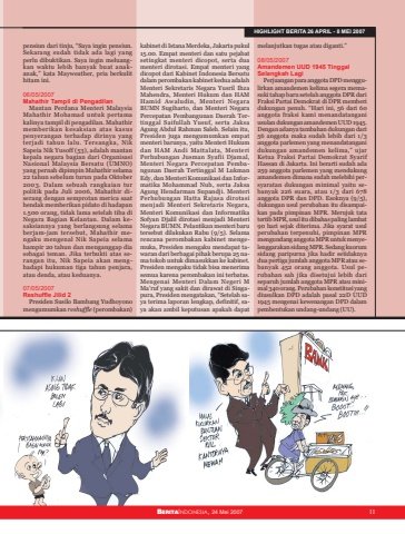 BERITAINDONESIA, 24 Mei 2007 11HIGHLIGHT BERITA 26 APRIL - 8 MEI 2007pensiun dari tinju, “Saya ingin pensiun.Sekarang sudah tidak ada lagi yangperlu dibuktikan. Saya ingin meluangkan waktu lebih banyak buat anakanak,” kata Mayweather, pria berkulithitam ini.06/05/2007Mahathir Tampil di PengadilanMantan Perdana Menteri MalaysiaMahathir Mohamad untuk pertamakalinya tampil di pengadilan. Mahathirmemberikan kesaksian atas kasuspenyerangan terhadap dirinya yangterjadi tahun lalu. Tersangka, NikSapeia Nik Yusoff (53), adalah mantankepala negara bagian dari OrganisasiNasional Malaysia Bersatu (UMNO)yang pernah dipimpin Mahathir selama22 tahun sebelum turun pada Oktober2003. Dalam sebuah rangkaian turpolitik pada Juli 2006, Mahathir diserang dengan semprotan merica saathendak memberikan pidato di hadapan1.500 orang, tidak lama setelah tiba diNegara Bagian Kelantan. Dalam kesaksiannya yang berlangsung selamaberjam-jam tersebut, Mahathir mengaku mengenal Nik Sapeia selamahampir 20 tahun dan menganggap diasebagai teman. Jika terbukti atas serangan itu, Nik Sapeia akan menghadapi hukuman tiga tahun penjara,atau denda, atau keduanya.07/05/2007Reshuffle Jilid 2Presiden Susilo Bambang Yudhoyonomengumumkan reshuffle (perombakan)kabinet di Istana Merdeka, Jakarta pukul15.00. Empat menteri dan satu pejabatsetingkat menteri dicopot, serta duamenteri dirotasi. Empat menteri yangdicopot dari Kabinet Indonesia Bersatudalam perombakan kabinet kedua adalahMenteri Sekretaris Negara Yusril IhzaMahendra, Menteri Hukum dan HAMHamid Awaludin, Menteri NegaraBUMN Sugiharto, dan Menteri NegaraPercepatan Pembangunan Daerah Tertinggal Saifullah Yusuf, serta JaksaAgung Abdul Rahman Saleh. Selain itu,Presiden juga mengumumkan empatmenteri barunya, yaitu Menteri Hukumdan HAM Andi Mattalata, MenteriPerhubungan Jusman Syafii Djamal,Menteri Negara Percepatan Pembangunan Daerah Tertinggal M LukmanEdy, dan Menteri Komunikasi dan Informatika Mohammad Nuh, serta JaksaAgung Hendarman Supandji. MenteriPerhubungan Hatta Rajasa dirotasimenjadi Menteri Sekretaris Negara,Menteri Komunikasi dan InformatikaSofyan Djalil dirotasi menjadi MenteriNegara BUMN. Pelantikan menteri barutersebut dilakukan Rabu (9/5). Selamarencana perombakan kabinet mengemuka, Presiden mengaku mendapat tawaran dari berbagai pihak berupa 25 nama tokoh untuk dimasukkan ke kabinet.Presiden mengaku tidak bisa menerimasemua karena perombakan ini terbatas.Mengenai Menteri Dalam Negeri MMa’ruf yang sakit dan dirawat di Singapura, Presiden mengatakan, “Setelah saya terima laporan lengkap, definitif, saya akan ambil keputusan apakah dapatmelanjutkan tugas atau diganti.”08/05/2007Amandemen UUD 1945 TinggalSelangkah LagiPerjuangan para anggota DPD menggulirkan amandemen kelima segera memasuki tahap baru setelah anggota DPR dariFraksi Partai Demokrat di DPR memberidukungan penuh. “Hari ini, 56 dari 60anggota fraksi kami menandatanganiusulan dukungan amandemen UUD 1945.Dengan adanya tambahan dukungan dari56 anggota maka sudah lebih dari 1/3anggota parlemen yang menandatanganidukungan amandemen kelima,” ujarKetua Fraksi Partai Demokrat SyarifHassan di Jakarta. Ini berarti sudah ada259 anggota parlemen yang mendukungamandemen dimana sudah melebihi persyaratan dukungan minimal yaitu sebanyak 226 suara, atau 1/3 dari 678anggota DPR dan DPD. Esoknya (9/5),dukungan usul perubahan itu disampaikan pada pimpinan MPR. Merujuk tatatertib MPR, usul itu dibahas paling lambat90 hari sejak diterima. Jika syarat usulperubahan terpenuhi, pimpinan MPRmengundang anggota MPR untuk menyelenggarakan sidang MPR. Sedang kuorumsidang paripurna jika hadir setidaknyadua pertiga jumlah anggota MPR atau sebanyak 452 orang anggota. Usul perubahan sah jika disetujui lebih dariseparuh jumlah anggota MPR atau minimal 340 orang. Perubahan konstitusi yangdiusulkan DPD adalah pasal 22D UUD1945 mengenai kewenangan DPD dalampembentukan undang-undang (UU).