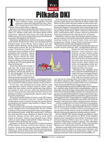 BERITAINDONESIA, 24 Mei 2007 13V ISIBERITAPilkada DKIak pelak lagi, Gubernur Sutiyoso yang melangkahturun Oktober nanti, meninggalkan banyakpekerjaan rumah (PR) bagi gubernur baru. Pemilihan langsung pertama Kepala Daerah KhususIbukota Jakarta dijadwalkan, 8 Agustus.Sutiyoso memimpin pemerintahan DKI Jakarta selama 10tahun sejak 1997, di bawah lima Presiden: Soeharto (1997-1998), B.J. Habibie (1998-1999), KH Abdurrahman Wahid(1999-2001), Megawati (2001-2004), dan Susilo BambangYudhoyono (2004-2009). Itulah salah satunya keistimewaanyang patut dibanggakan oleh Sutiyoso.Seperti para pendahulunya, Sutiyoso tak banyak mengubahwajah Jakarta. Wajah the big village, kecuali puluhan gedungpencakar langit, Taman Monas, Taman Impian Jaya, danterakhir Taman Menteng, masih garang, kumuh dan dekil.Gubuk-gubuk kumuh dan liar berhimpitan di bantaransungai. Pemukiman kumuh jugaberhimpitan hanya puluhan meter dipunggung jalan protokol, sepertiMH. Thamrin, Sudirman, GajahMada, Hayam Wuruk dan GatotSubroto. Juga para tunawisma membangun kehidupan di kolong-kolongjembatan dan di gubuk-gubuk liardekat rel kereta api.Di kolong-kolong jalan layang, dikaki lima, dan di pasar-pasar berkumpul para pengemis, pengamen,pemulung, tukang ojek sepeda motor dan penganggur. Di atas keretaapi listrik (KRL), setiap hari, diantara penumpang yang berdesakanmenyelinap para pengemis, pengamen, pemulung gelas plastik dan pedagang asong. Mereka menjalani kehidupan seharihari yang berat di Jakarta dengan mengais rezeki seadanya.Di sisi lain, ada sejumlah kecil warga Jakarta yangberpenghasilan ratusan, bahkan miliaran rupiah, sehari.Setiap hari atau malam, mereka membuang uang puluhanjuta rupiah di mall, restoran, hotel dan tempat hiburanmewah. Dunia gemerlap yang tampil di dalam sinetron dankehidupan selebritis, menggambarkan Jakarta seakan “sorga”bagi para penghuninya.Jurang kaya-miskin melebar di antara warga DKI Jakartayang ditaksir berjumlah 9 juta jiwa. Jumlah warga bisamembengkak sampai 11 juta jiwa di siang hari, karena Jakartamenampung para pekerja yang berdiam di Bogor, Depok,Bekasi dan Tangerang.Jutaan pekerja yang membanjiri Jakarta dari Senin sampaiJum’at, sebagian besar menumpang KRL dan bus. Namunjumlahnya hampir seimbang dengan mereka yang menggunakan kendaraan pribadi—mobil dan sepeda motor. Tak heranjika pada hari-hari kerja, lalulintas di Jakarta macet dansemrawut. Sebagai contoh, tahun 1980-an, jarak antaraDepok ke Harmoni, Jakarta, bisa ditempuh hanya dalamwaktu 30 menit dengan mobil pribadi. Tetapi sekarang, diperlukan waktu tak kurang dari 2,5 jam.Karenanya, Sutiyoso merancang Pola Tranportasi Makro(PTM) Jakarta—busway, monorel dan subway. Kecualibusway—monorel dan subway tak sempat ditangani olehSutiyoso. Di dalam konsep PTM, Sutiyoso juga berencanamembangun terminal dan stasiun transit bagi mobil-mobilpribadi dari beberapa gerbang masuk ke Jakarta.Di musim hujan, Jakarta dibayang-bayangi ancaman banjirkiriman akibat luapan Kali Ciliwung di sektor tengah, KaliBekasi di sektor timur dan Kali Cisadane di sektor barat. Sutiyoso mengalami trauma akibat luapan sungai-sungai tersebutbersamaan dengan turunnya hujan deras yang menggenangi60% wilayah Jakarta, awal Februari. Sutiyoso bergegas membangun Banjir Kanal Timur (BKT). Tetapi baru seperempatjalan, pembangunan BKT terhenti lantaran pembebasantanah yang bermasalah dan digerogoti virus manipulasi.Selebihnya, Sutiyoso ingin mewujudkan gagasan pembangunan underground tunnel alias tandon raksasa untuk menampung luapan air di musim hujan. Kerja sama pembangunannya dirintis dengan Bank Pembangunan Islam.Masih banyak lagi PR yang ditinggalkan Sutiyoso.Persoalan-persoalan tersebut menyongsong siapa pun yangterpilih menjadi gubernur DKI, menggantikan Sutiyoso.Sampai saat ini, empat bakal calongubernur sudah muncul ke permukaan, mereka bahkan sudahmemulai kampanye terselubung.Mereka; Adang Daradjatun, FauziBowo dan Sarwono Kusumaatmadjadan Letjen (Pur) Agum Gumelar. Diantara mereka, hanya Adang yangsudah merampungkan tahap persiapan pencalonan bersama Cawagub dari PKS, Dani Anwar.Sedangkan Foke, panggilan akrabFauzi, masih bermasalah dengan Cawagub. Sarwono menunggu kepastian dan kecukupan dukungan dariPAN, PKB dan sejumlah partai gurem. Karena itu, peluang Letjen (Pur) Agum Gumelar untukjadi Balon Gubernur DKI, bangkit kembali. Sarwono dirancang oleh PAN berduet dengan Jeffrie Govani. SedangkanAgum dirancang PKB berduet dengan Rano Karno.Di tengah kemelut pencalonan Pilkada DKI, muncul gagasandari sejumlah pakar politik untuk mengedepankan calon independen. Ide ini disorong ke Departemen Dalam Negeri olehForum Betawi Rembug (FBR) yang berniat mengajukan pucukpimpinannya KH Fadholi El Munir sebagai Cagub independen.Dipandang dari logika politik dan demokrasi, gagasan tersebutmemang masuk akal. Tetapi logika itu menjadi mentah di tangan DPR yang punya hak legislasi yang seolah-olah tidak bisadicampuri oleh siapa pun, bahkan oleh pemerintah sekali pun.Anehnya sampai saat ini, Pansus DPR belum merampungkan revisi UU (Nomor 34/1999) tentang PemerintahanDaerah Khusus Ibukota Negara Republik Indonesia. PadahalUU ini merupakan landasan hukum penyelenggaraanpemerintahan di DKI Jakarta. Boleh jadi Pilkada DKI harusditunda menunggu pengesahan undang-undang tersebut.Jadwal Pilkada DKI dimulai dengan pendaftaran bakalcalon gubernur/wakil gubernur ke KPUD untuk disahkanmenjadi calon, sampai batas waktu 28 Mei. Kemudian disusuljadwal kampanye Pilkada dari Juni sampai Juli. Haripemilihan dijadwalkan tanggal 8 Agustus. Dan pelantikangubernur/wakil gubernur terpilih, sekitar pertengahanOktober 2007. Namun jadwal ini rentan untuk diubah.Meskipun warga tidak terlalu antusias menyambut Pilkadalangsung pertama, Jakarta ke depan harus dipimpin olehgubernur yang berpihak pada kepentingan warga, sepertilapangan kerja dan usaha, kesehatan dan pendidikan. Tilustrasi: dendy